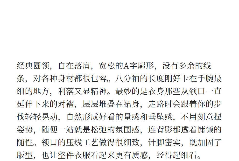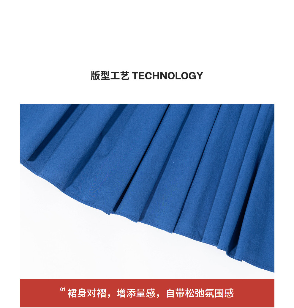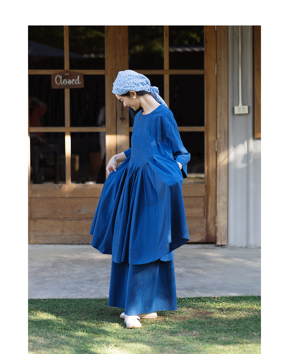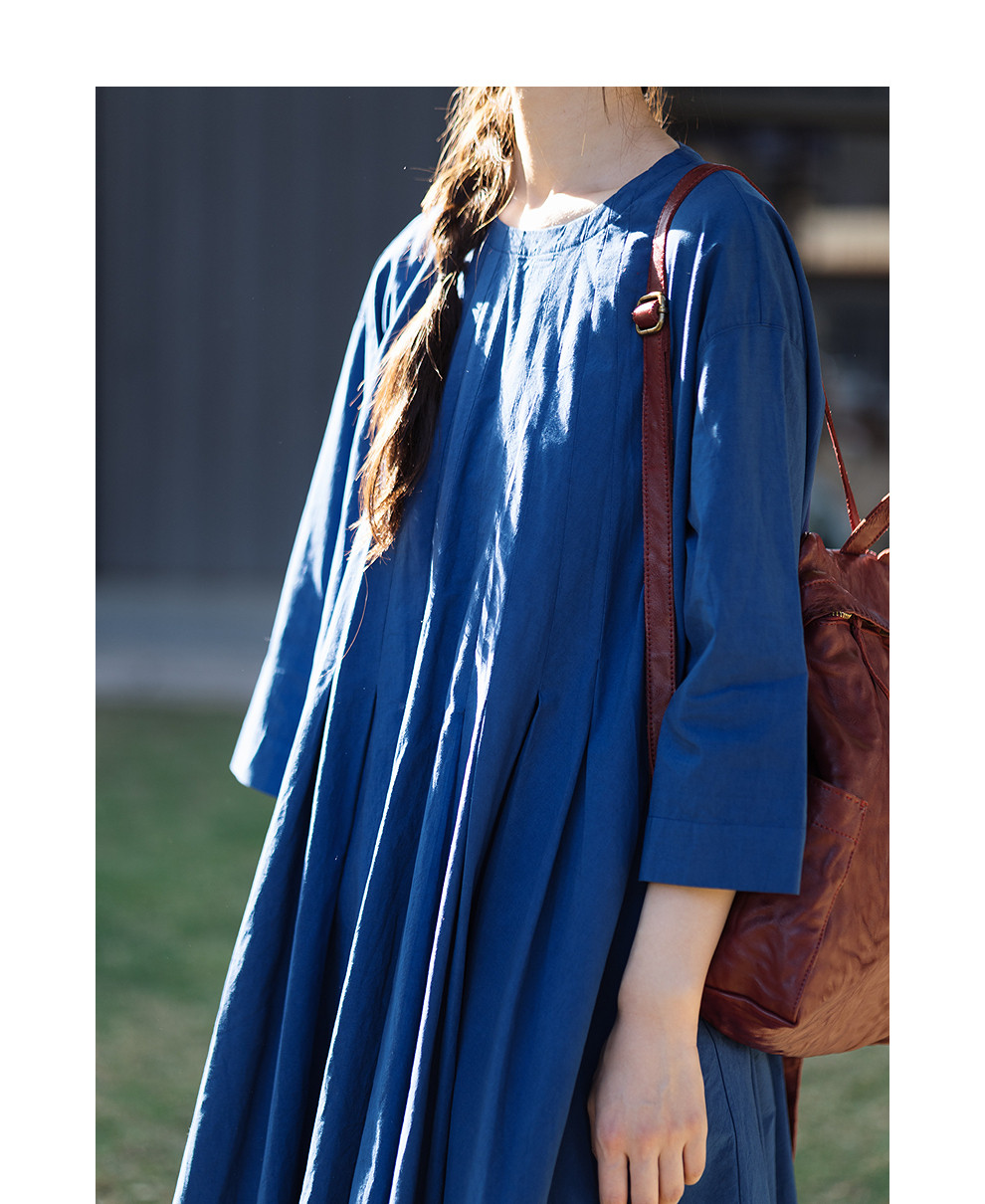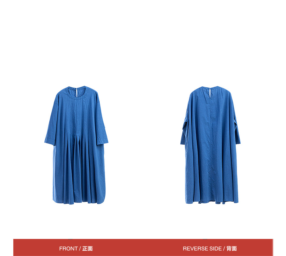 绽放096朵/影后*亚麻棉宽松压褶大摆休闲度假圆领七分袖连衣裙夏