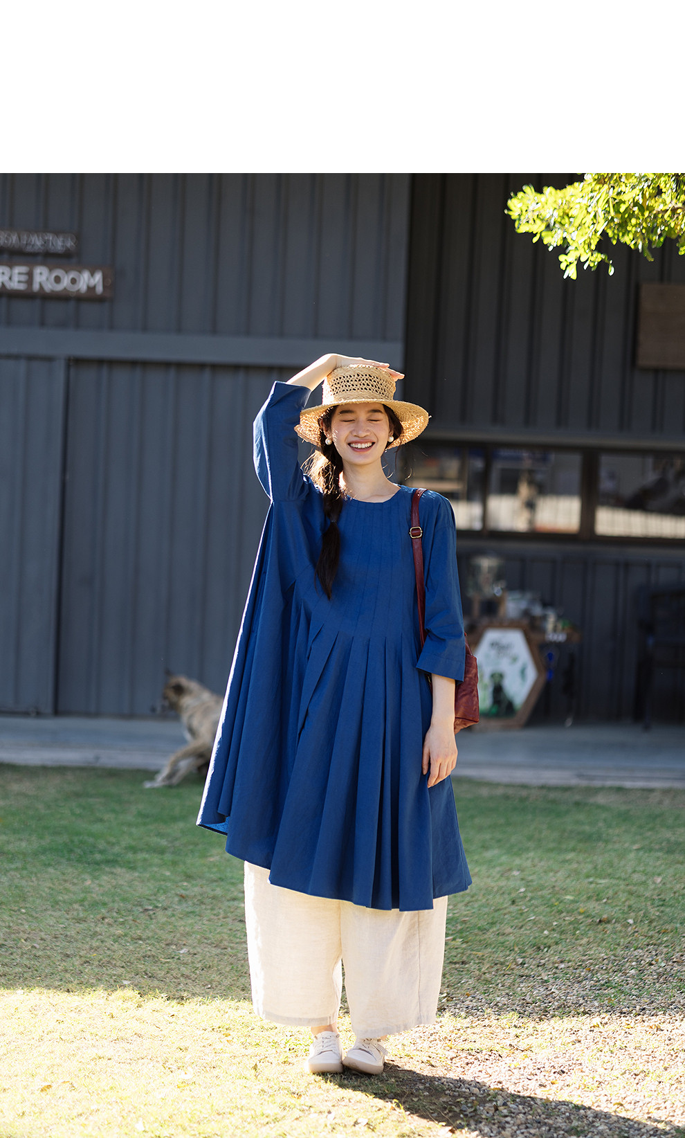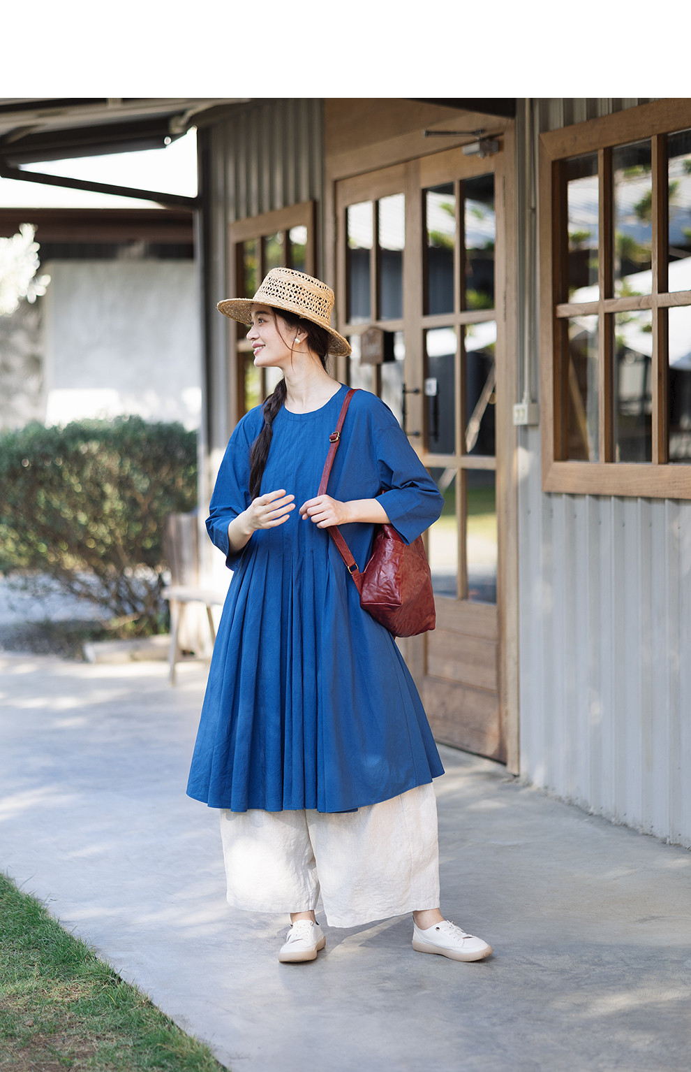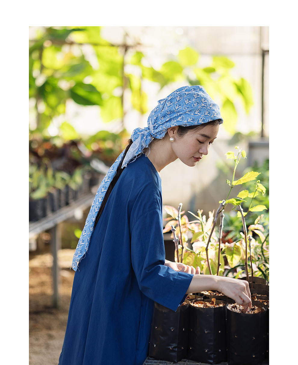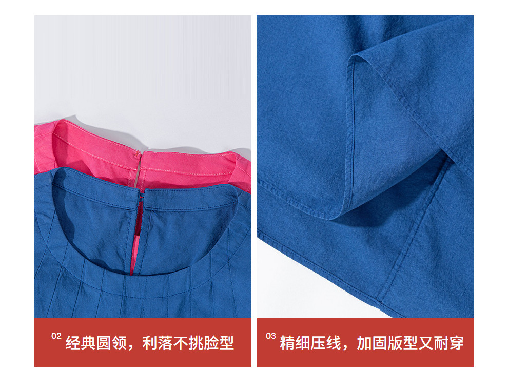 绽放096朵/影后*亚麻棉宽松压褶大摆休闲度假圆领七分袖连衣裙夏