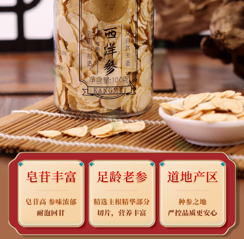 康美生活西洋参片100g/罐 花旗参片泡水煲汤含片直径1.0-1.4cm