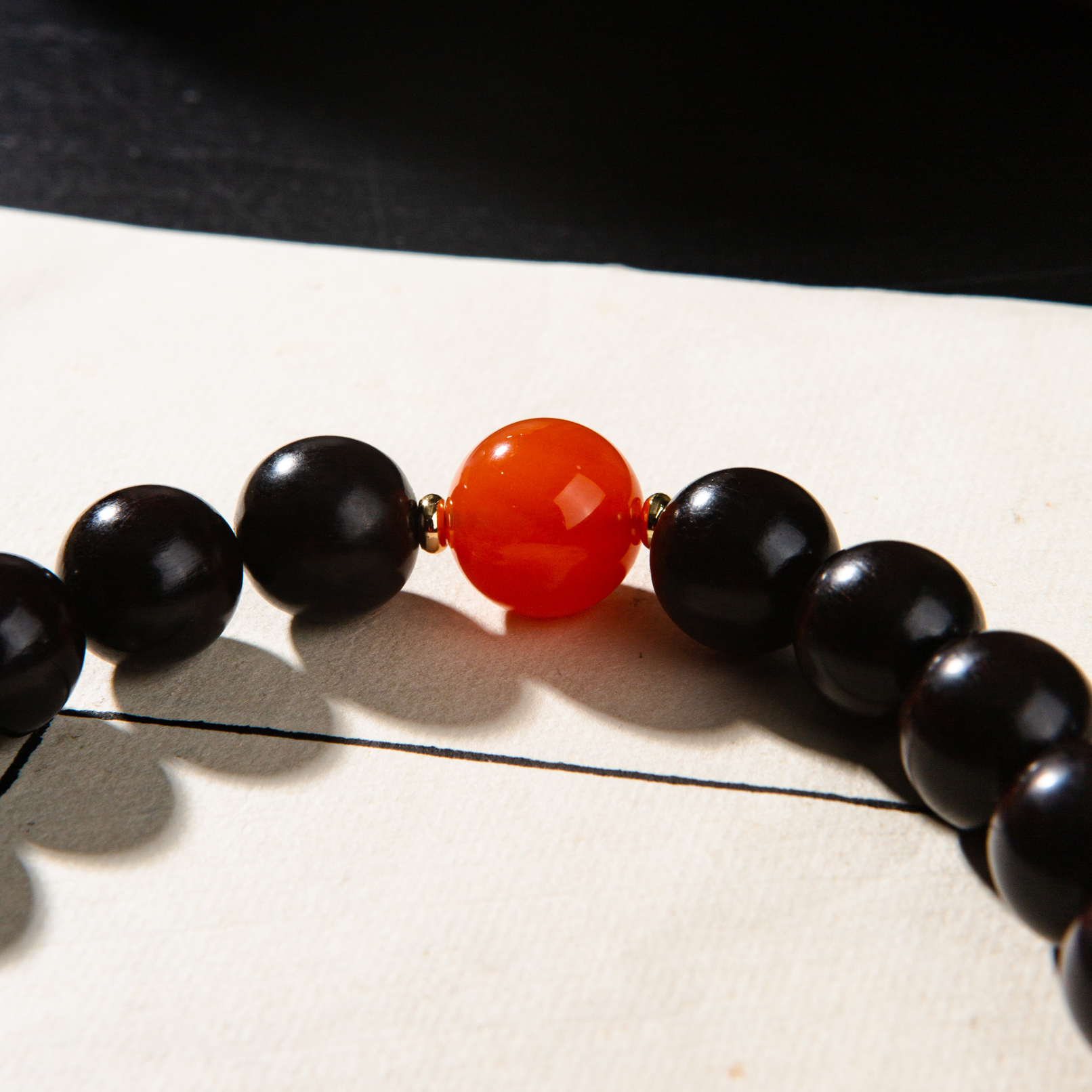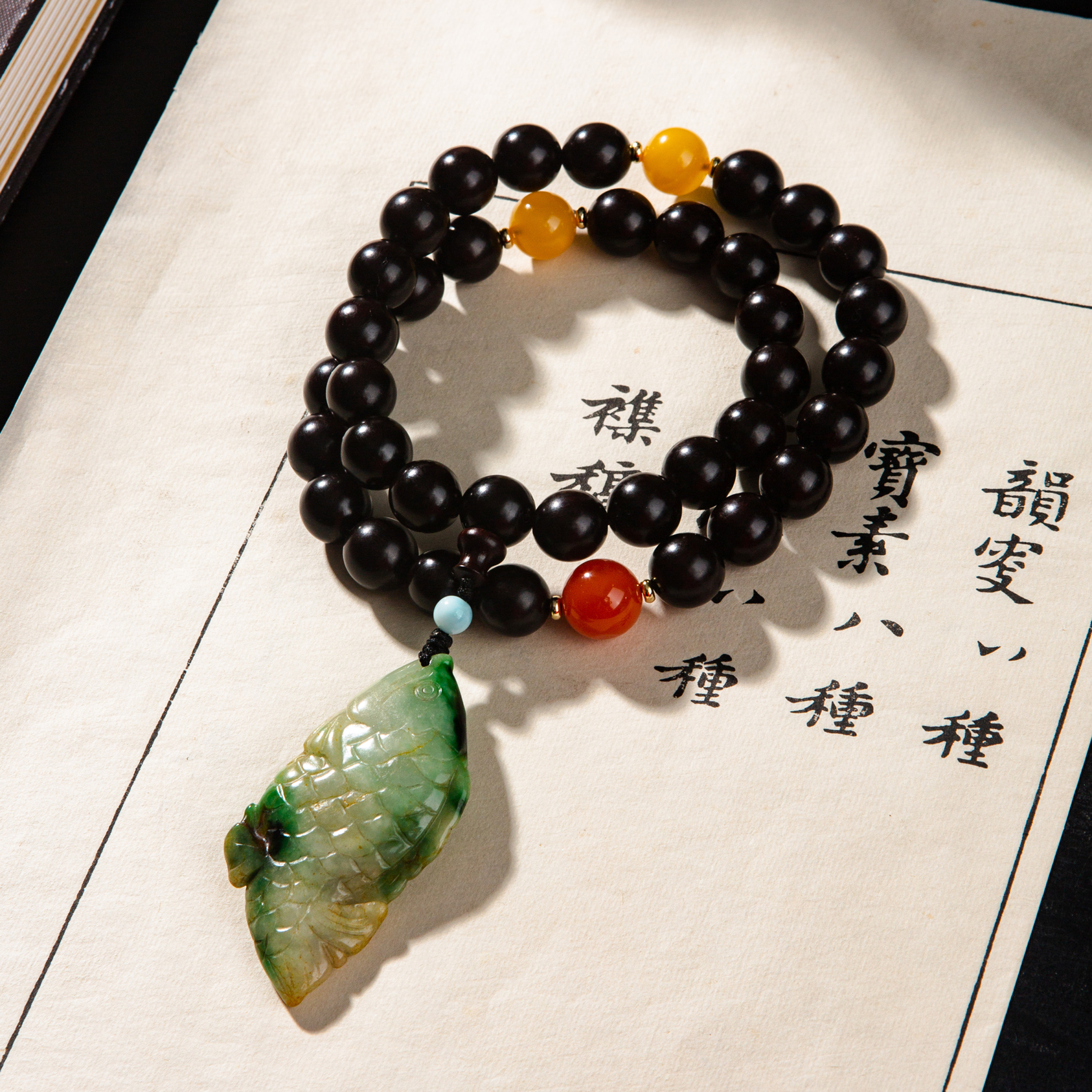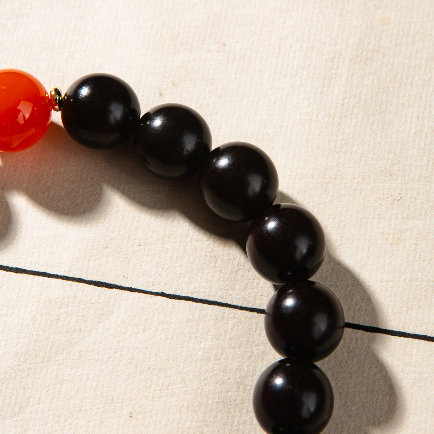 清代紫檀家具老料制手持,百年紫檀老料气息沉稳、油性大、密度高,气息古朴沉稳,手工制珠精细至极,并配有老翡翠、南红、蜜蜡等珍稀材质,整体呈现雍容华贵而又古朴沉稳之气息,是难得的文人清玩之物。