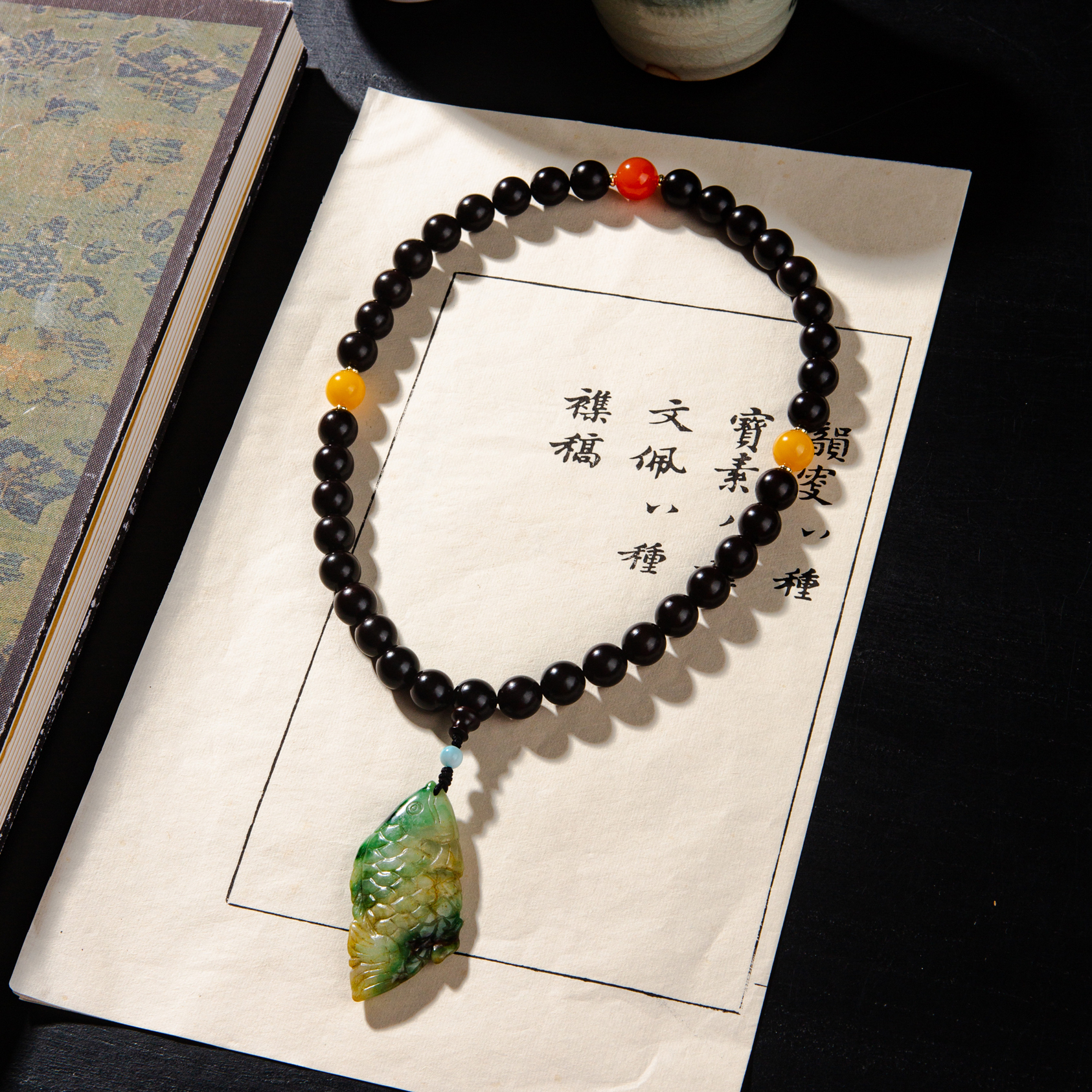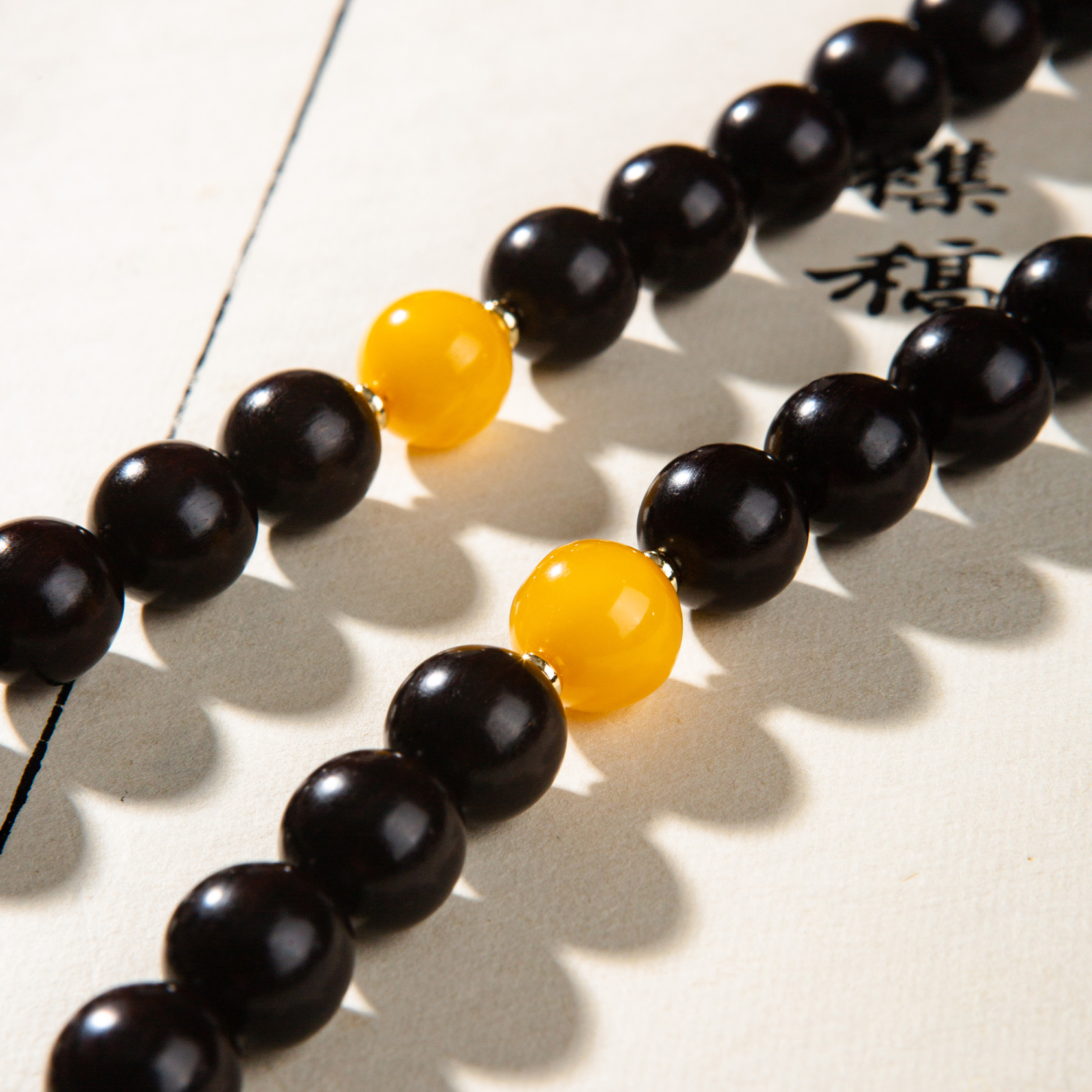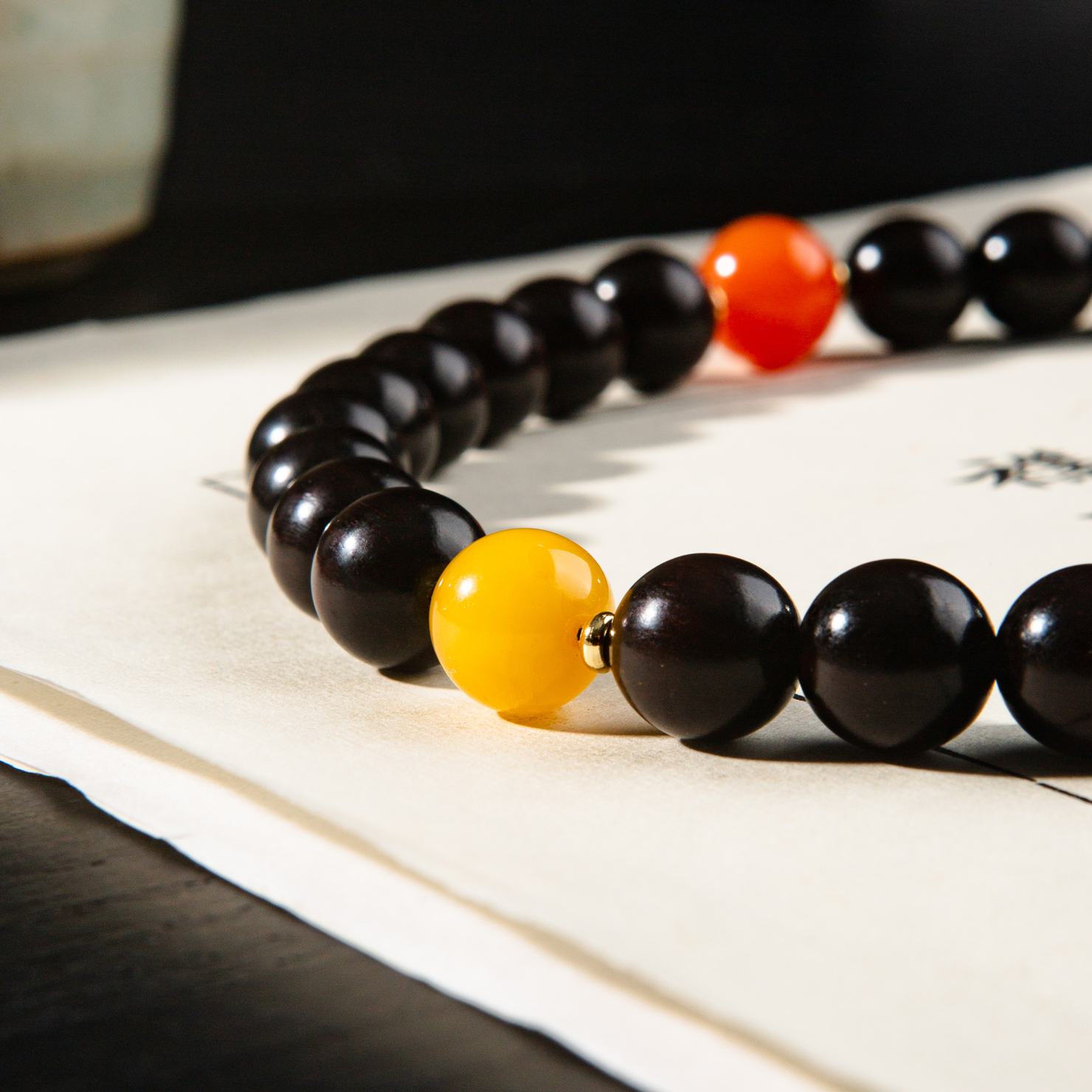 清代紫檀家具老料制手持,百年紫檀老料气息沉稳、油性大、密度高,气息古朴沉稳,手工制珠精细至极,并配有老翡翠、南红、蜜蜡等珍稀材质,整体呈现雍容华贵而又古朴沉稳之气息,是难得的文人清玩之物。