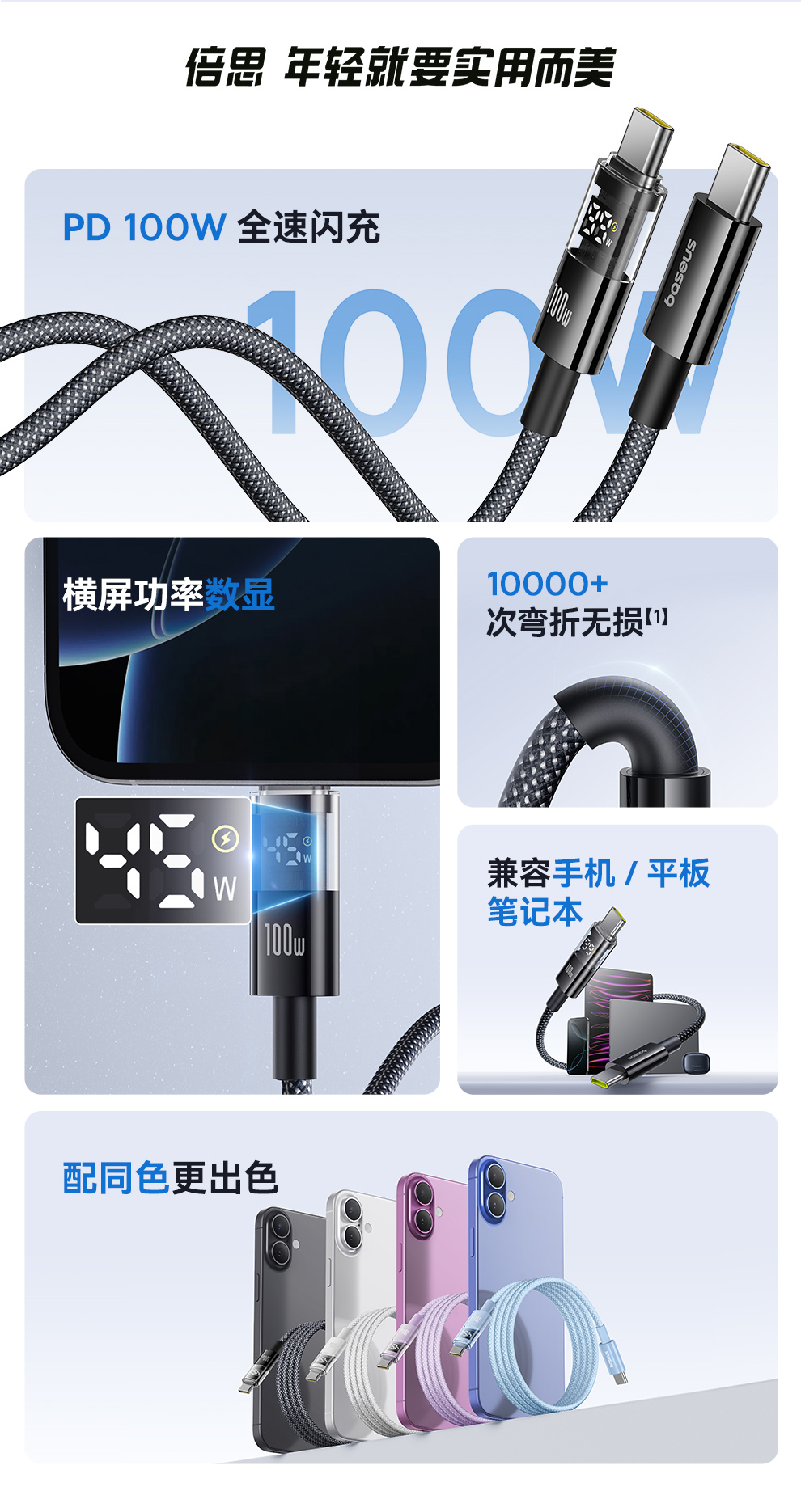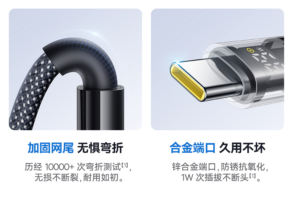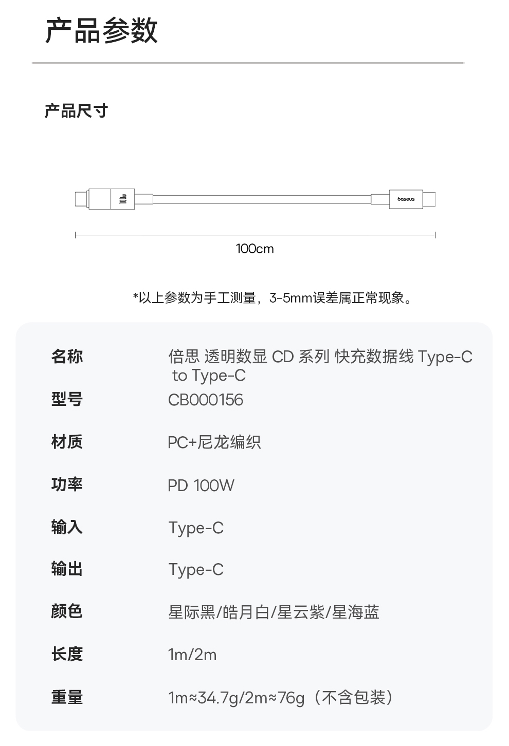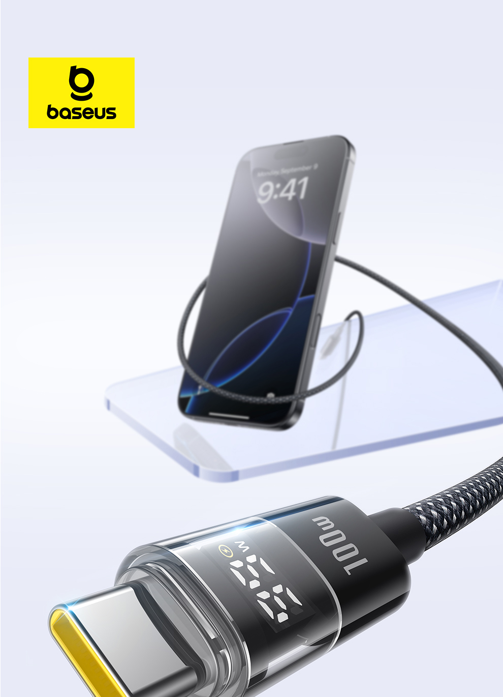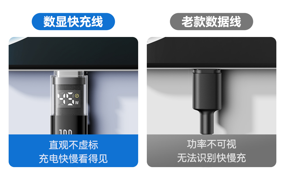 倍思 透明数显CD系列 快充数据线 Type-C to Type-C 100W 支持苹果15/16