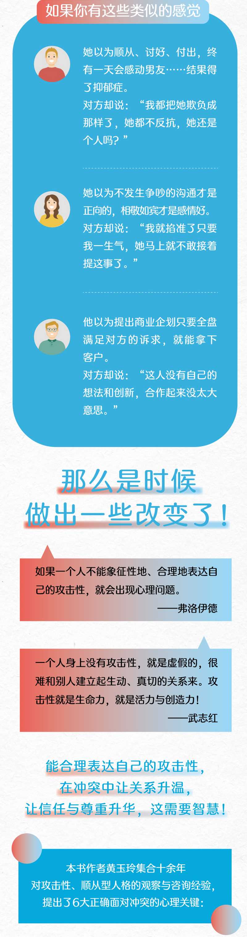 1.武志红心理联合出品:改编自武志红心理销售1000万的爆款课。武志红作序推荐2.实用的自助工具:从思想和行动双管齐下,让我们活出有个性、有活力的自己。3.作者背景:作者是武志红心理咨询工作室的合伙人,有深厚的专业咨询功底,有咨询、训练营、讲课、写书的多重经验,有固定的学员和用户。4.武志红平台可配合推广。差异化卖点:1.主题:;攻击性本能是弗洛伊德提出的概念,这是大陆第一本以攻击性为主题的书。2.理论与自助结合:本书作者黄玉玲集合十余年对攻击性、讨好型人格的观察与咨询经验,提出了6大正确面对冲突的心理关键。3.真实的案例分析:从亲情、友情、爱情、职场关系多维度代入场景阐述。