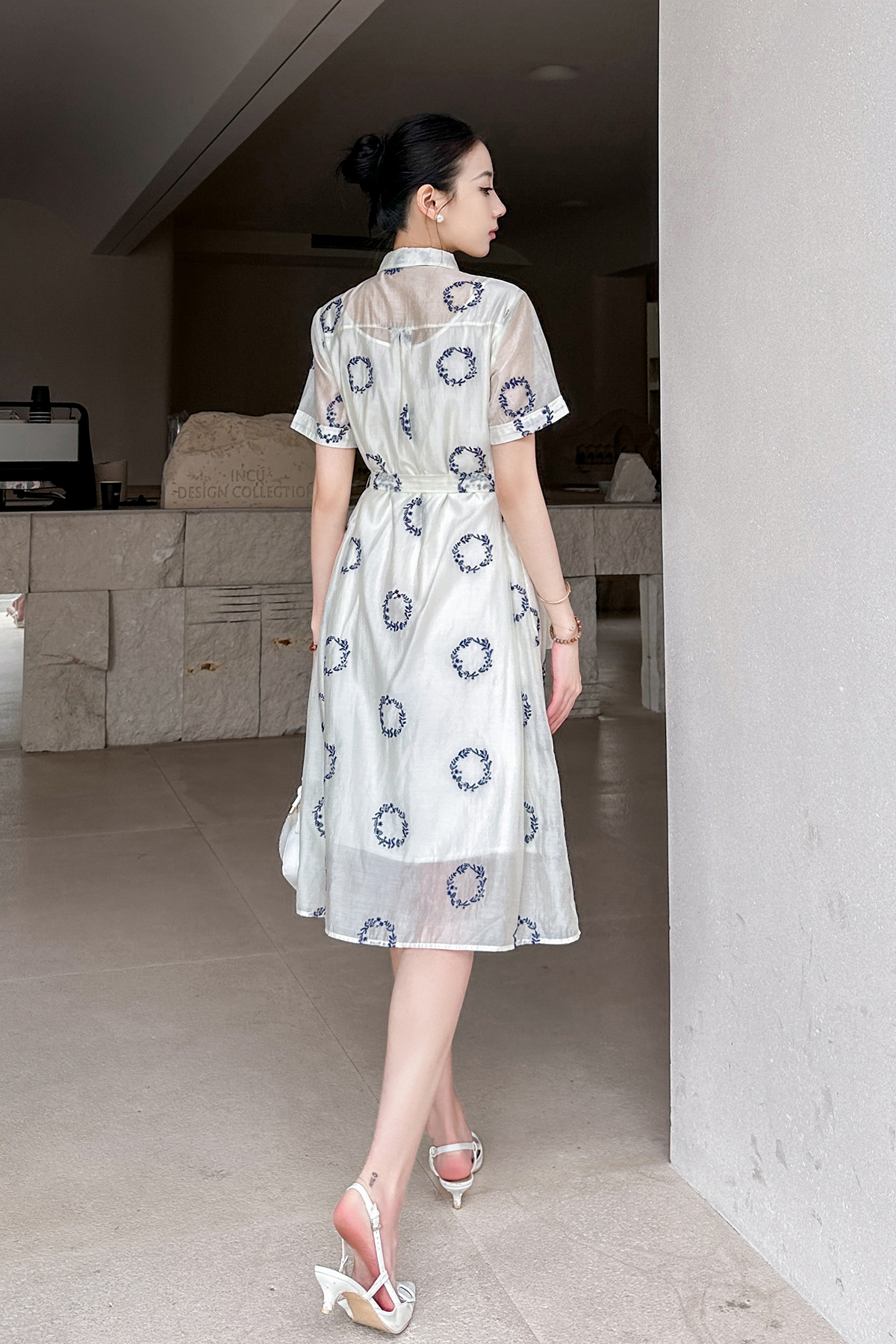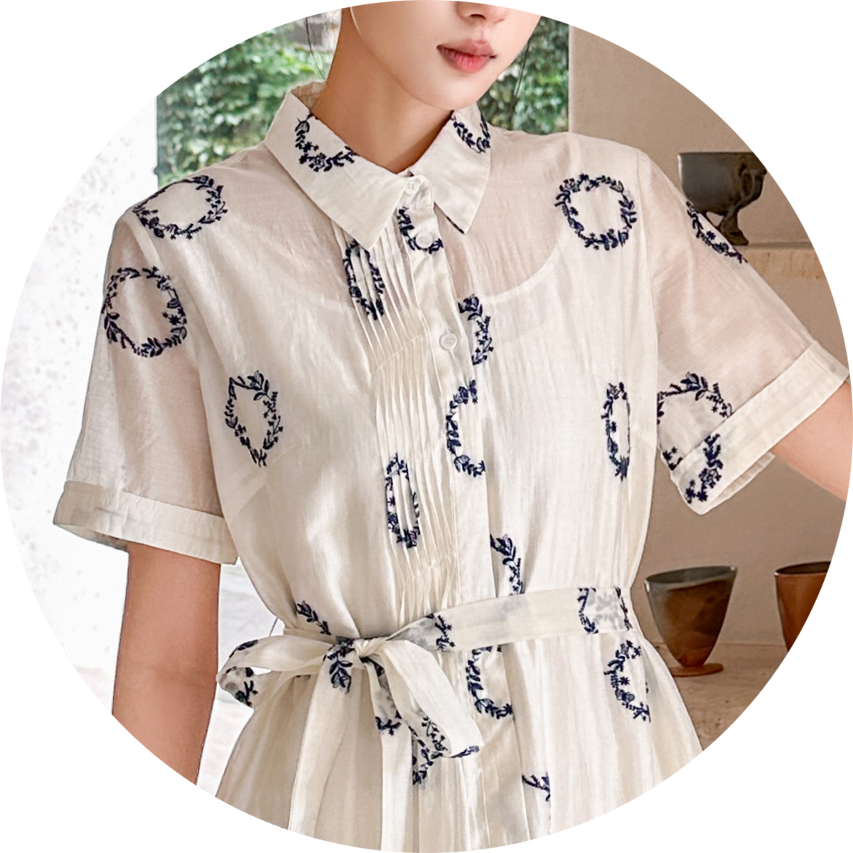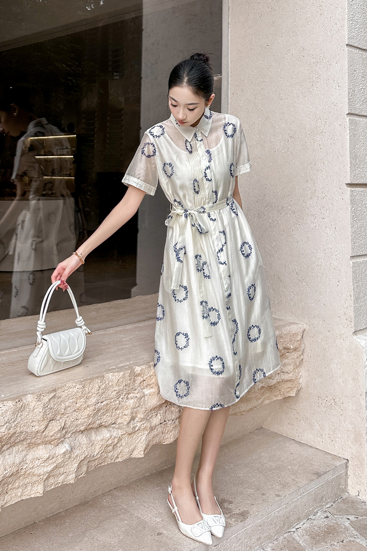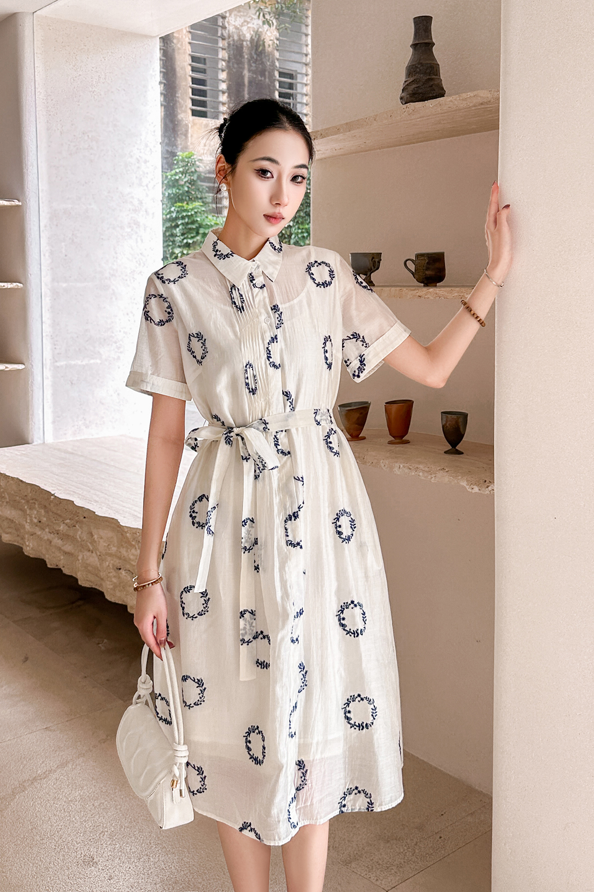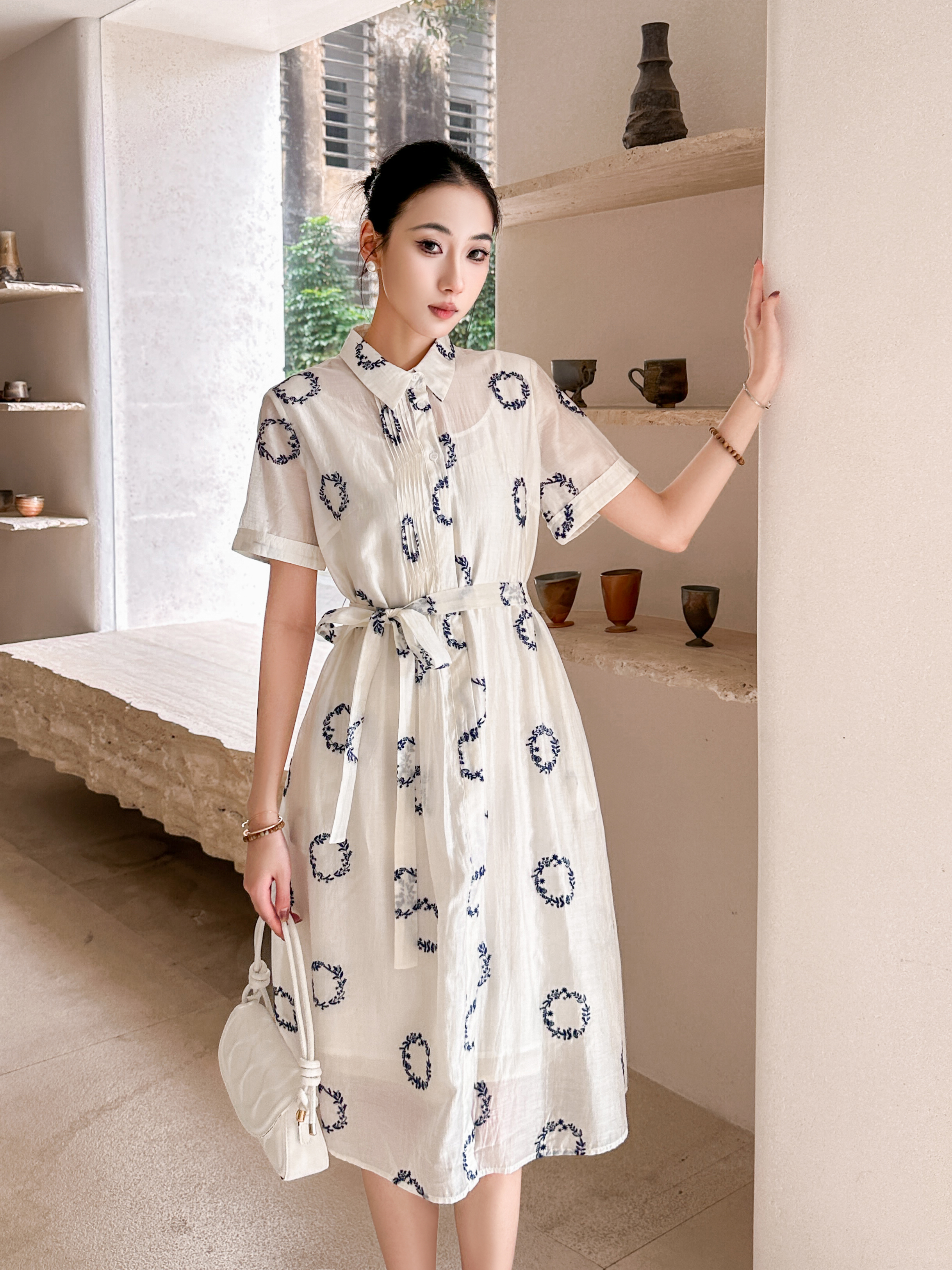 HJ2S88_凝脂色_连衣裙_夏季_设计感翻领衬衫式系带收腰显瘦 A 字中长裙_高级女装_BERNIEELEN 伯妮斯茵