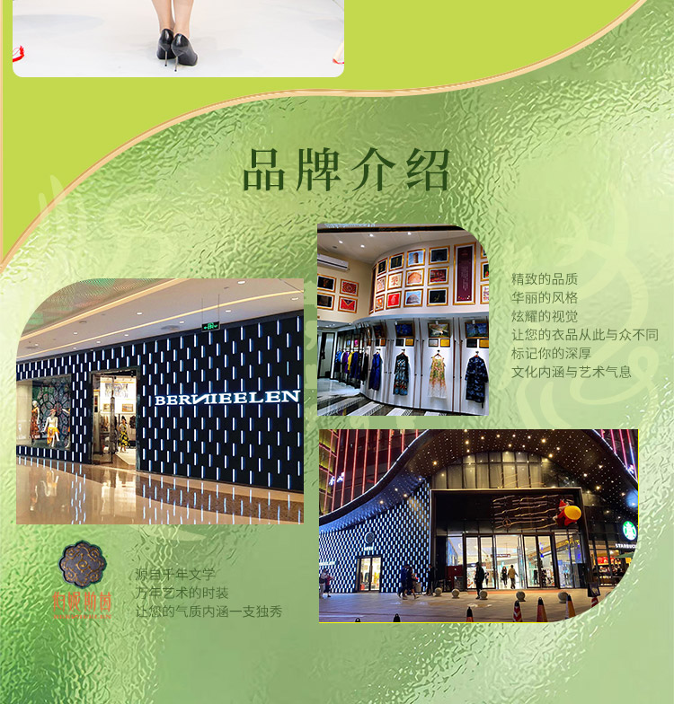 行业首家从事文创研发的女装品牌-伯妮斯茵 品牌风格:源自千年文学和万年艺术的时装,让你的气质内涵一枝独秀,精彩的品质,华丽的风格,炫耀的视觉,让你的衣品从此与众不同,标记你深厚的文化内涵与艺术气息。