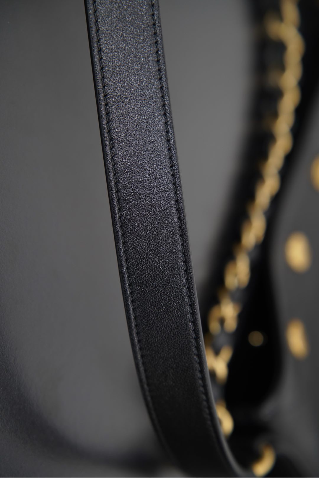 采用柔软细腻的山羊皮 五金为复古做旧风;金属排扣重量感的双??吊坠设计 复古感十足 上身效果超惊艳很随性百搭 轻松营造出松弛、酷 的氛围感肩带长短可调节 单间斜挎都 尺寸适中 很实用的一只包!自重很轻、装? 完全没问题材质:抛光小羊皮搭配金属