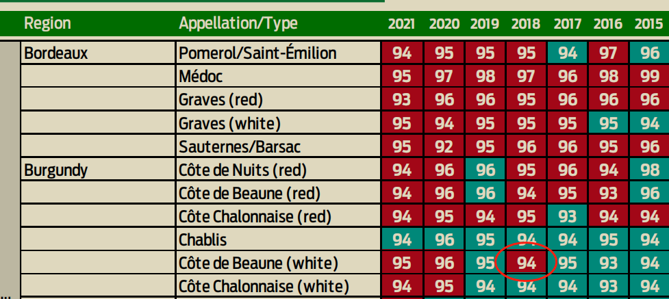 2018 年份的勃艮第干白是一个比较好的年份,《葡萄酒爱好者》(Wine Ehusiast)给予 2018 年 94 份的肯定。这一年的高品质干白酥脆爽口,风味浓郁奔放。此酒距今近 5 年,正值适饮期,当然,作为名酒系列,此酒也值得陈年。