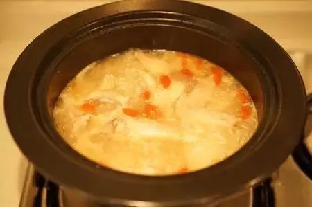 3、把炒姜剩下的油烧热,鸡倒进去,鸡肉炒变色后倒入米酒,烧开,把所有东西转到砂锅中,根据情况加适量水,大火烧开后转小火,煲大概20分钟鸡肉熟烂就可以了,起锅前五分钟撒入枸杞。