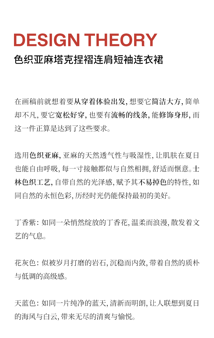 以天然亚麻为载体,融合热烈色彩与自在剪裁为身在城市、心怀远方的女性提供兼具美学与舒适的旅行着装
