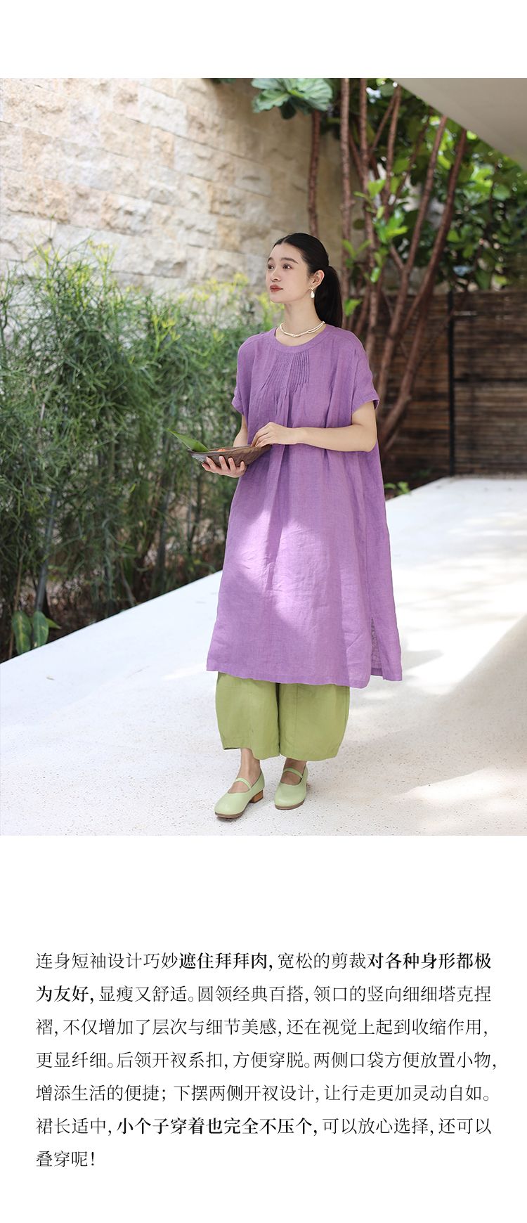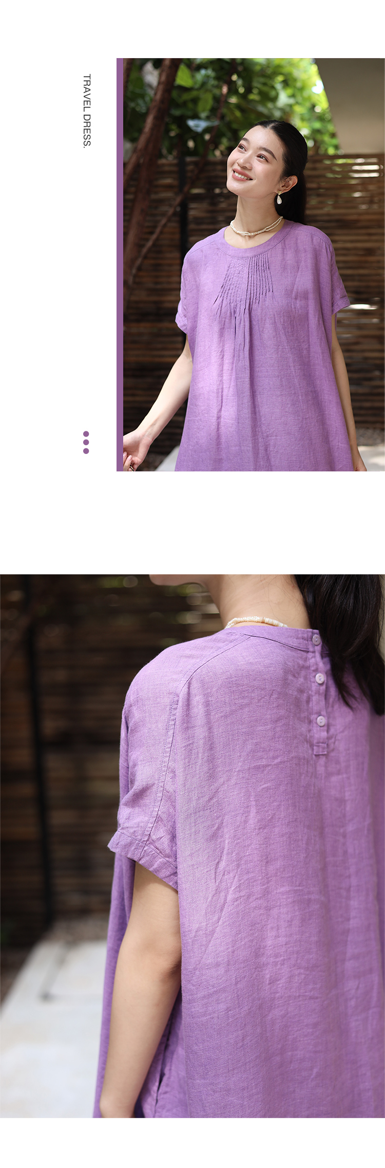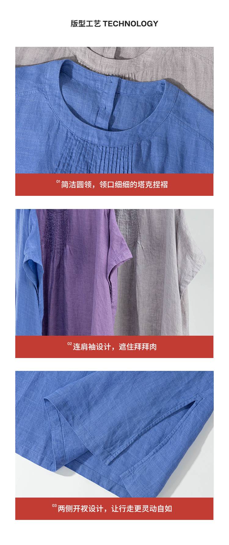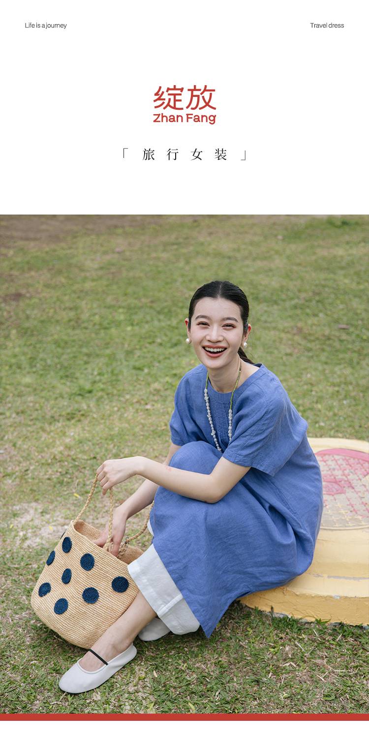绽放旅行女装176朵/色织亚麻塔克捏褶文艺简洁圆领连肩短袖连衣裙