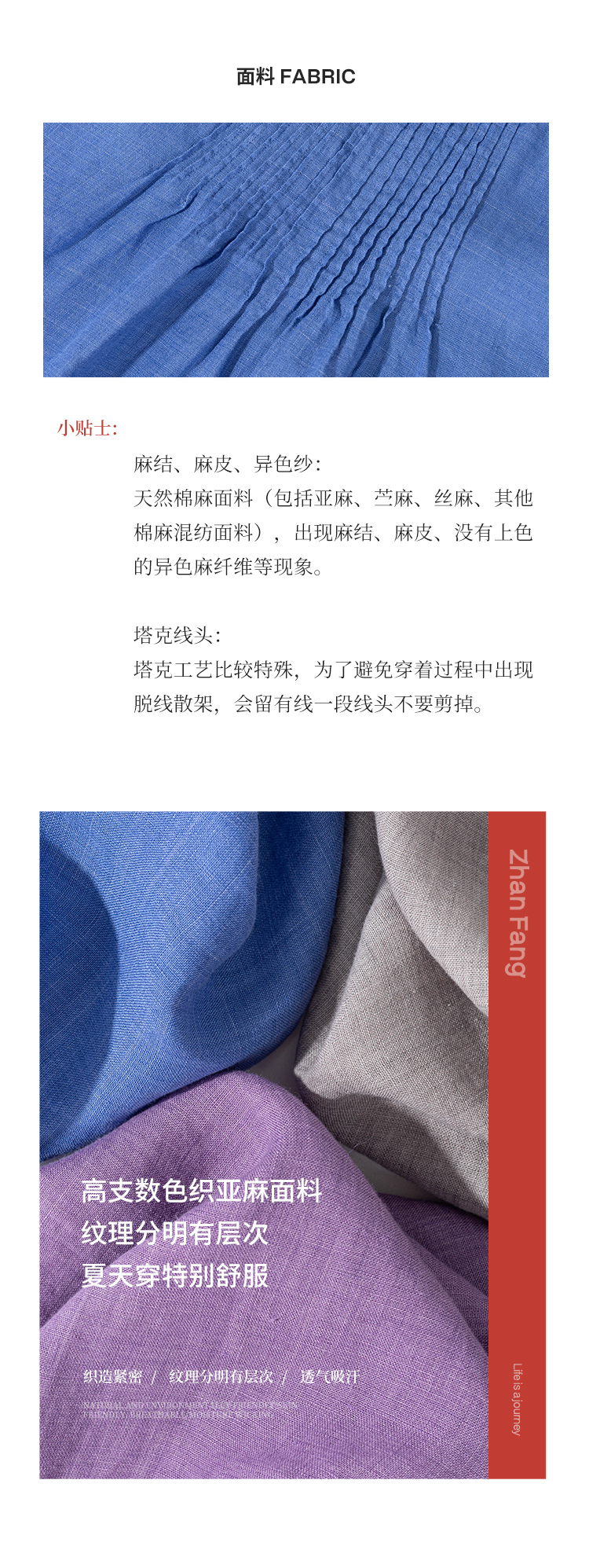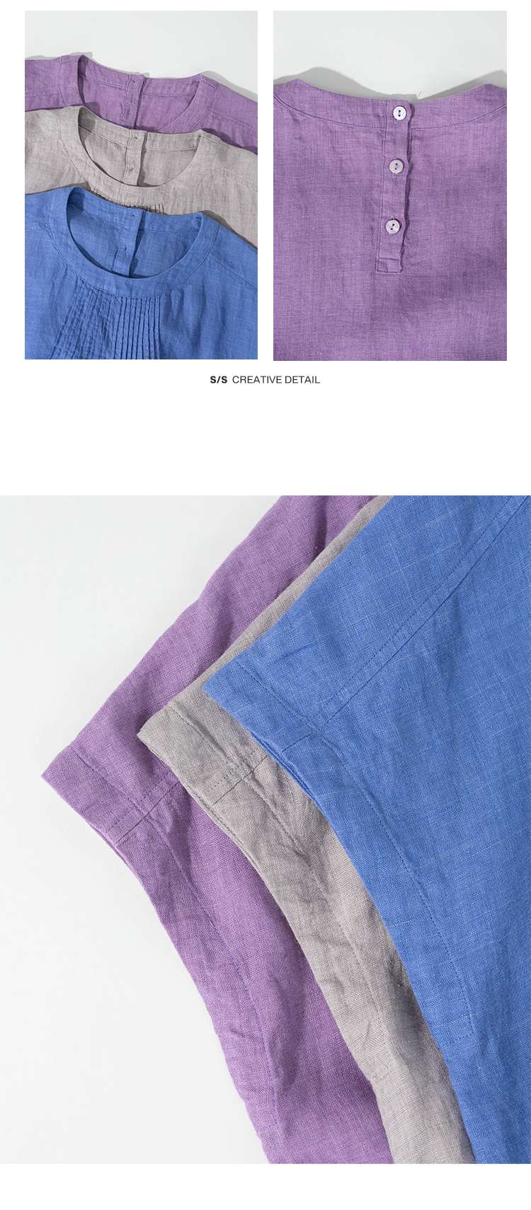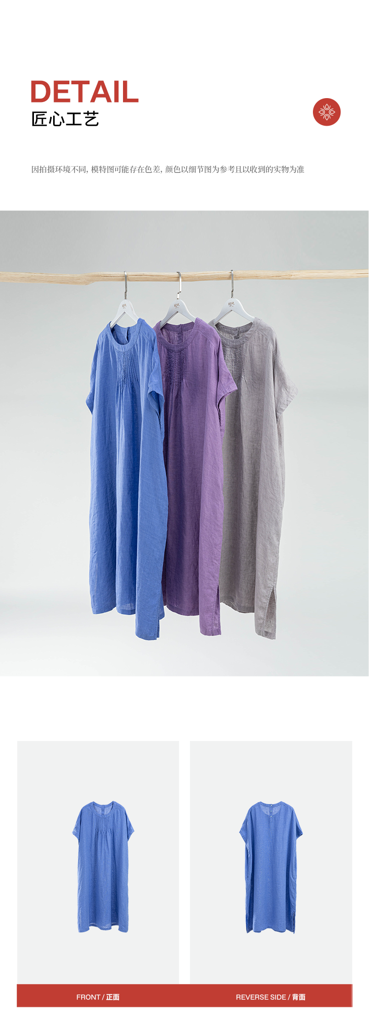 绽放旅行女装176朵/色织亚麻塔克捏褶文艺简洁圆领连肩短袖连衣裙