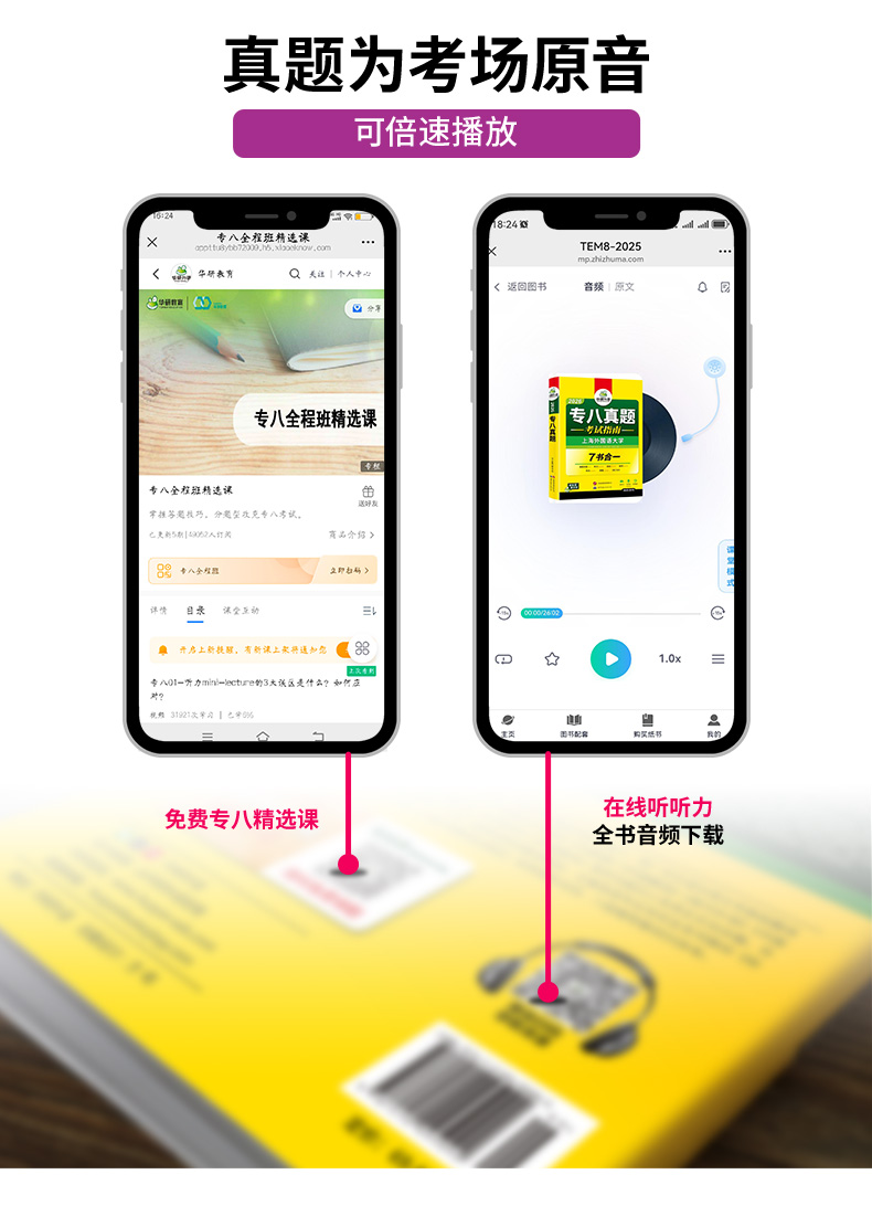 5. 真题音频均为考场原音,扫码获取,多种方式收听,可在线听,可下载,可倍速,练习更方便。