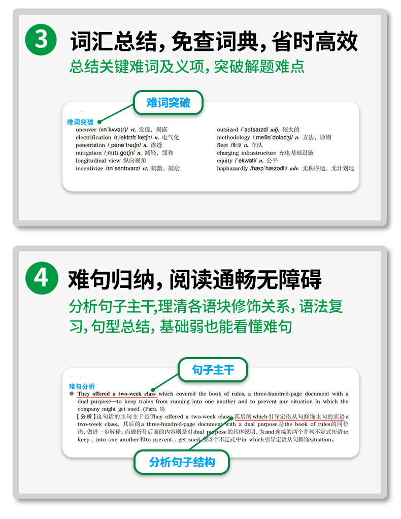 3. 真题专业解答,解析详细透彻,一针见血点评考点,阅读文章提供全文翻译、难句分析、词汇注释、干扰项排除,考生复习更高效;