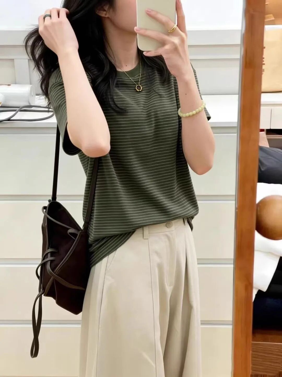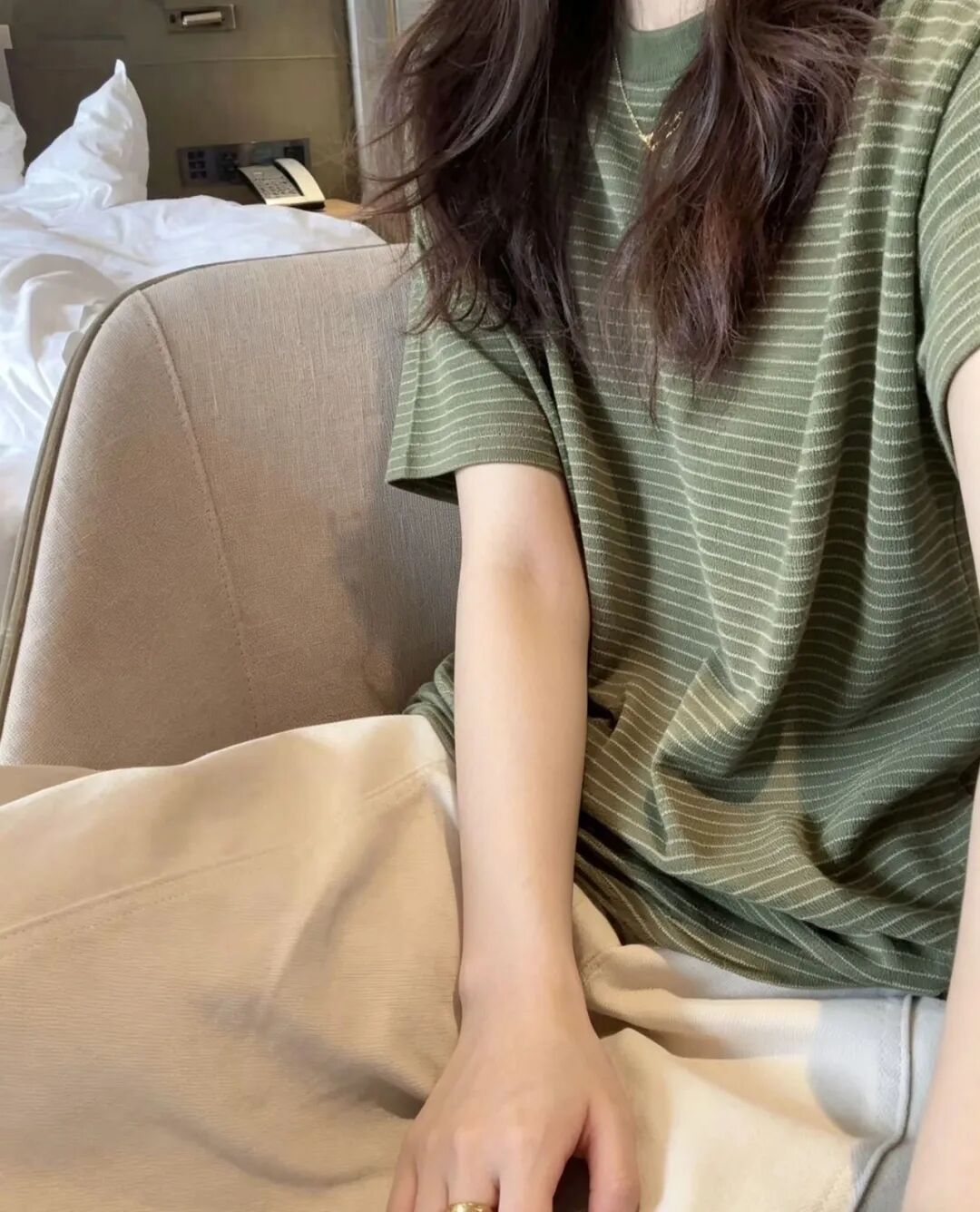 橄榄绿肌理条纹T恤 ,定制定染步面,撞色钩织条纹,手感柔和厚实,显白百搭更时髦