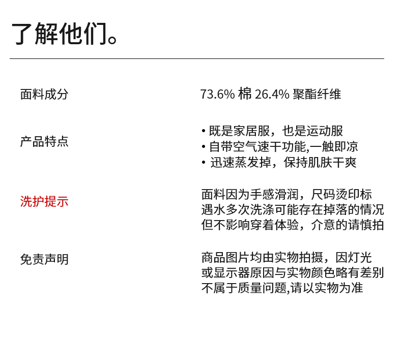 【品名】chunmolife 空气凉感棉 轻运动家居服套装 男女款 舒适百搭 【规格】 女款:冰岛紫、云清绿、梨花白、布丁黄、果冻蓝 男款:藏蓝色、迷烟灰、板绿色 【尺码】 女款:均码L 男款:XL、2XL 【产地】国内 【材质】棉73.6% 聚酯纤维26.4% 【发货包装】独立包装 【发货地】浙江 【发货快递】中通 【补邮费地区】 新疆、西藏、青海+15元/单 甘肃、内蒙、宁夏+5元/单 【发货时效】48-72小时,周末节假日顺延 |