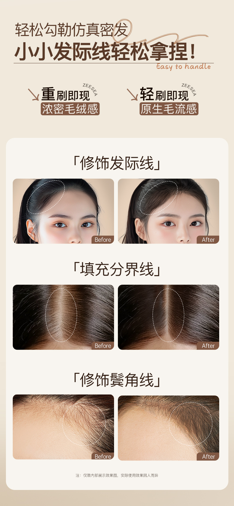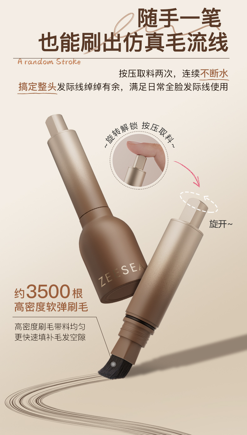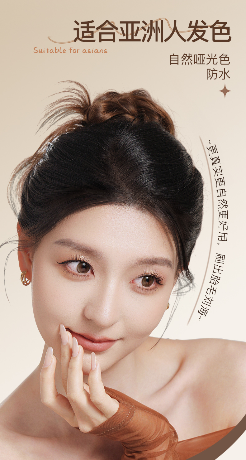 发际线液全新的液转粉技术,丝滑又顺畅,秒速成膜,牢牢贴合头皮,完全不会出现搓泥成坨、飞粉掉渣的尴尬状况。刷头45度斜角,搭配3500根高密度软弹刷毛,角度精准贴合发际线、发缝和鬓角,带料均匀不结块,手残党轻轻一刷也能有自然原生毛流感,重刷几层还能有浓密毛绒感,不用担心色块太重一眼假,而且防水防汗,更添加吸油微粒,就算健身暴汗、夏天出油,甚至雨天出门都不怕掉色流黑汤,持妆一整天。卸妆也超省心,洗发水或洗面奶轻轻一洗就能卸干净,很方便!