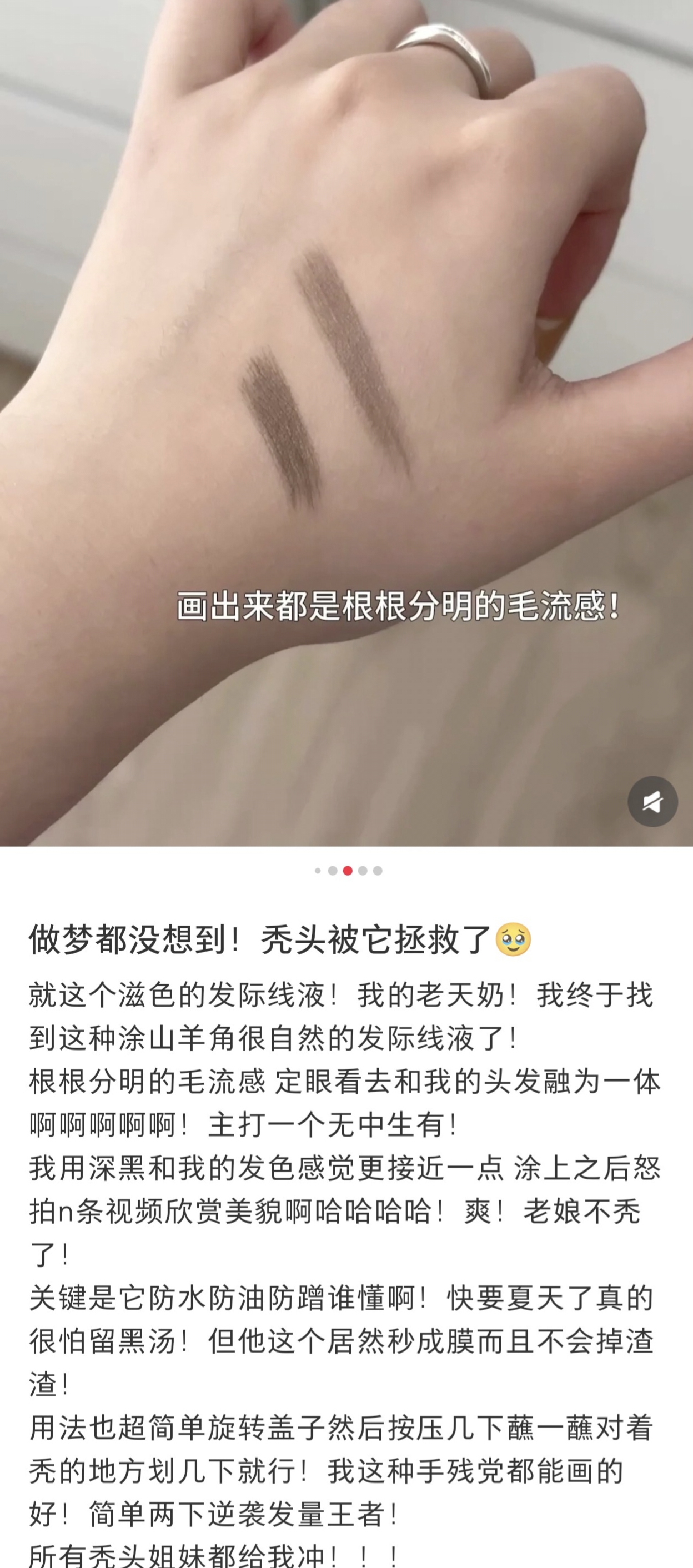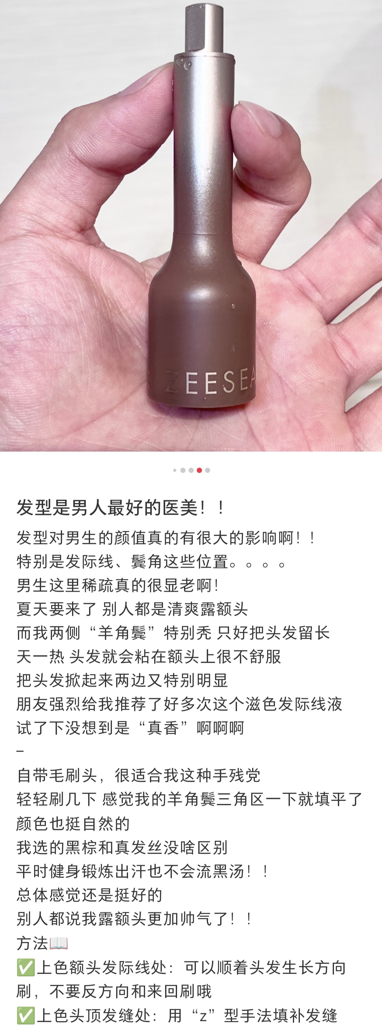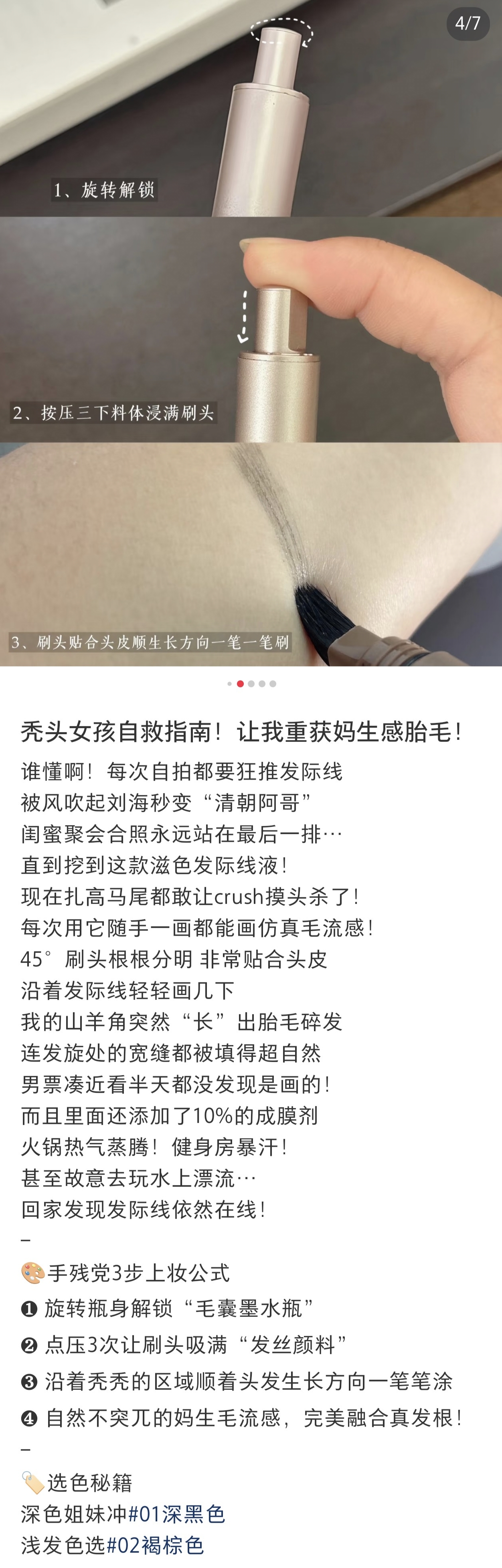 虽然我已经不化妆啦,见朋友也都是素颜,但对于发量,还是有一定追求的!这几年的大脱发,也是全靠头皮油浴外养+营养素内调,发量总体稳稳在线!但发际线的两个小三角,还是有些微稀疏,小毛毛太过细软,这支毛流感发际线液,也很适合我哎,刷上超自然,有发丝感,关键是还防水,不会像普通发际线粉一样下个雨出个汗就流黑水!
