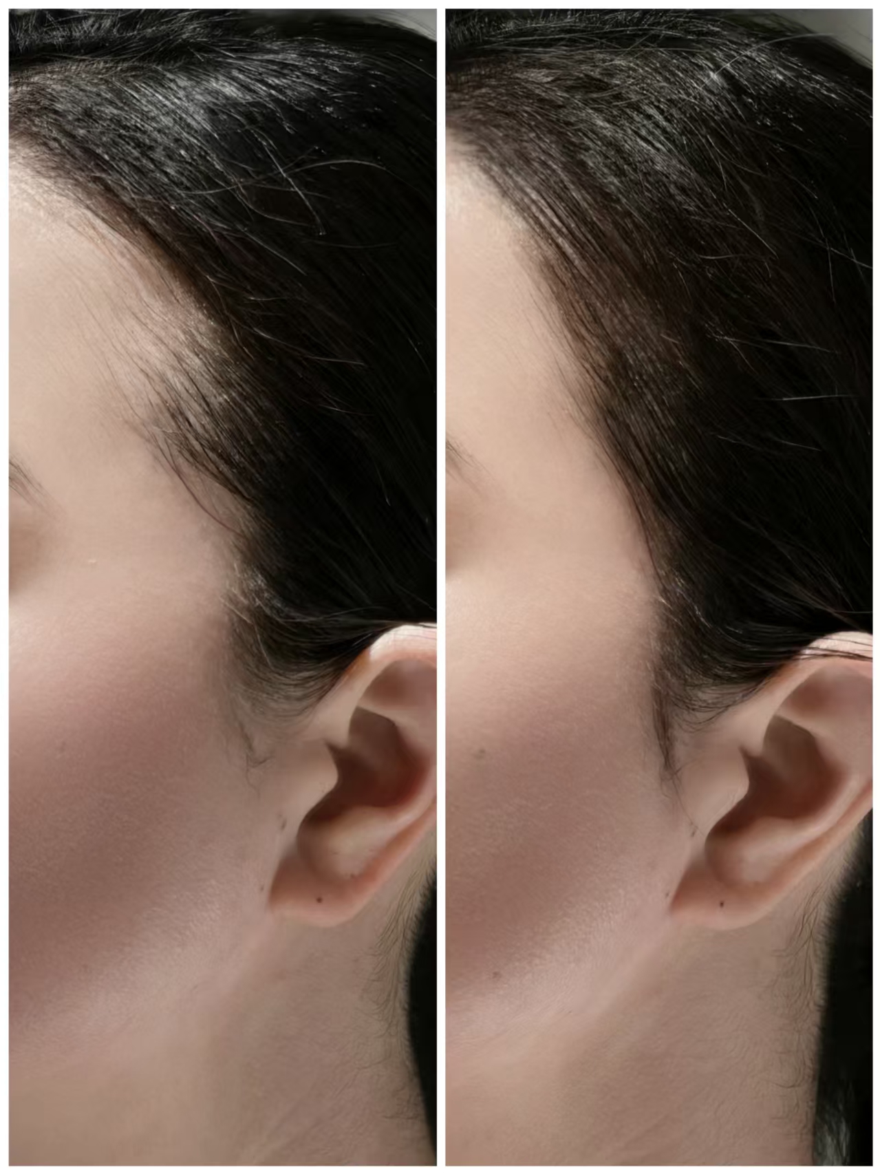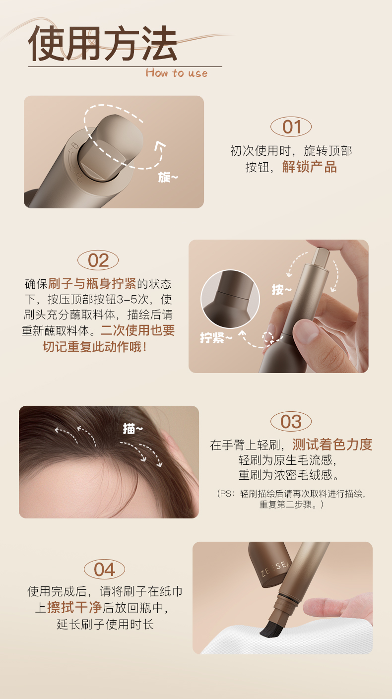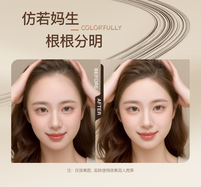 发际线液还有两个色号,深黑和棕褐,对应深浅发色。平时倒放皇冠底座上,要用时,就旋转顶部解锁,拧紧后按压3-5次让刷头蘸满料体,先在手臂上测试下着色力度,再顺着头发生长方向一笔一笔画,如果刷头没颜色了,就再拧回去按按,料体是在大头的底部,看起来不多,但能用很久哦!不管是填补后移的发际线、隐形宽大的发缝,还是修饰稀疏的鬓角,都能精准覆盖,如果化妆水平可以,画个野生眉也不是不可以!