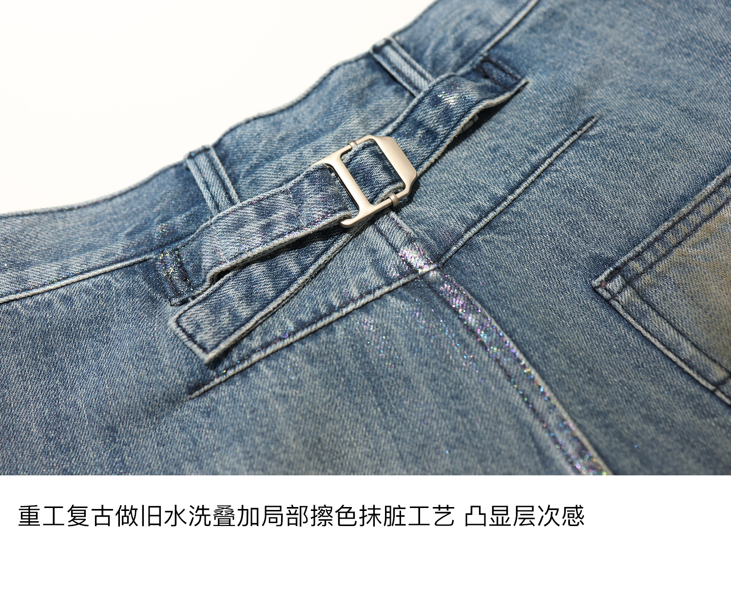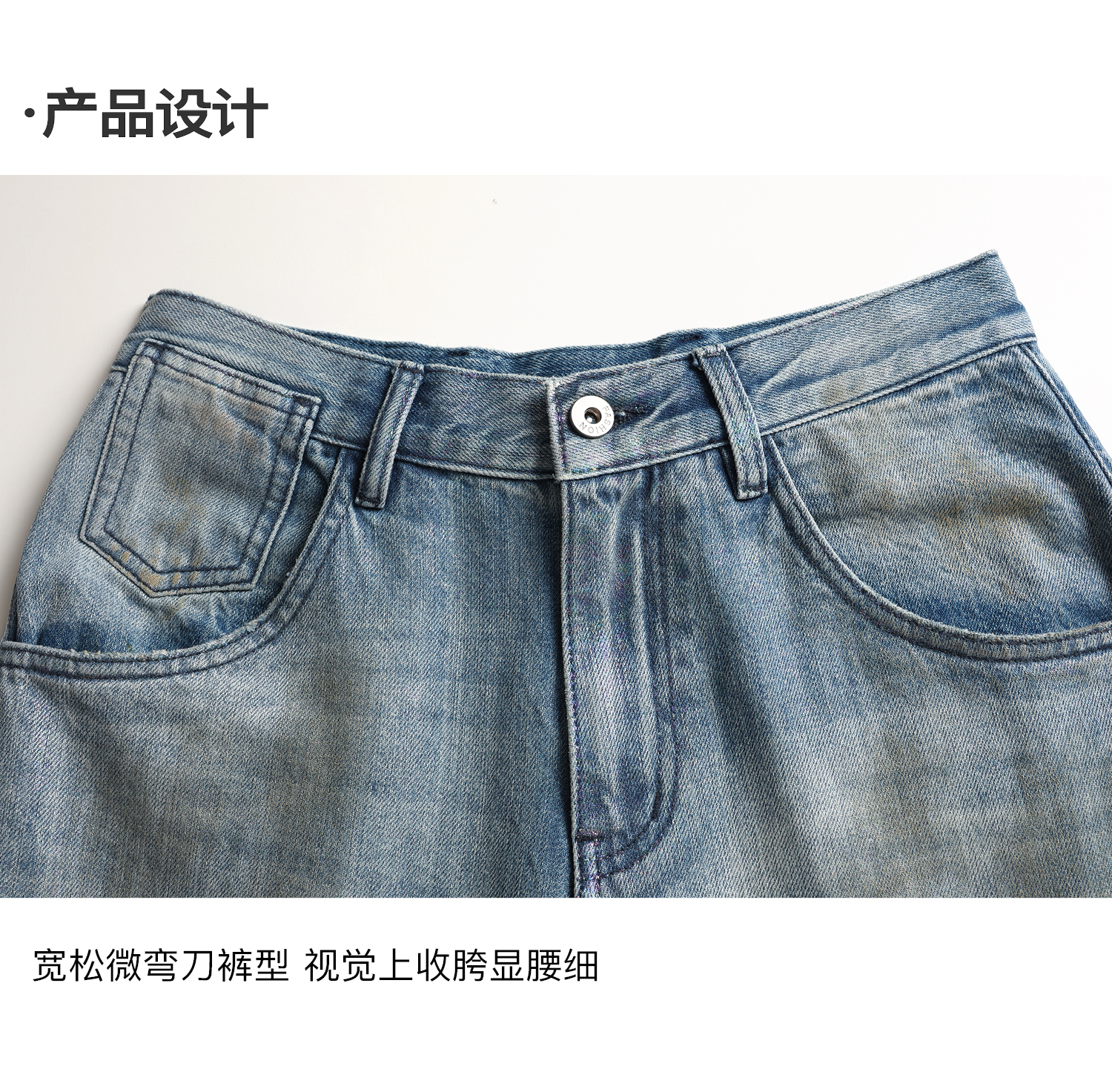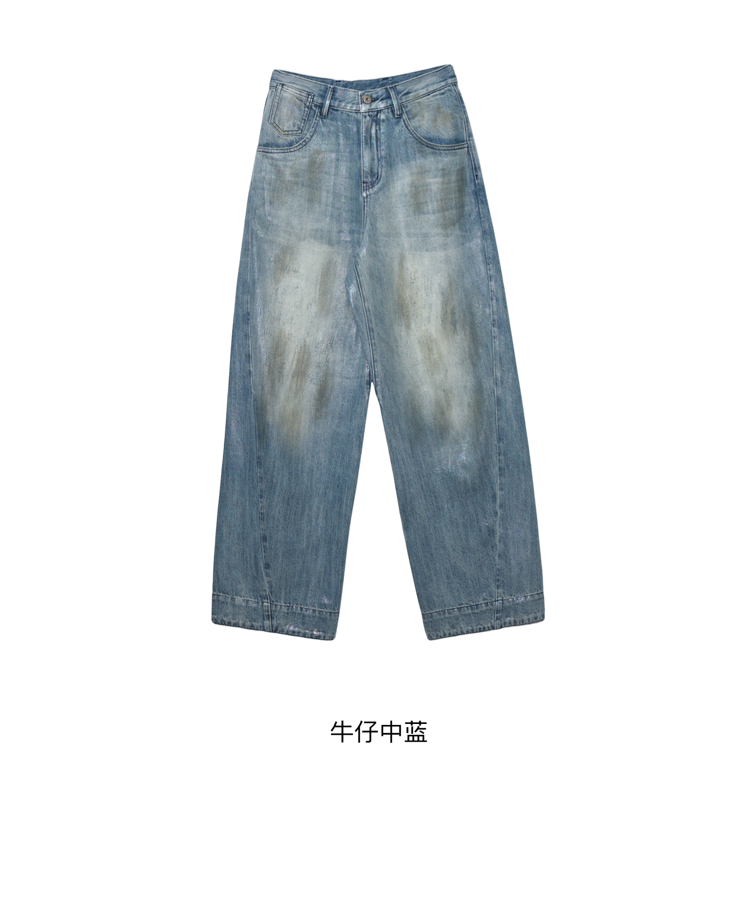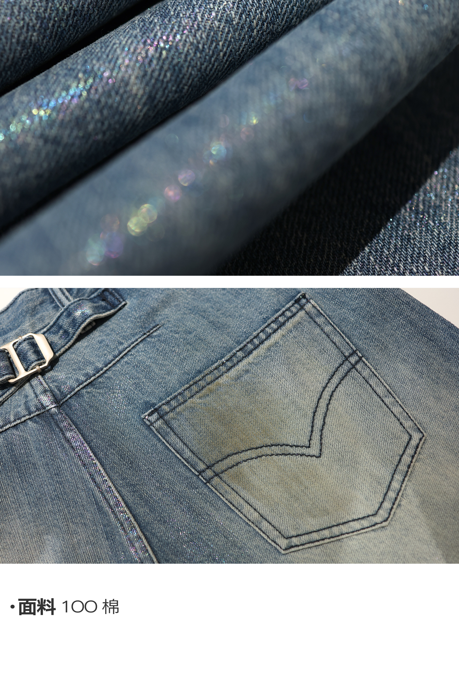 素舶 全棉牛仔面料舒适透气闪粉人鱼姬涂层抹脏宽松弯刀牛仔裤