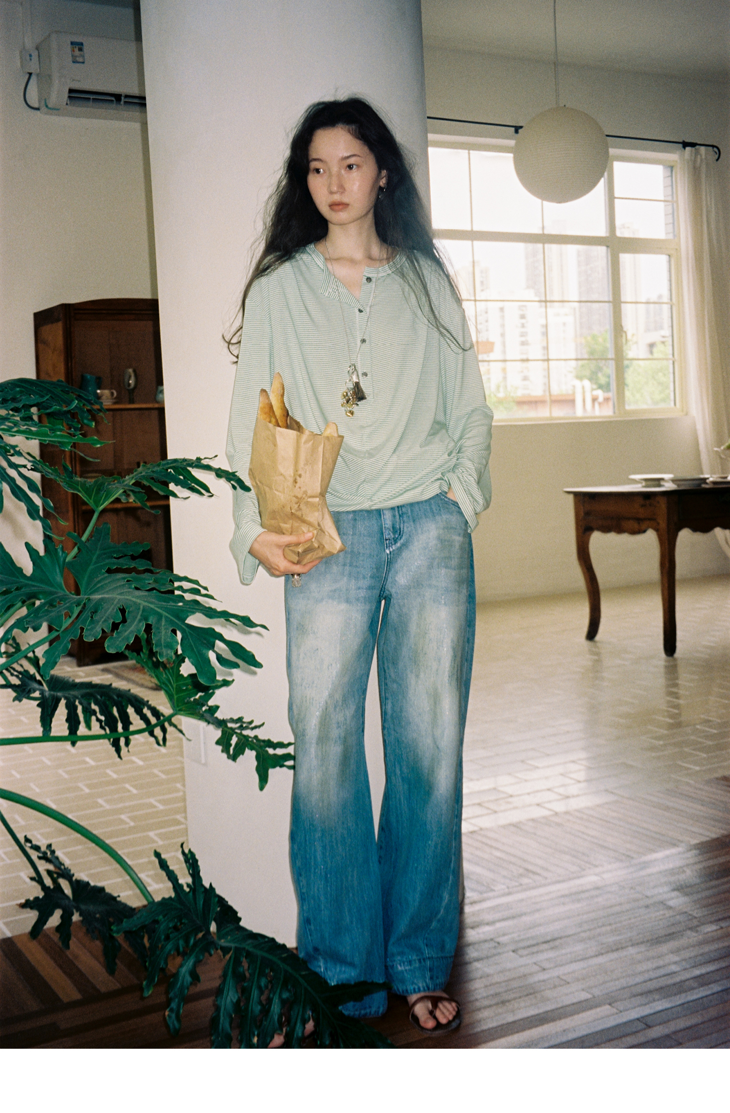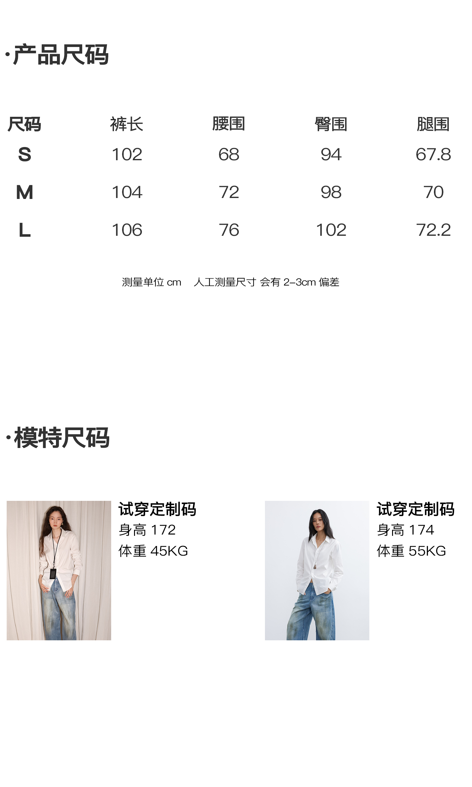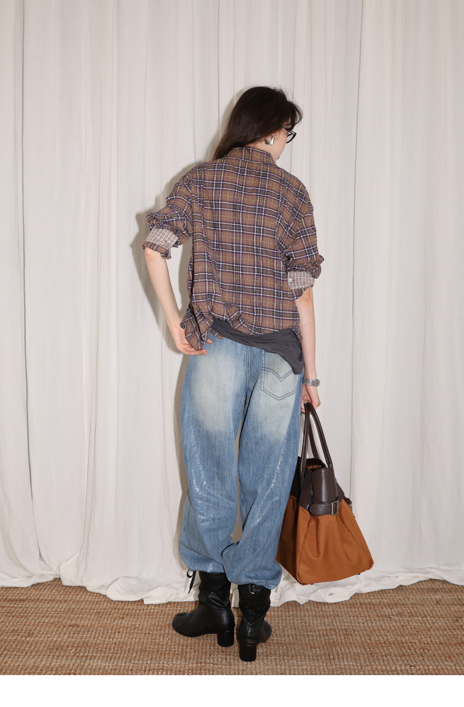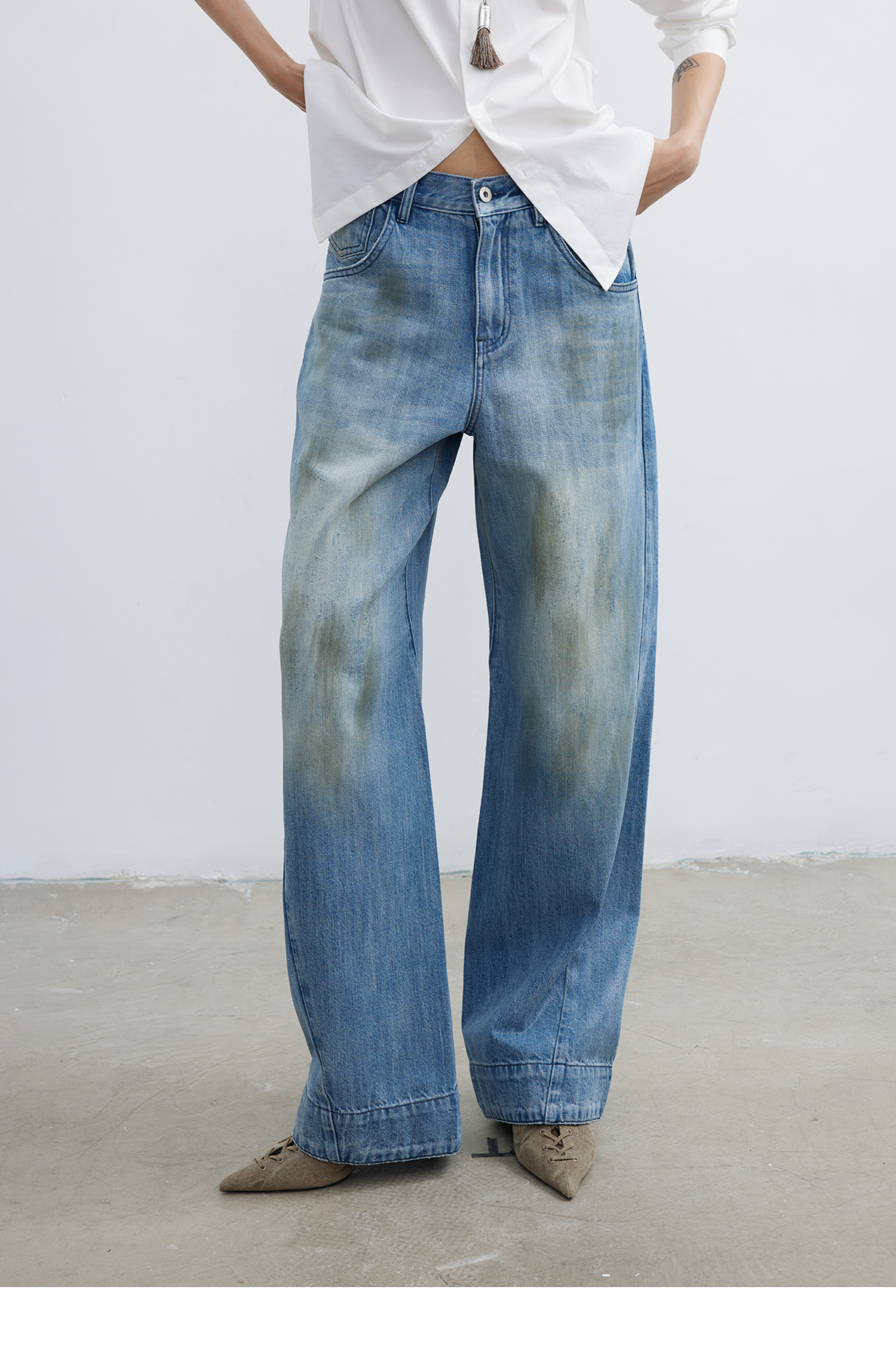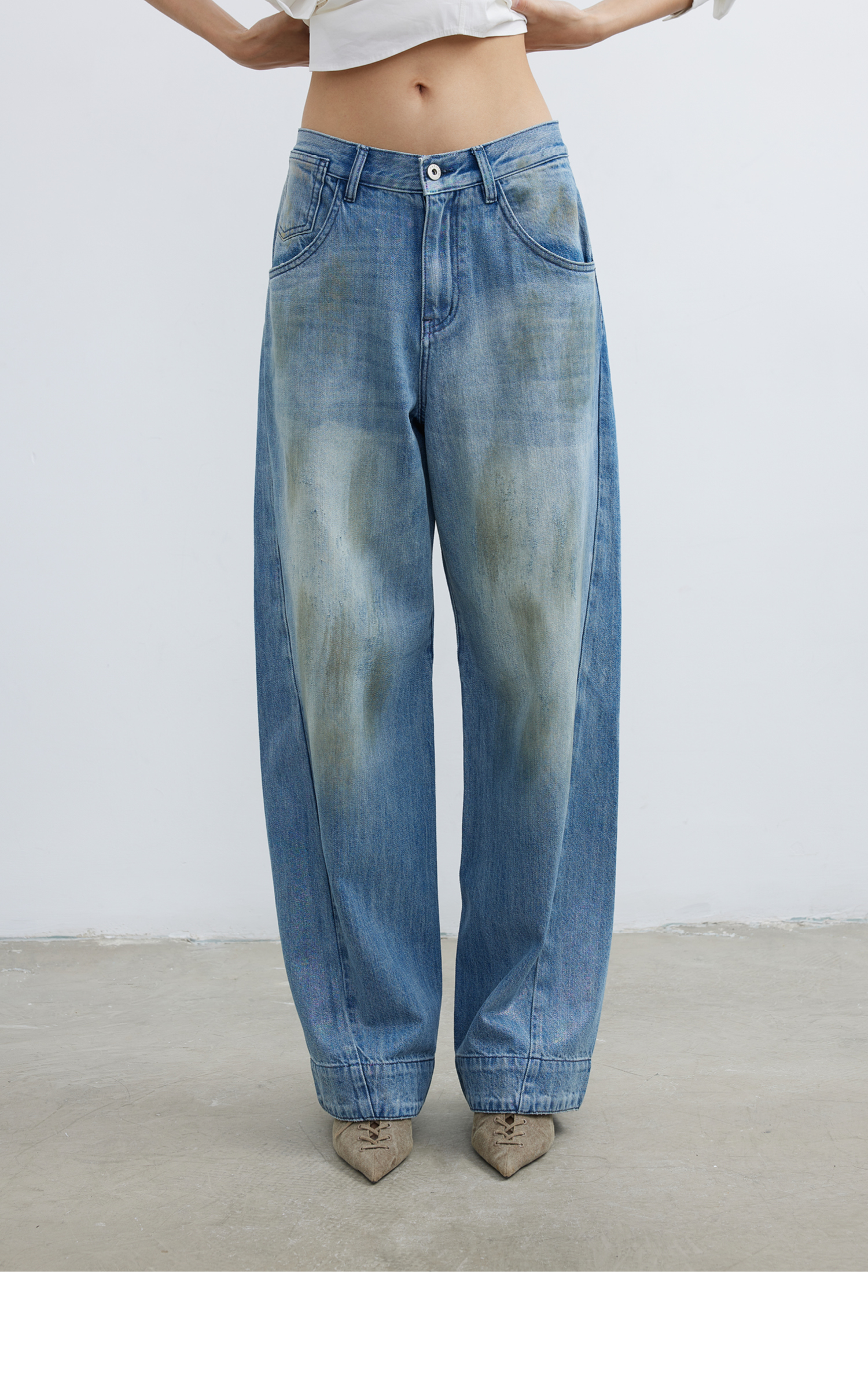 素舶 全棉牛仔面料舒适透气闪粉人鱼姬涂层抹脏宽松弯刀牛仔裤