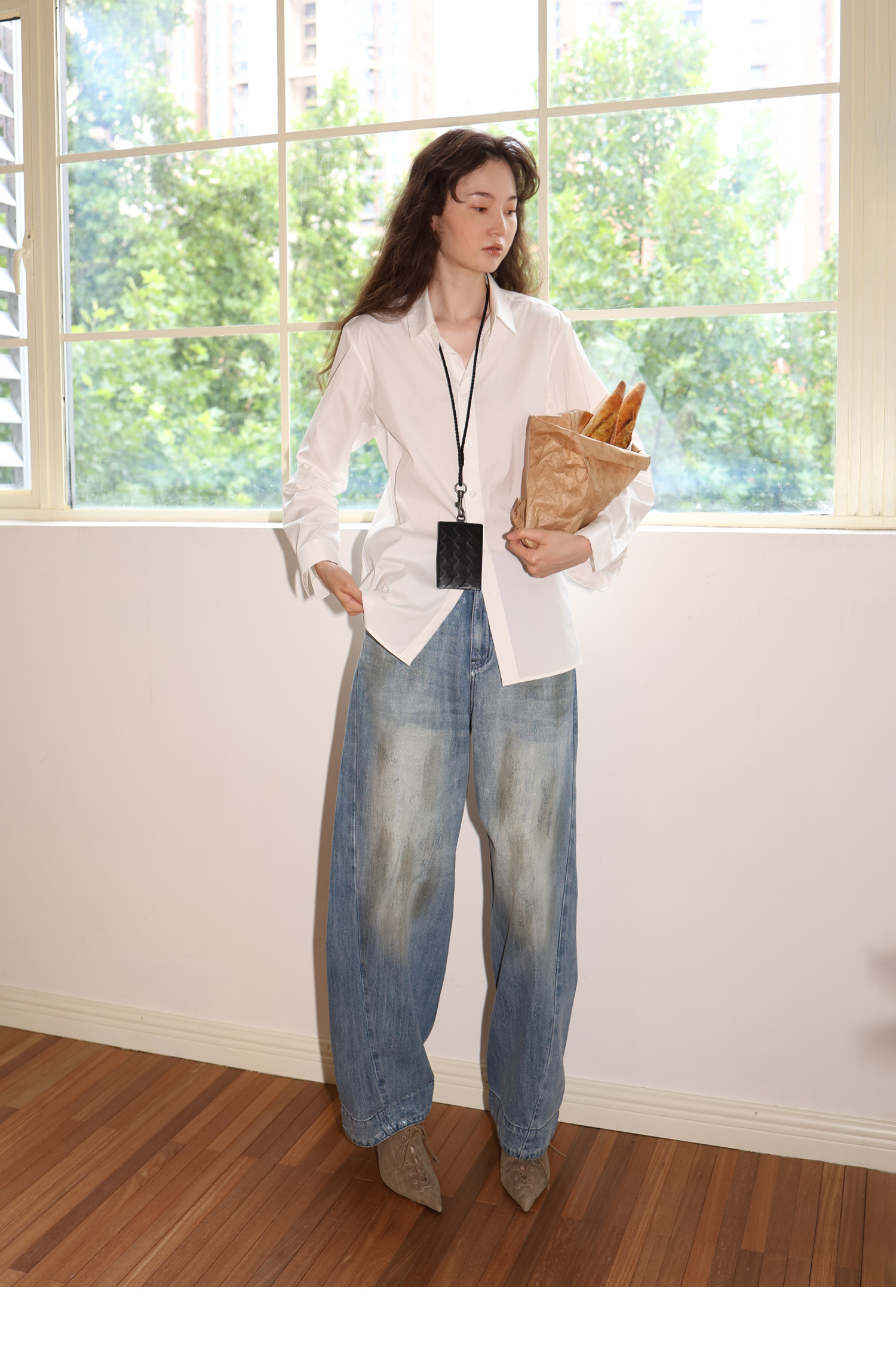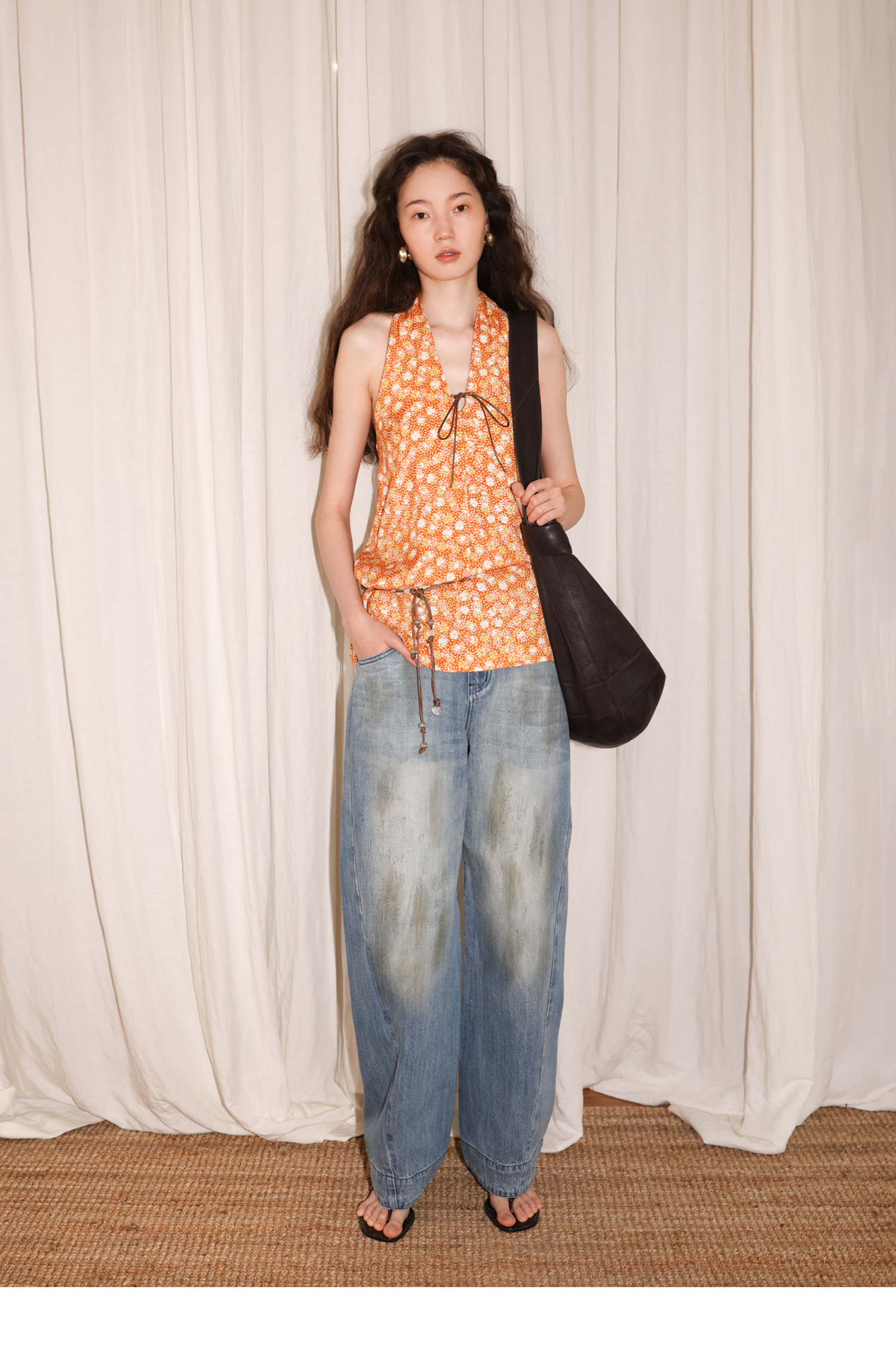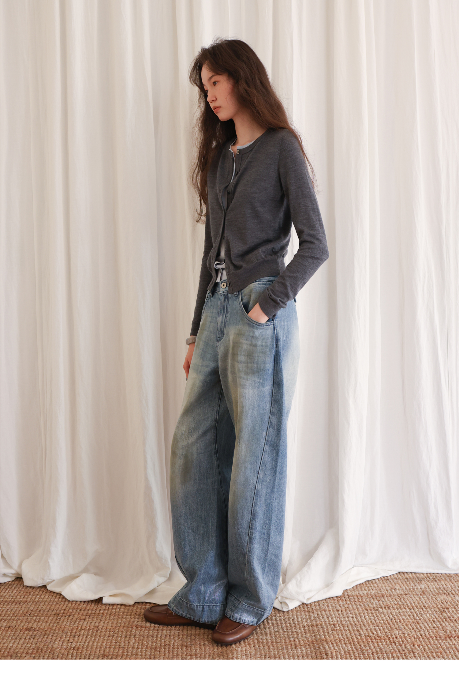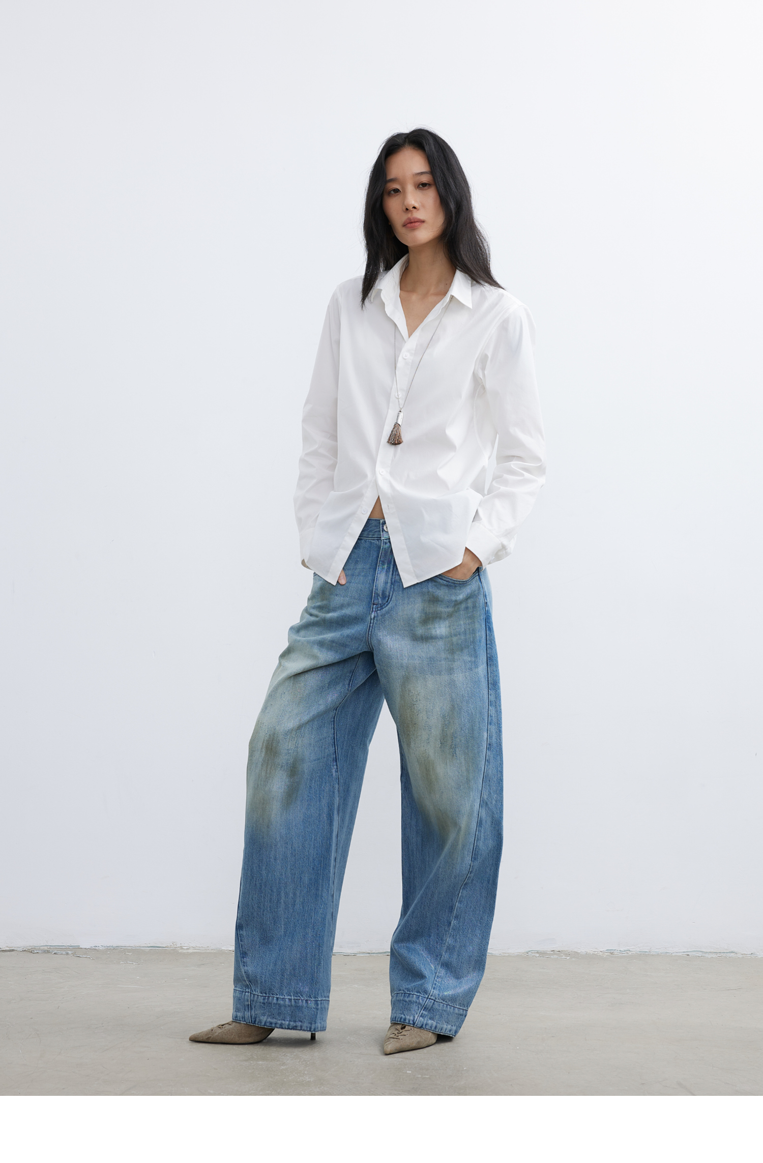 素舶 全棉牛仔面料舒适透气闪粉人鱼姬涂层抹脏宽松弯刀牛仔裤