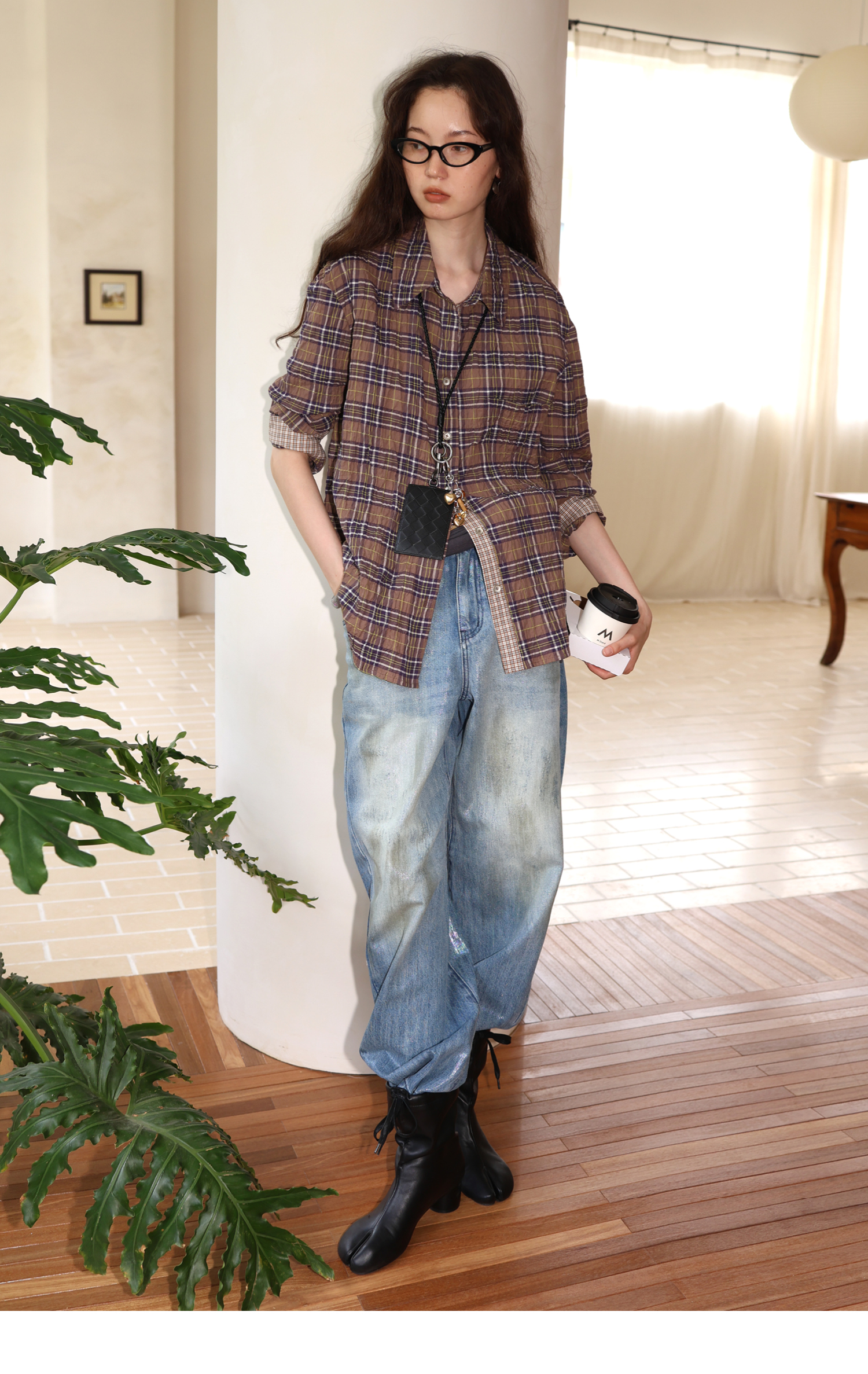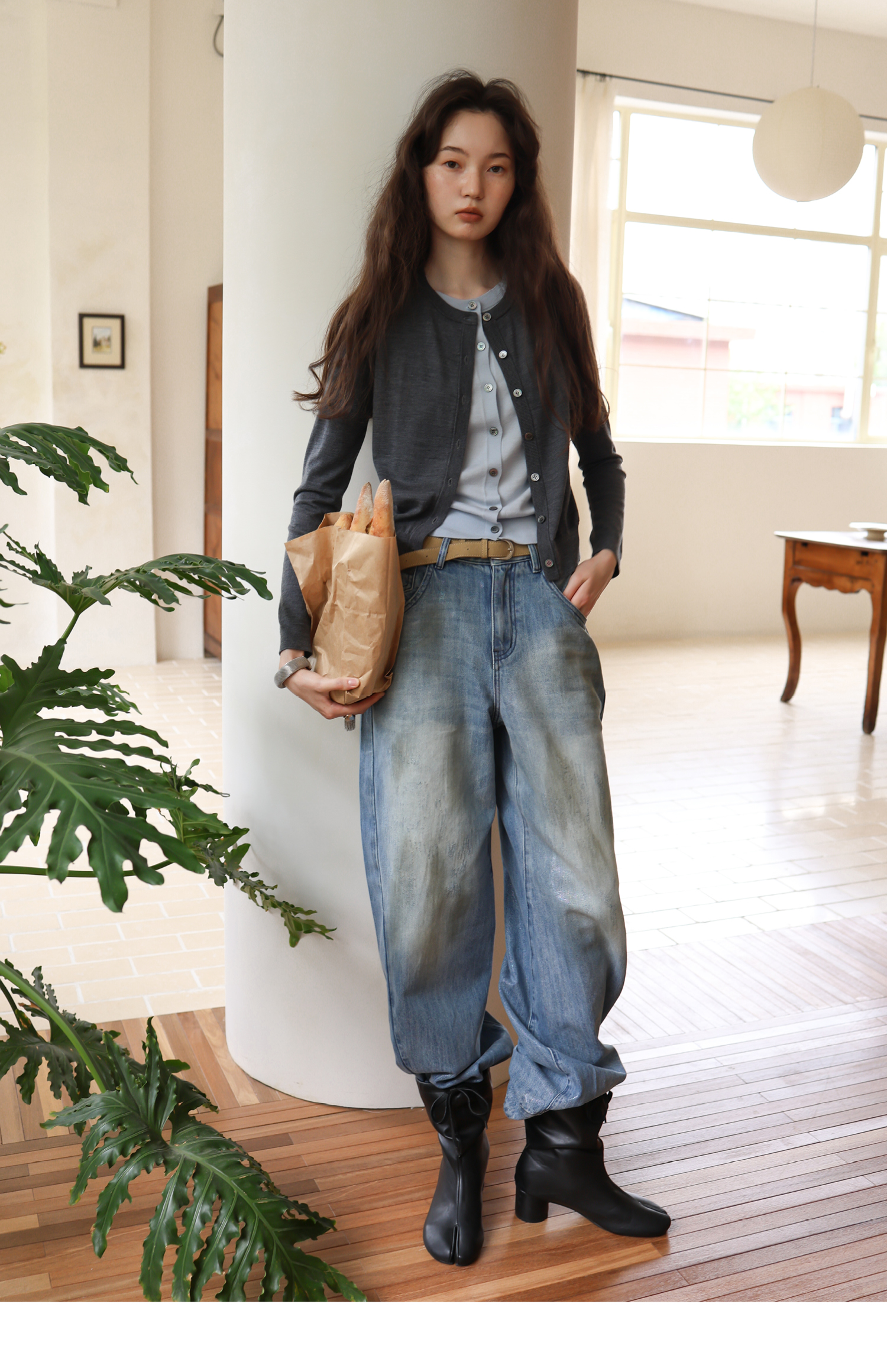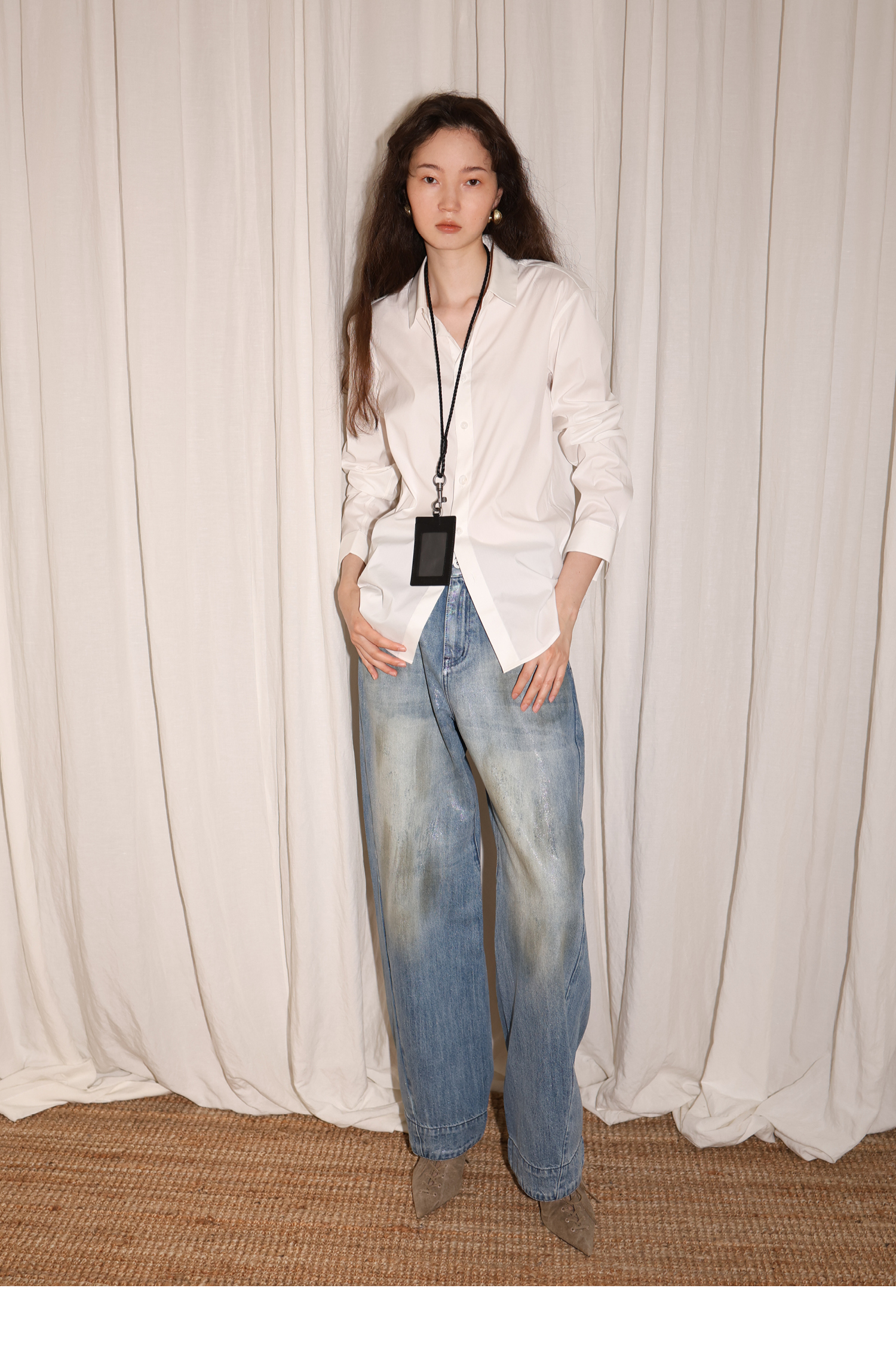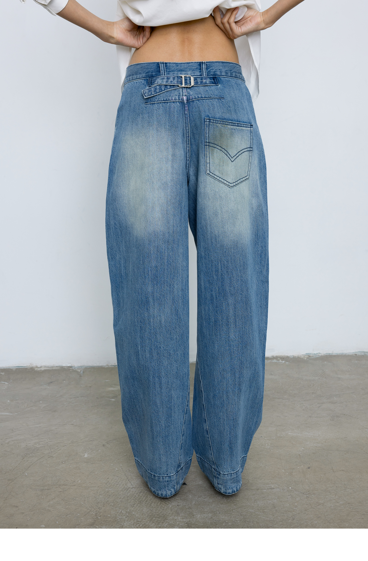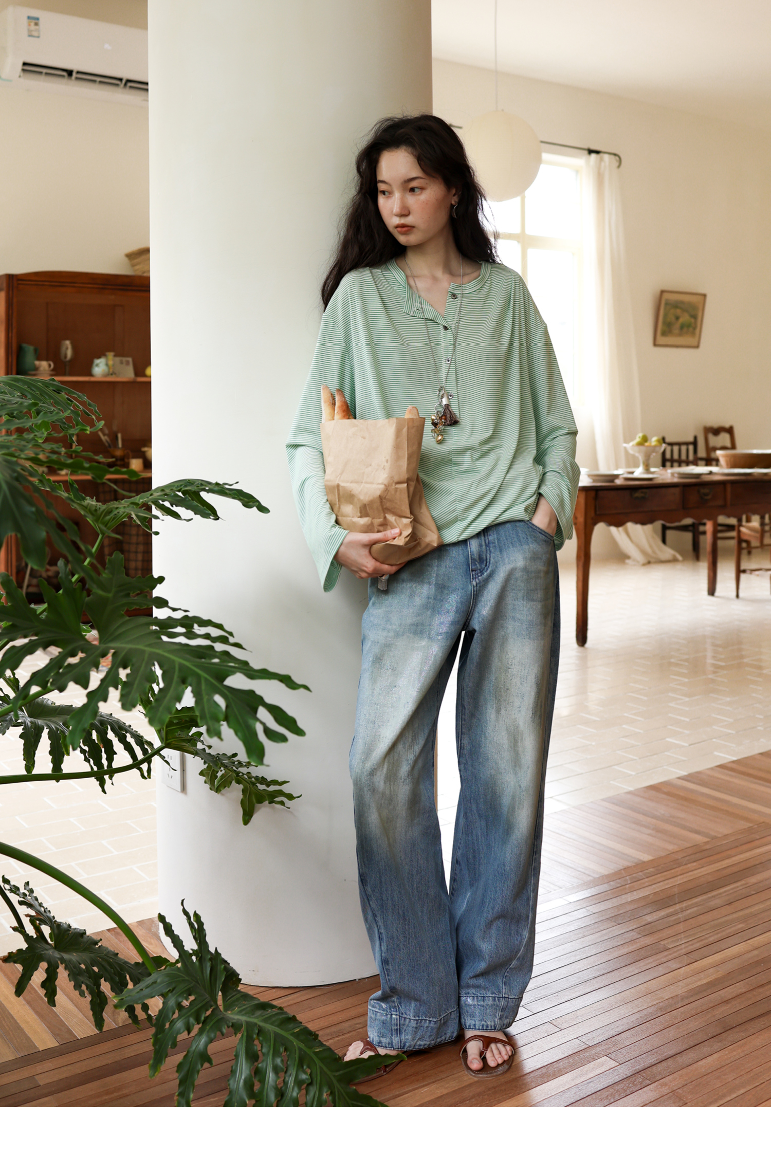 素舶 全棉牛仔面料舒适透气闪粉人鱼姬涂层抹脏宽松弯刀牛仔裤
