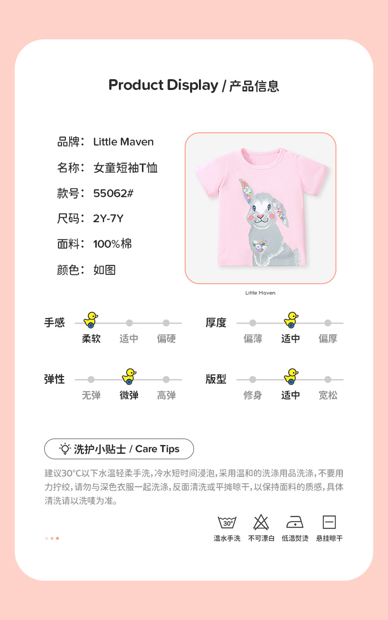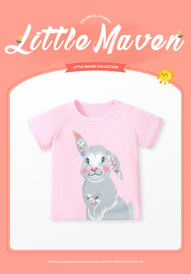 【可爱清新 舒适柔软】Little maven儿童短袖上衣夏季新款纯棉女童T恤卡通胶印圆领童T恤