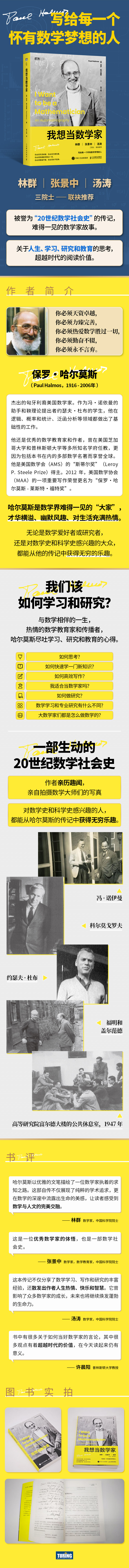 本书是*数学家保罗·哈尔莫斯的自传,也是他为自己所处的“数学时代”写下的历史掠影。哈尔莫斯因在泛函分析、遍历理论、测度论、布尔代数理论等领域的贡献著称于世。他不仅对整个数学领域的研究保持着浓厚兴趣,而且始终关注着数学世界的人与事。读者可在本书中看到上百位数学家的身影。哈尔莫斯讲述了他们的趣闻轶事,为他们拍照留念,让读者对这群数学家产生*而感性的认识。这本书堪称20世纪的数学“社会史”。同时,作者谈到如何学习、如何做研究、如何营造良好的学习和学术环境,讲述了自己对数学的理解,以*身经历告诉读者,什么是真正的数学家和数学研究,以及怎样才能成为一名数学家。 本书适合数学爱好者、数学研究人员,以及对数学史和科学史感兴趣的大众读者阅读。