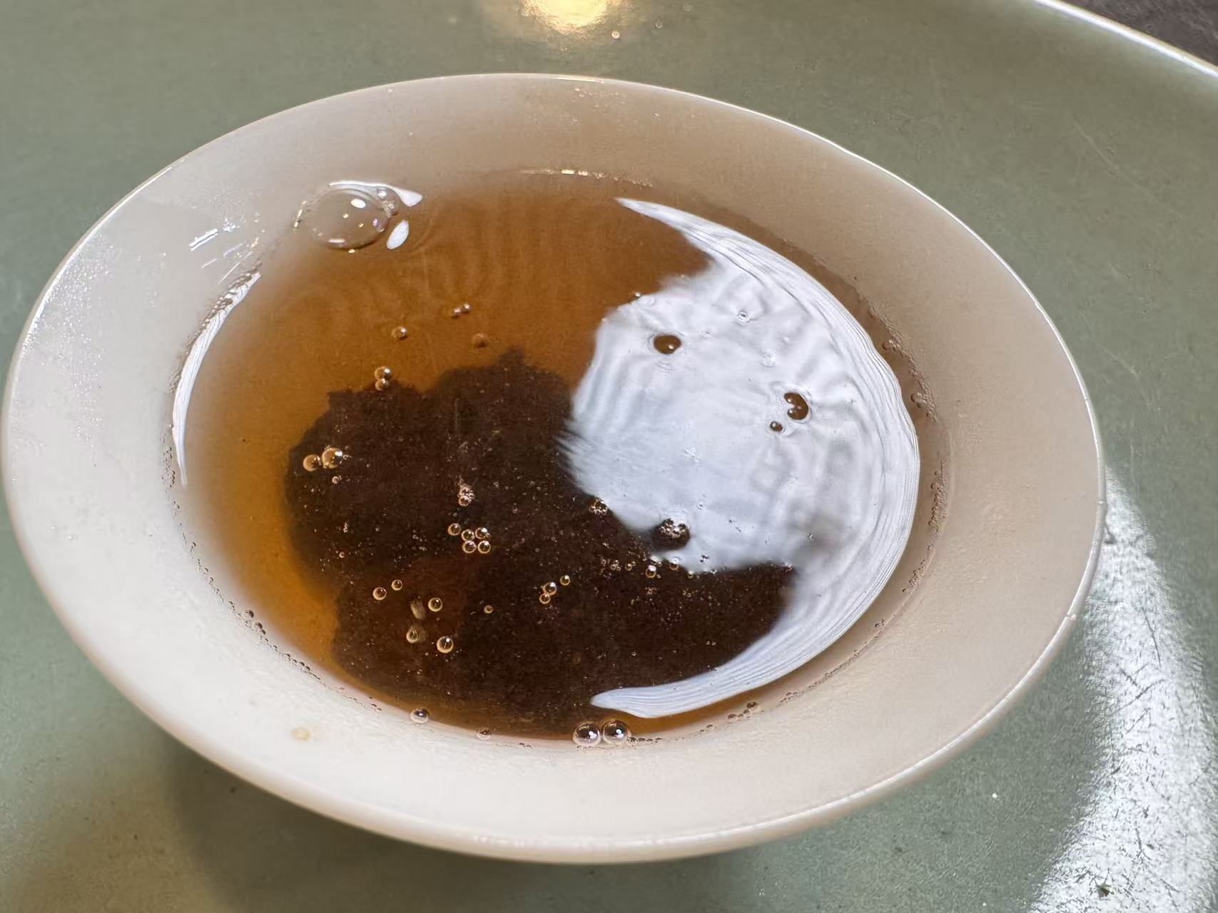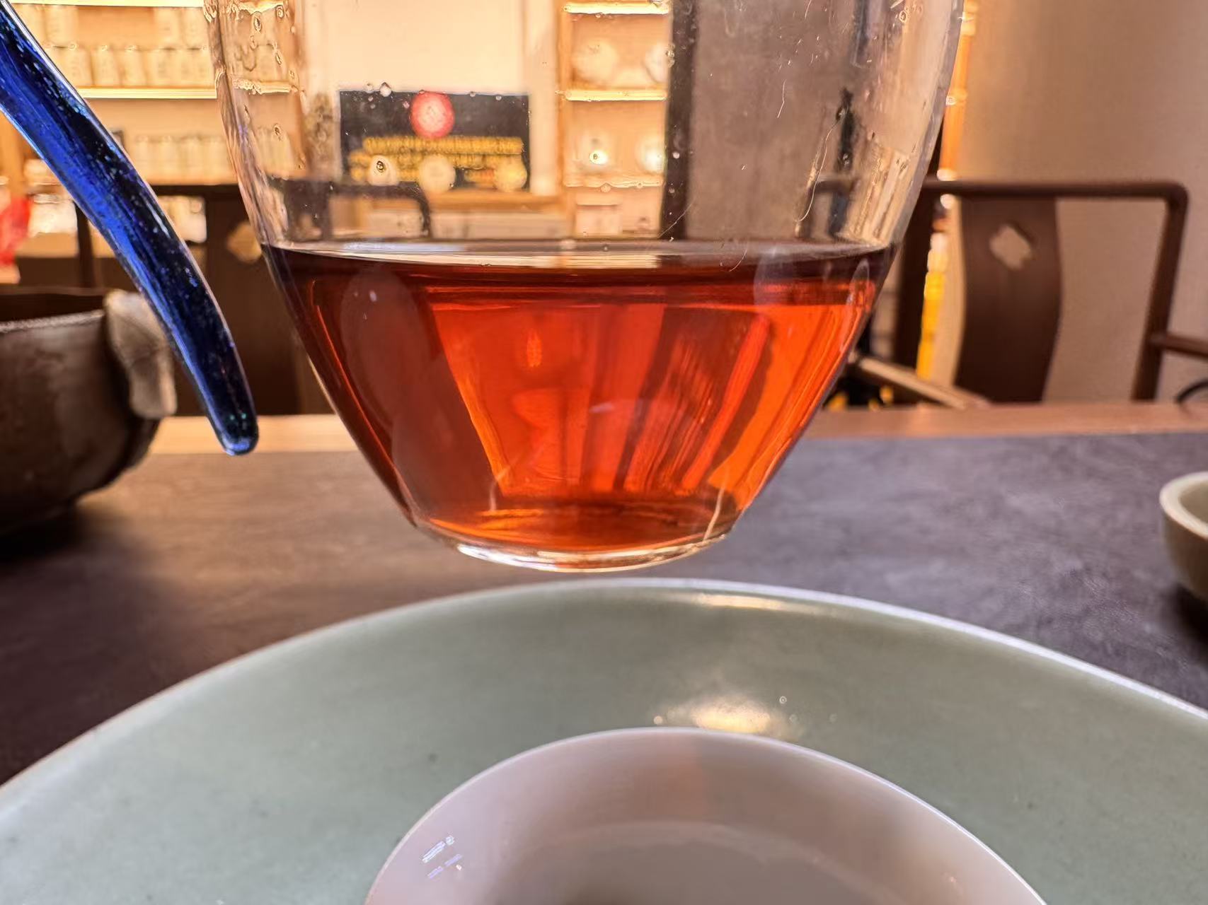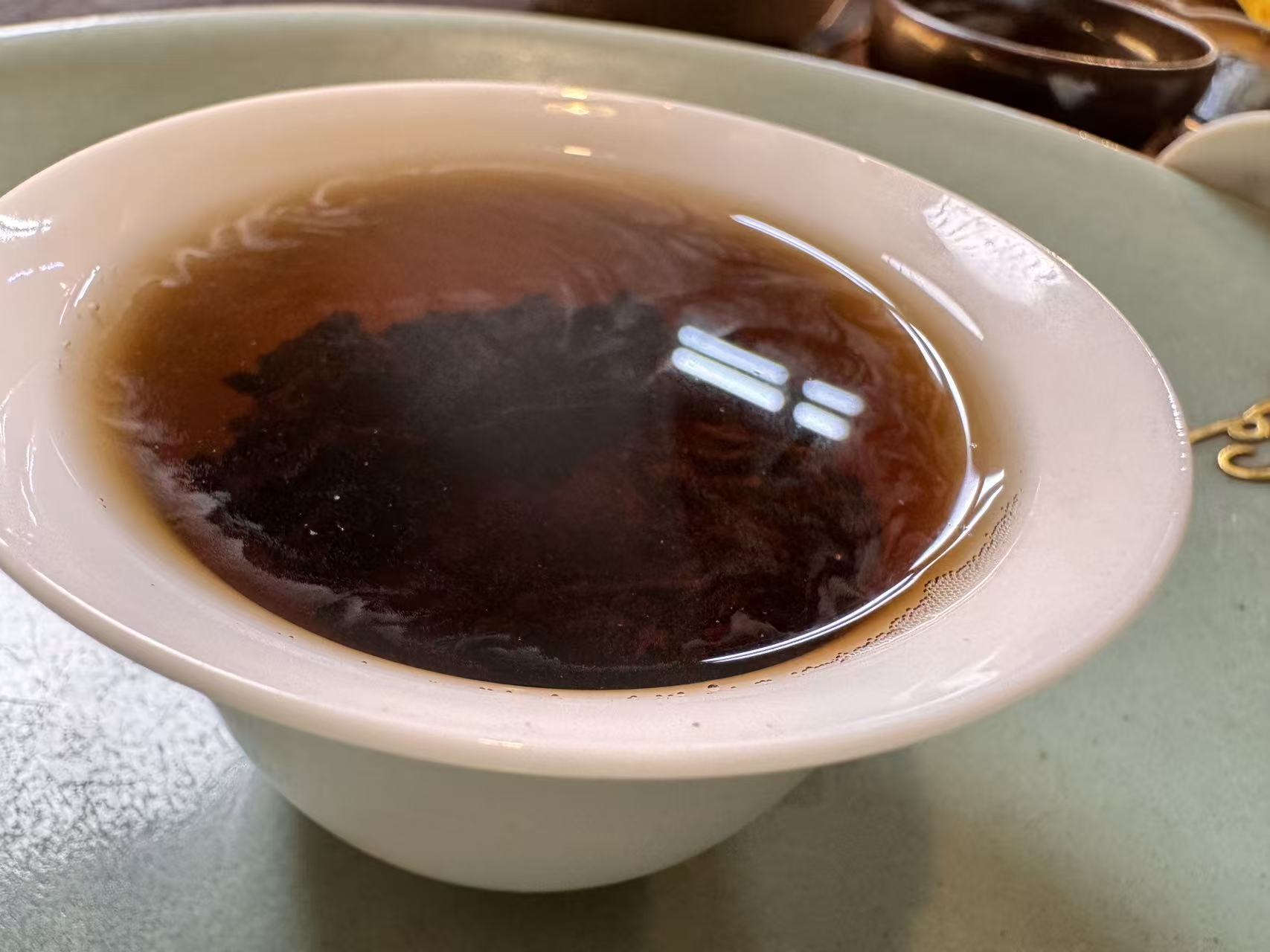 这几道是精华期,汤色红浓透亮,稠感明显,像米汤一样包裹舌头。果香里隐约有木质陈香,喉韵甜润持久。老茶头的耐泡优势开始展现——茶块慢慢释放,味道稳而饱满。