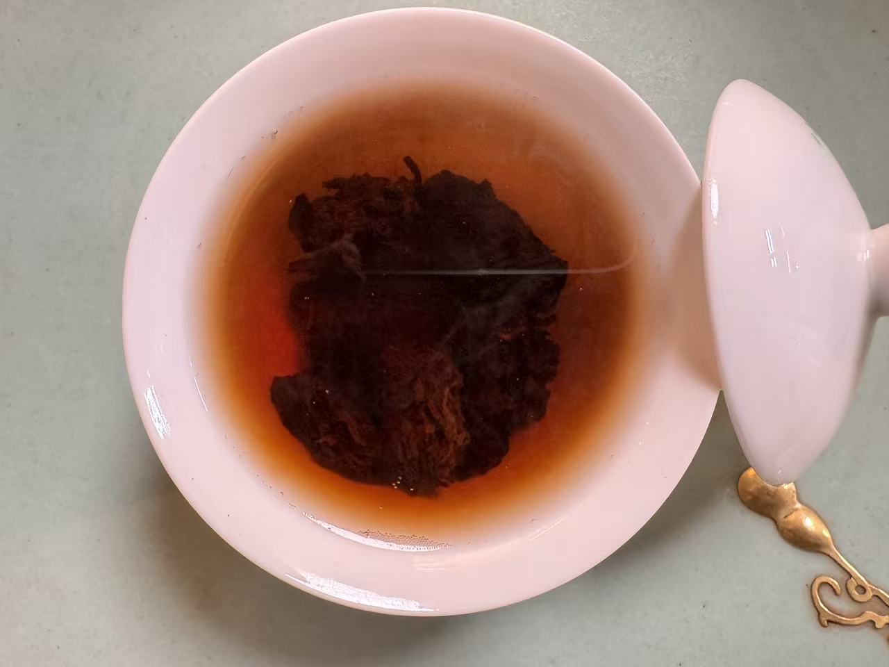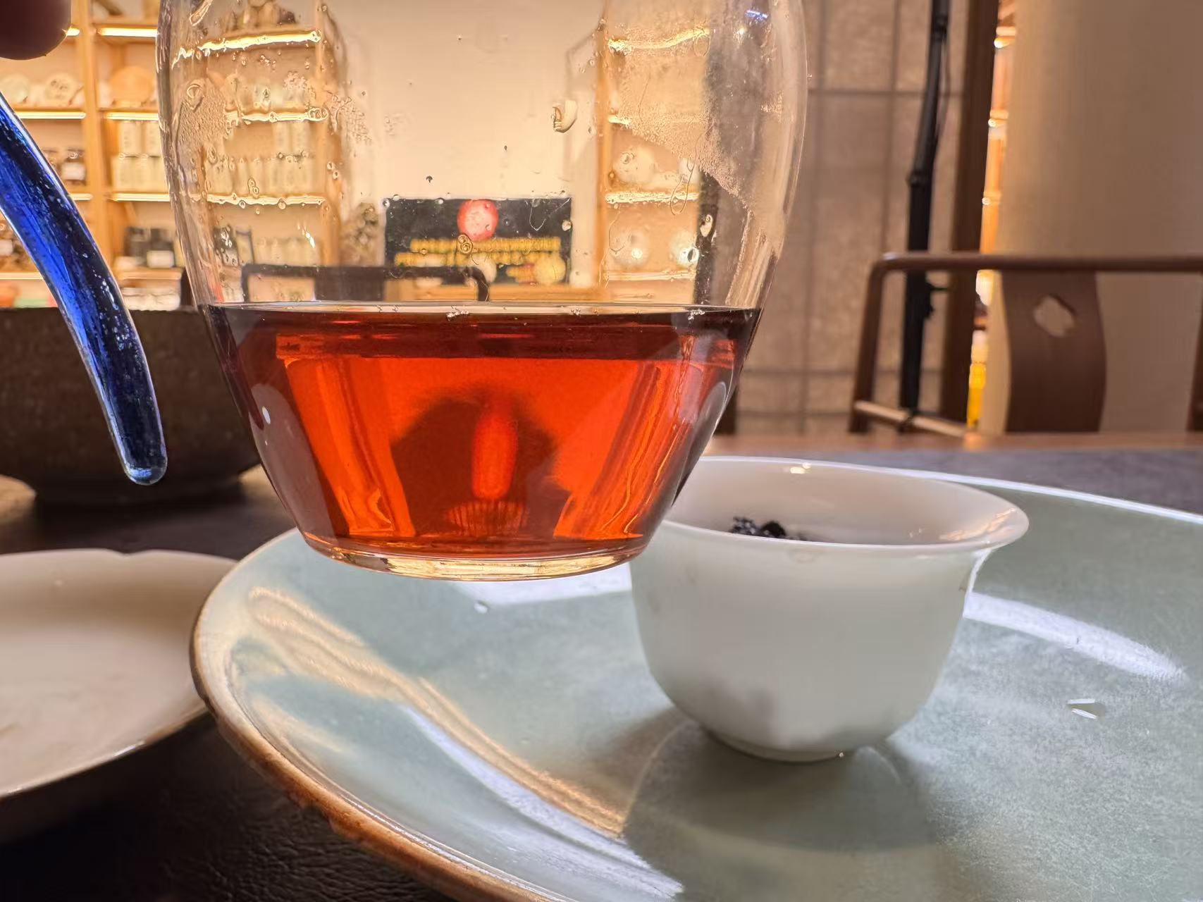 茶味出来了,汤色转为栗红。入口有细腻的果甜香,类似熟透的野果子。茶汤已经显厚,滑过喉咙很顺,不涩不燥——这是那卡生态乔木料的底子,发酵度把握得刚好,既醇和又不失活性。