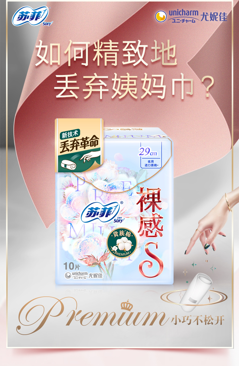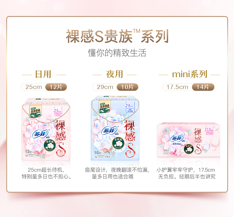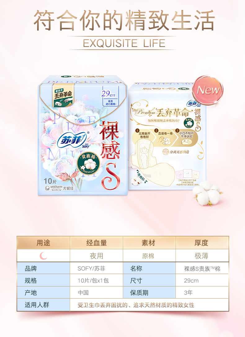 苏菲卫生巾裸感S贵族棉29cm夜用极上系列10片姨妈巾