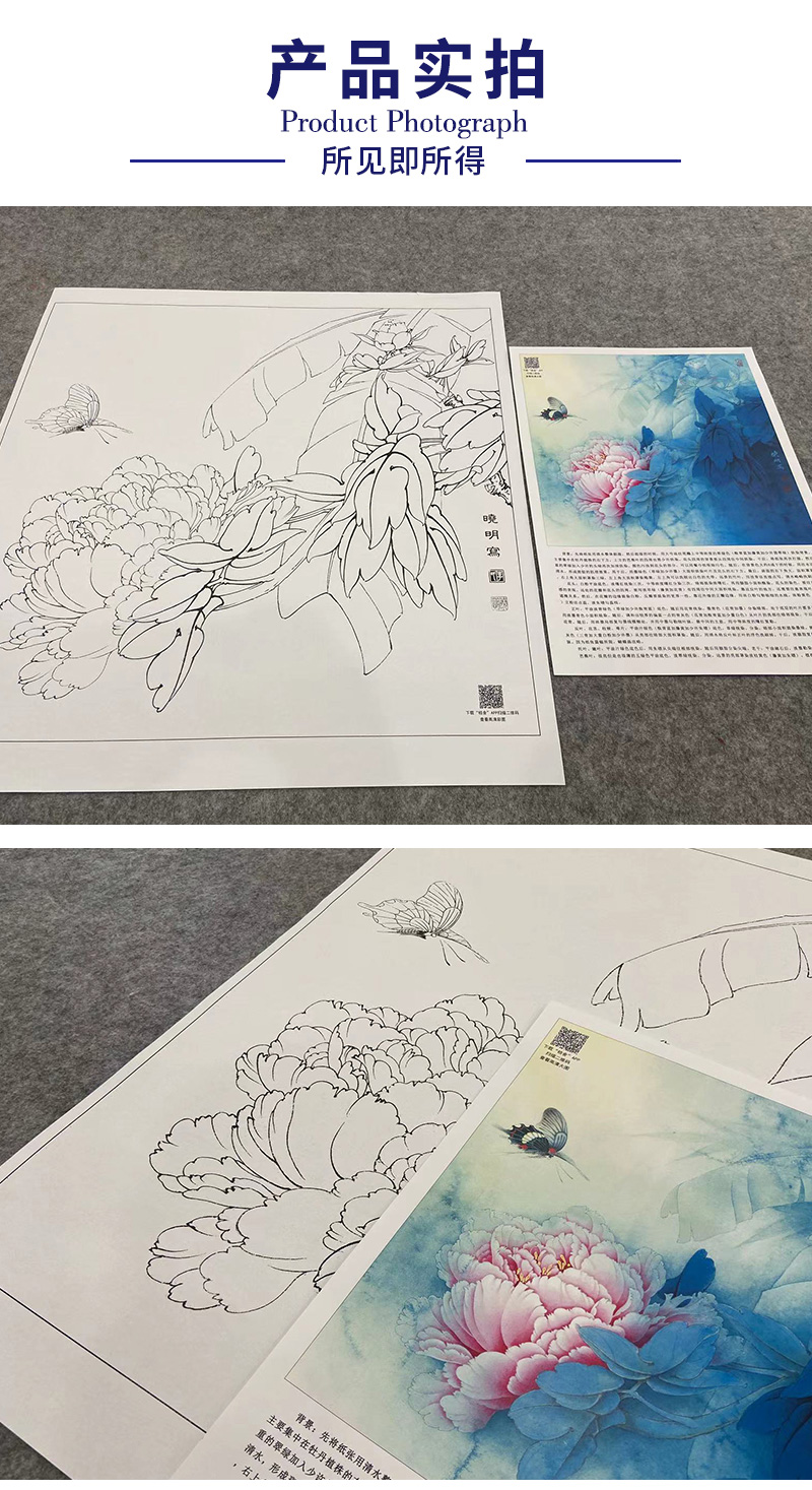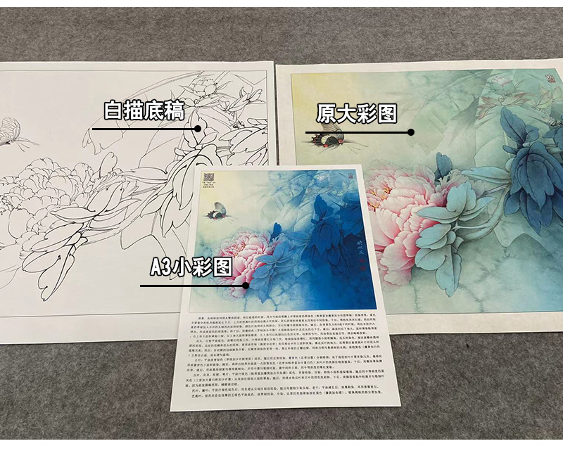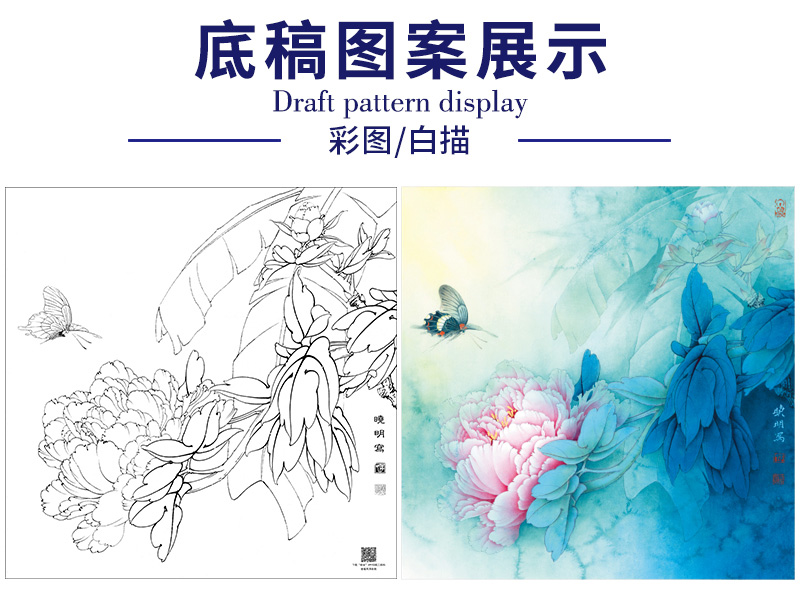 【大彩图】李晓明工笔画白描底稿斗方小品《赵粉凤尾蝶》牡丹临摹勾线花鸟线稿KA09