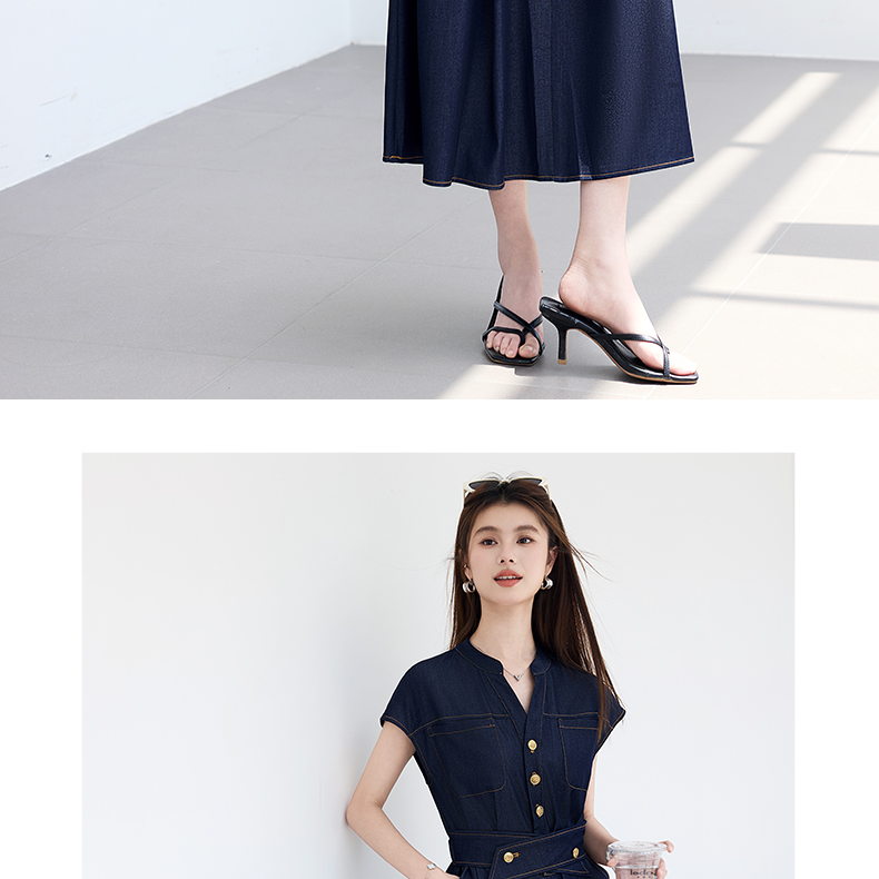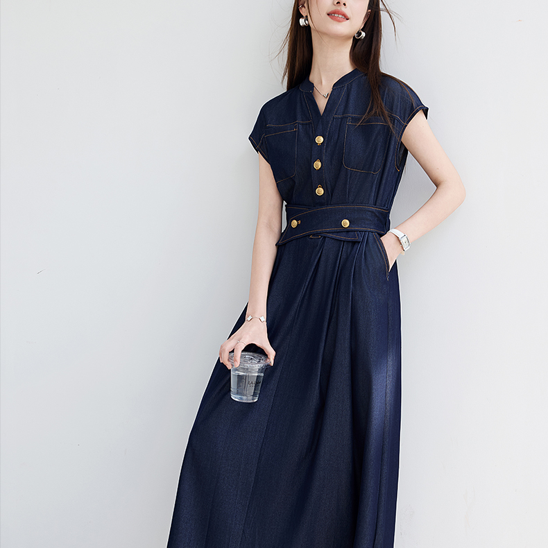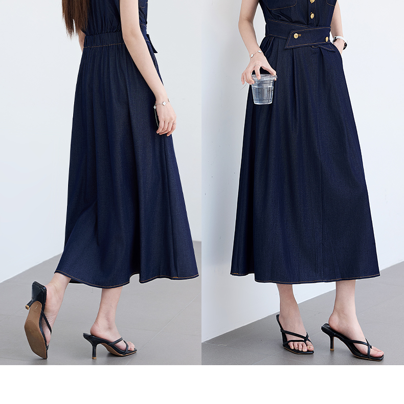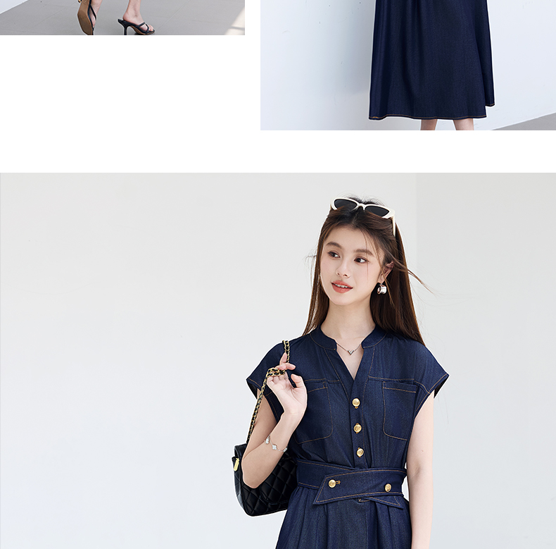 VICTORIA&VERA夏季“影迹交织”仿牛仔无袖连衣裙中长款交叉腰纽扣装饰显瘦遮胯休闲裙---V9013L18