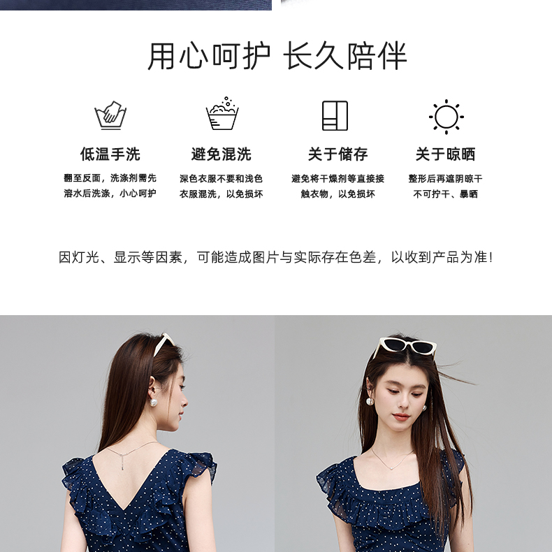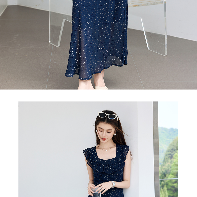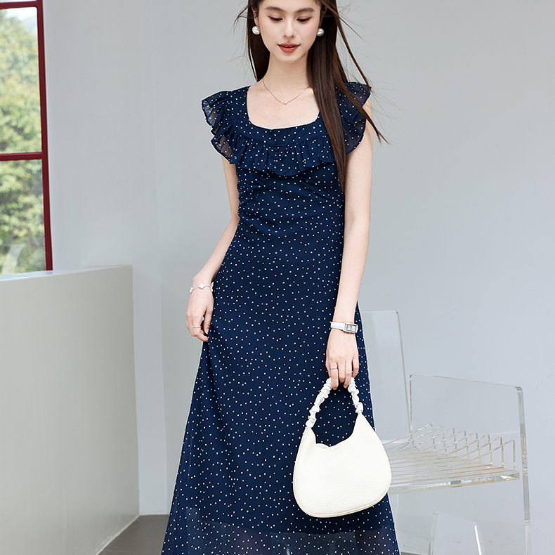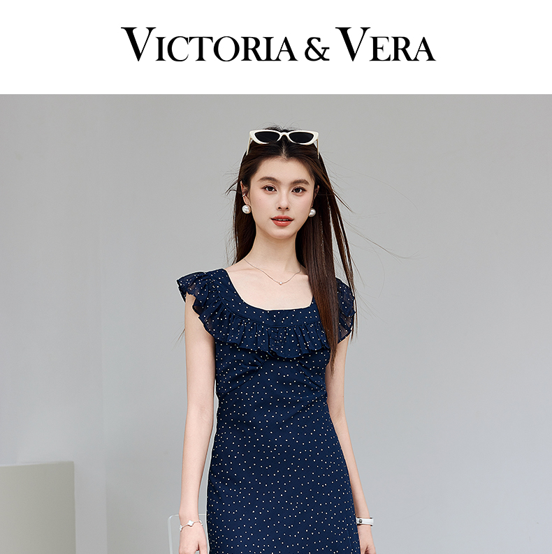 VICTORIA&VERA夏季“复古胶片”法式波点连衣裙荷叶边方领系带收腰显瘦遮副乳通勤度假风---V9013L12