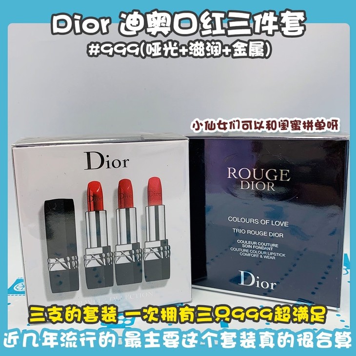 奥口红三件套#999(哑光+滋润+金属)👍每个女孩都应该拥有的Dior999❣三支的套装 一次拥有三只999超满足😊!哑光一定是秋冬的最爱🍁,质感很高级哦💃。滋润款正红色的经典🌟,炒鸡水润💦,涂上气场超强大!金属999感觉是三支里颜色比较深的一支👅,超美呀!细细的金闪✨也是近几年口红流行的。最主要这个套装真的很合算🤗,小仙女们可以和闺蜜拼单呀👯~