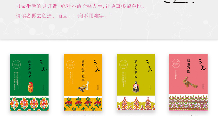 三毛,本名陈懋平,因为学不会写“懋”字,就自己改名为陈平。旅行和读书是她生命中的两颗一级星,快乐与疼痛都夹杂其中,而写作之初纯粹是为了让父母开心。她踏上广袤的撒哈拉,追寻前世的乡愁,和荷西在沙漠结婚,从此写出一系列风靡无数读者的散文作品,把大漠的狂野温柔和活力四射的婚姻生活,淋漓尽致展现在大家面前,“三毛热”迅速从台港横扫整个华文世界。然而荷西的突然离世,让她差点要放弃生命,直到去了一趟中南美旅游,才终于重新提笔写作。接着她尝试写剧本、填歌词,每次出手必定撼动人心。直到有,她又像儿时那样不按常理出牌,逃离到没人知道的远方,继续以自由不羁的灵魂浪迹天涯。