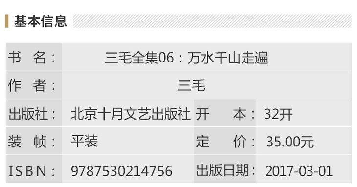 三毛——华文世界里的传奇女子,足迹遍及世界各地。她以一支笔坚持看守个人文字上的简单和朴素;从遥远的撒哈拉到美洲大陆,再到敦煌戈壁,她不随波逐流,也不诠释人生,只做生活的见证者。她是我们心中浪漫、洒脱、真性情的永远的三毛,永恒的传奇。《水山走遍》是荷西去世之后,三毛鼓起生活勇气之作,记录了她在青鸟不到的中南美洲的全新生活。