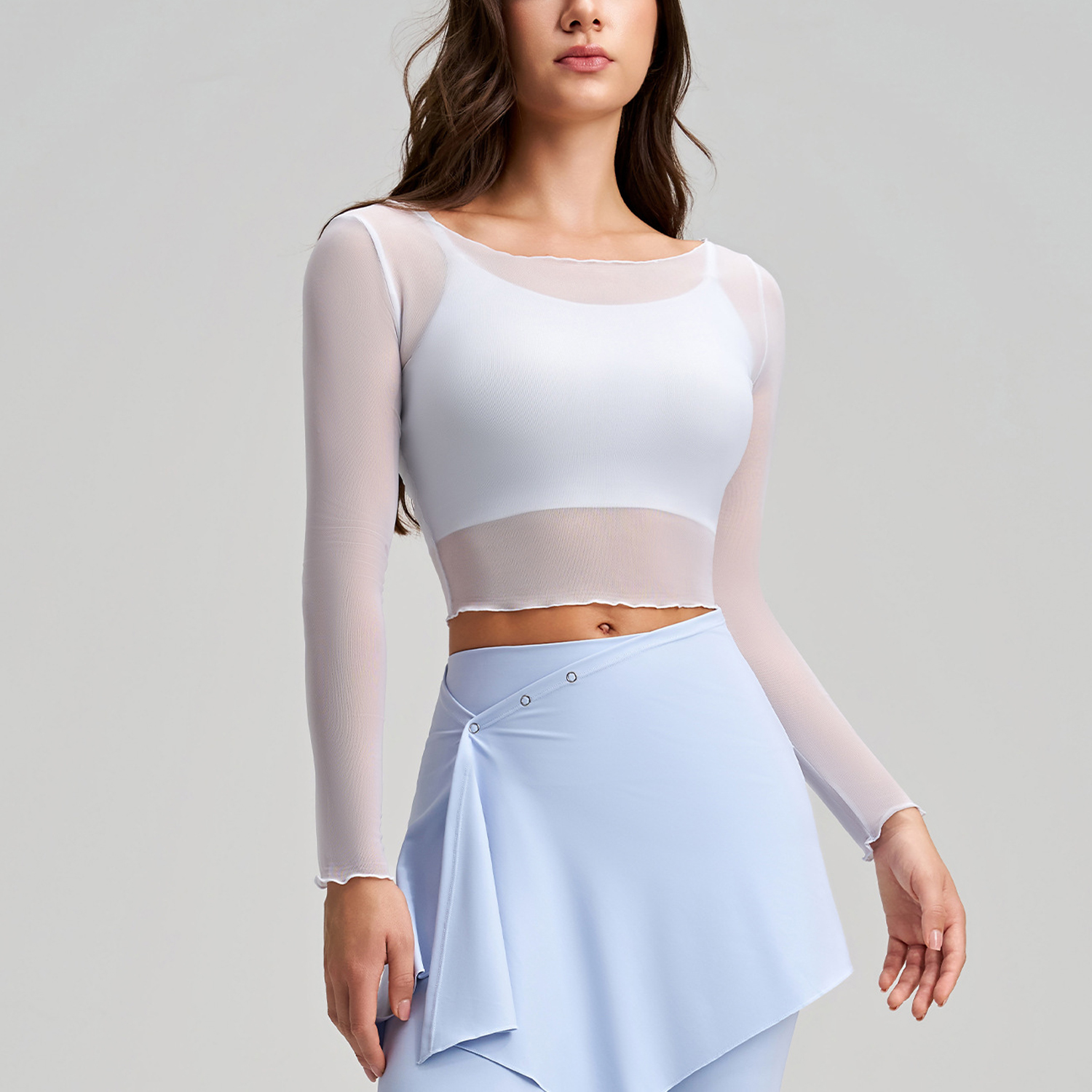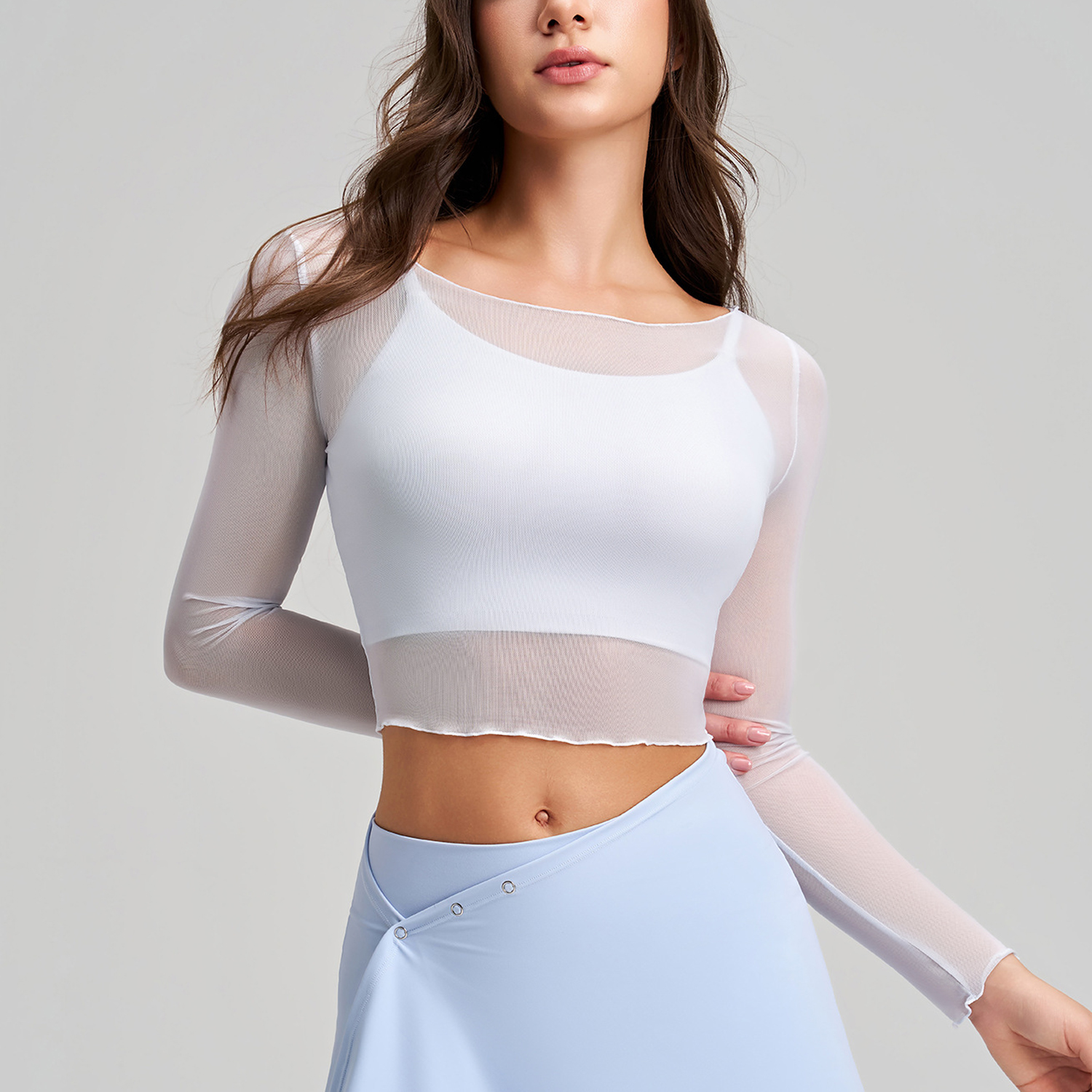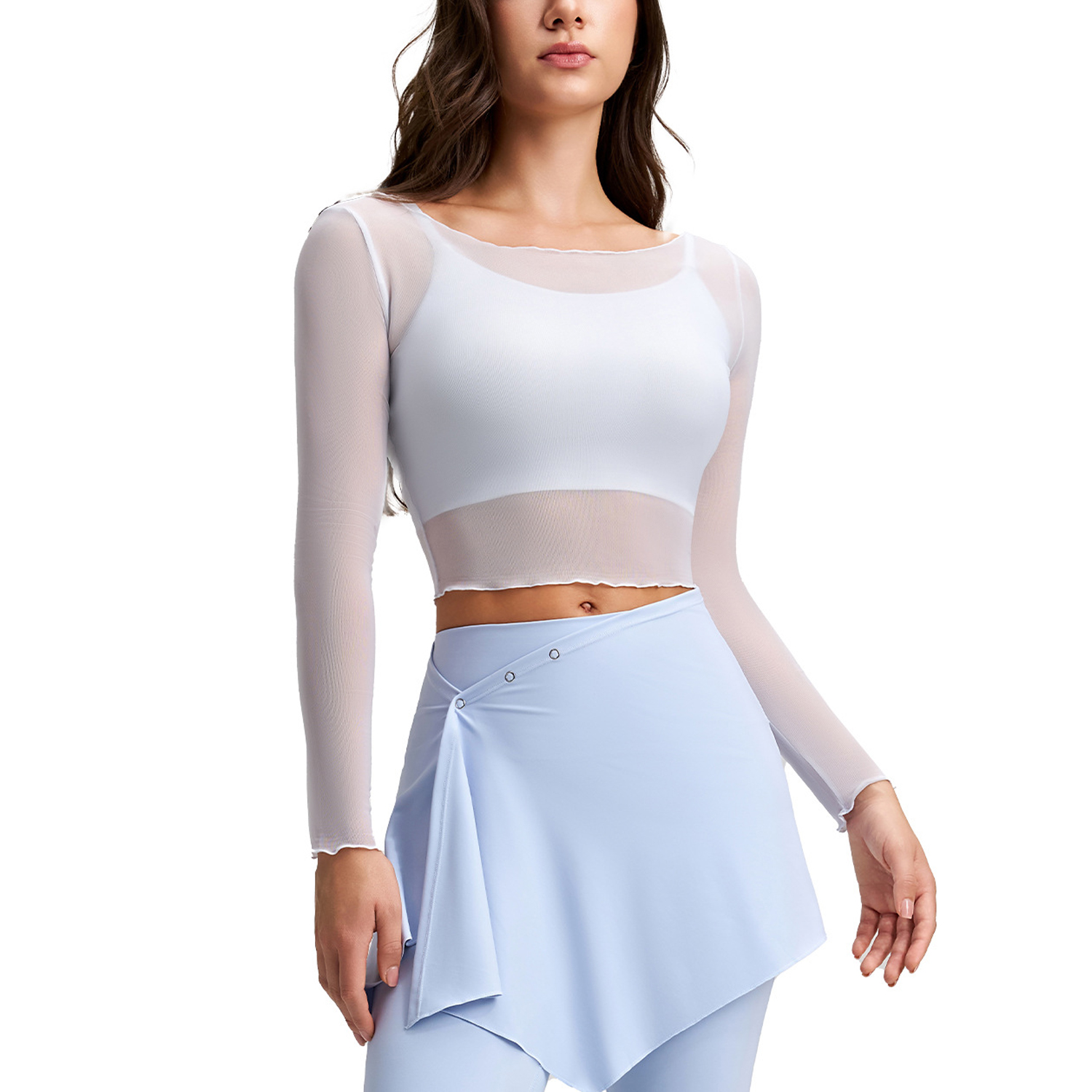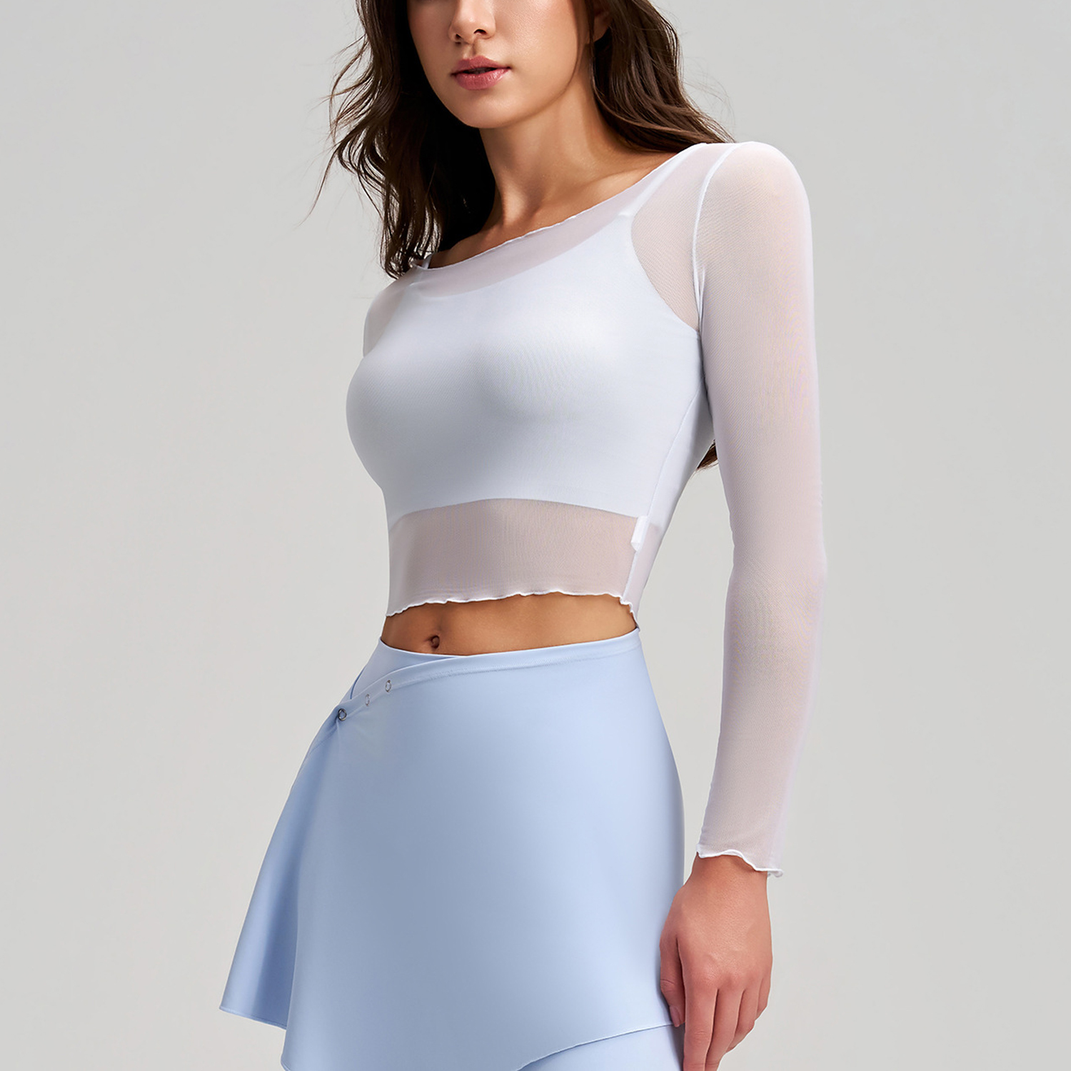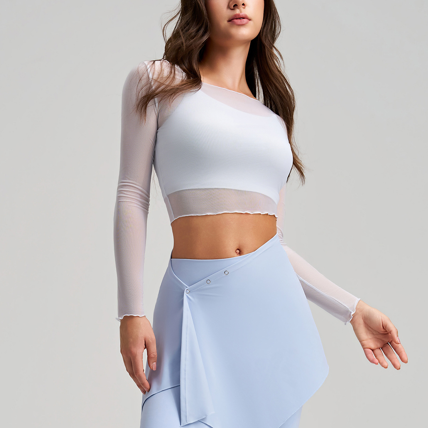 跃牌【安琪拉系列】新款瑜伽服女运动普拉提两件套清新性感网纱花边健身上衣长袖t恤