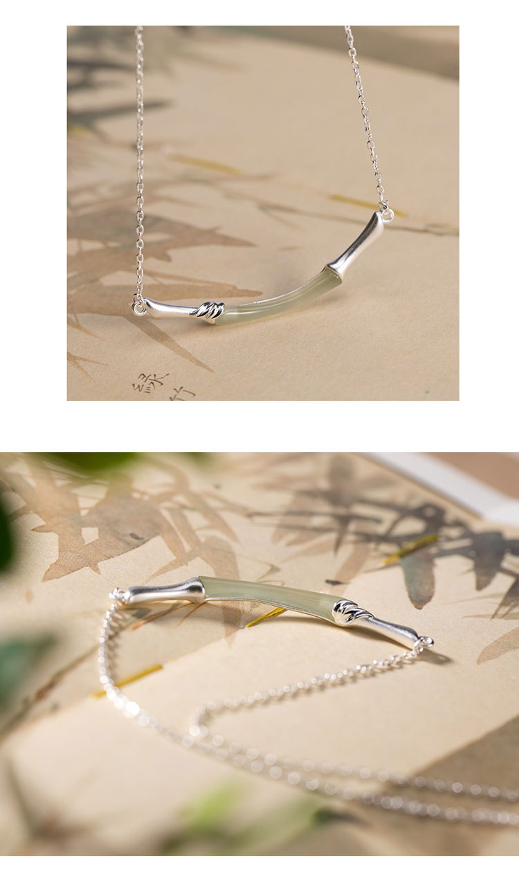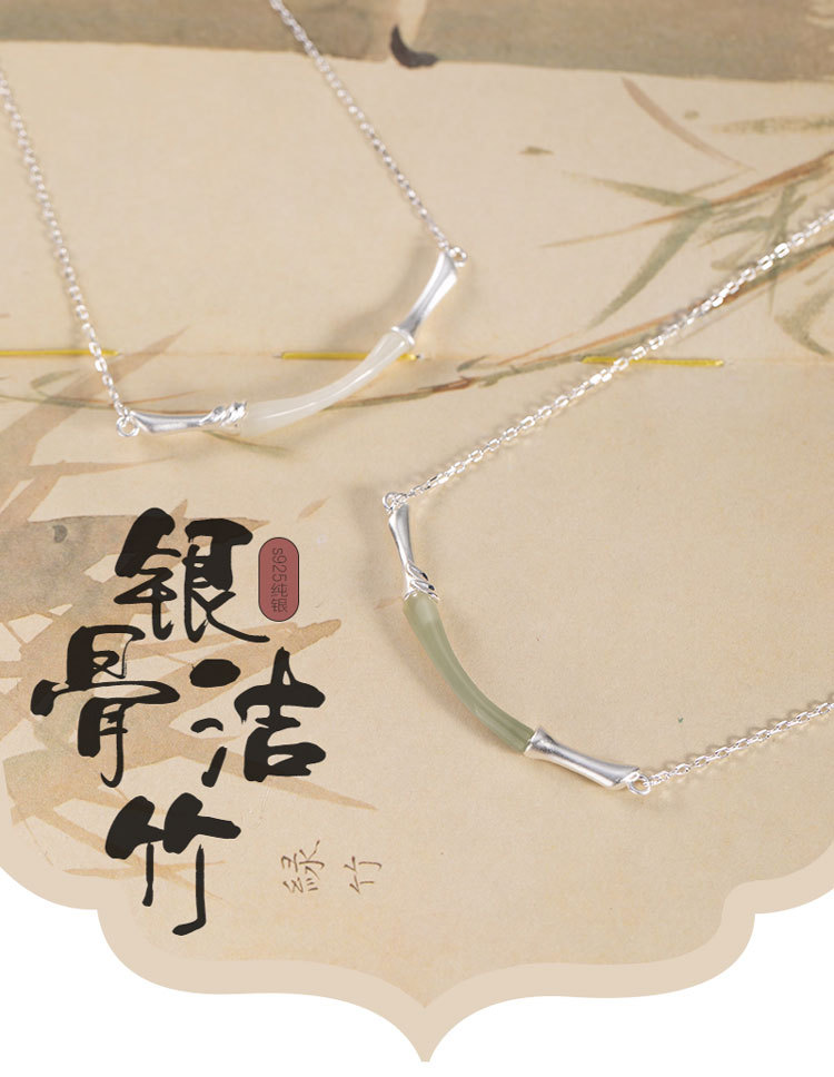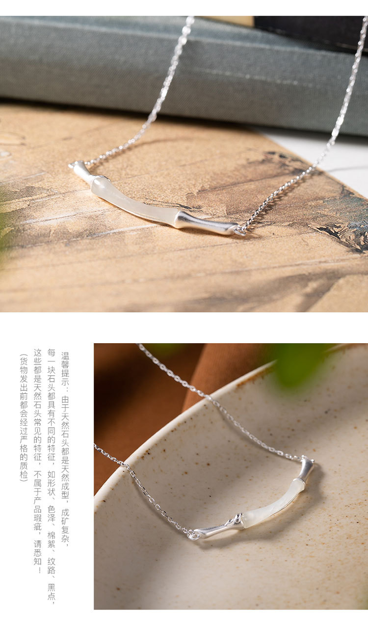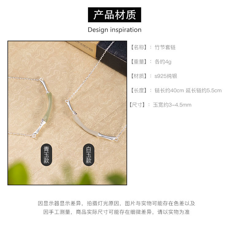 S925纯银镶嵌和田玉白玉竹节磨砂个性百搭锁骨链套链