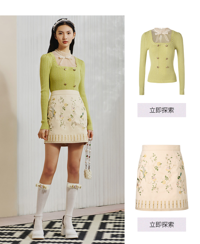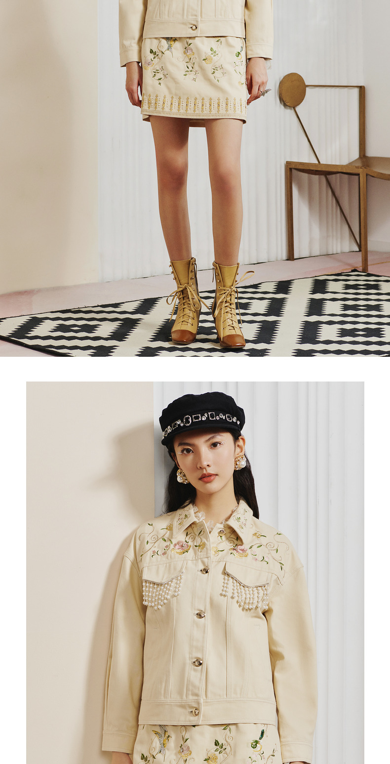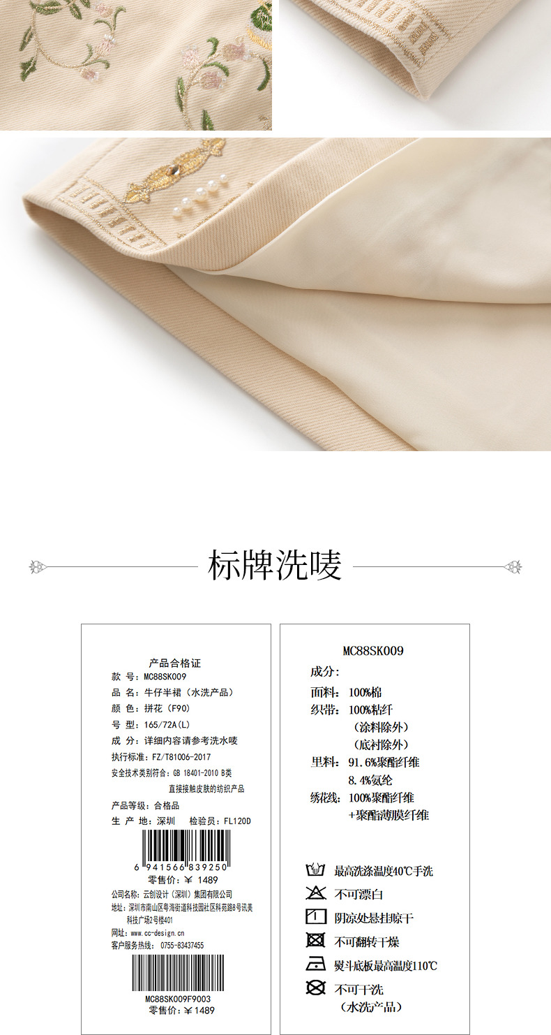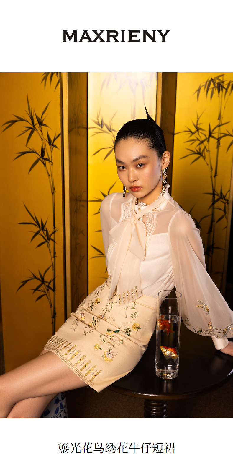 【商场同款】MAXRIENY鎏光花鸟绣花牛仔短裙艺术复古感高腰A字裙(货号:MC88SK009)