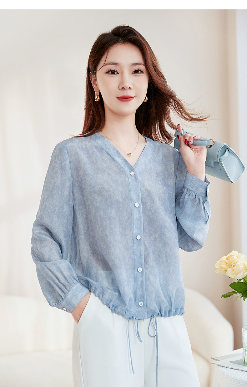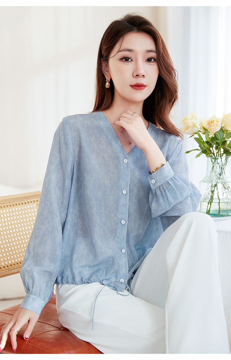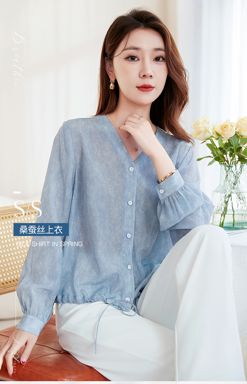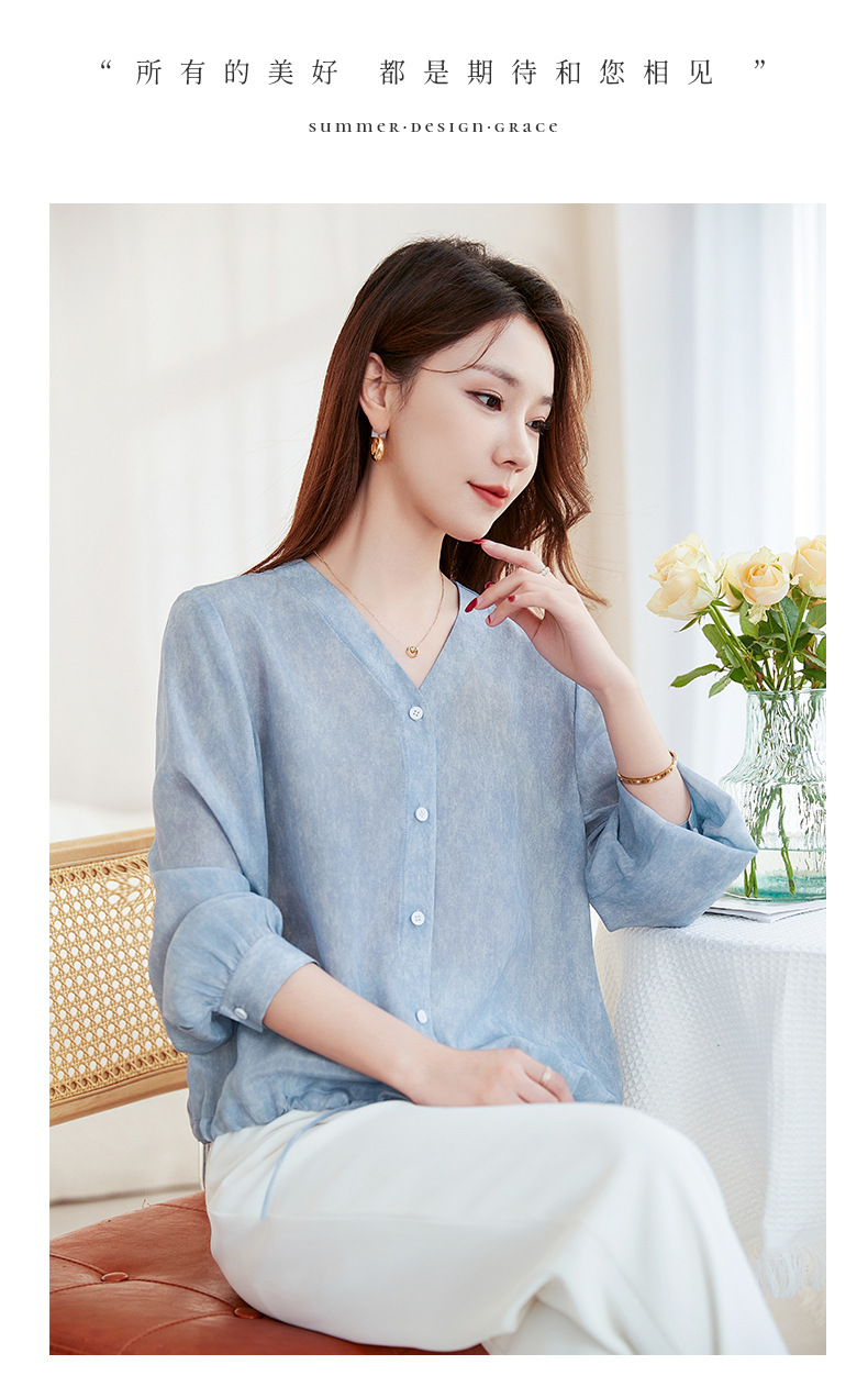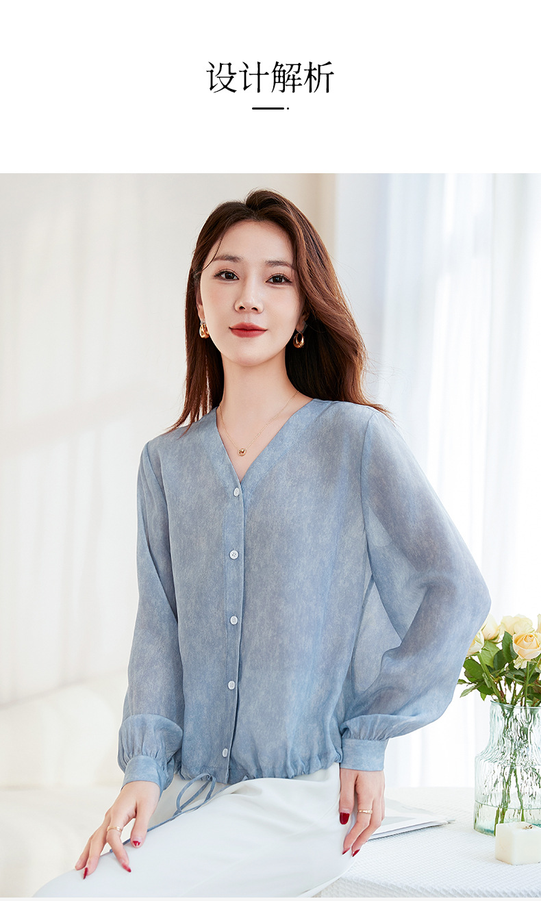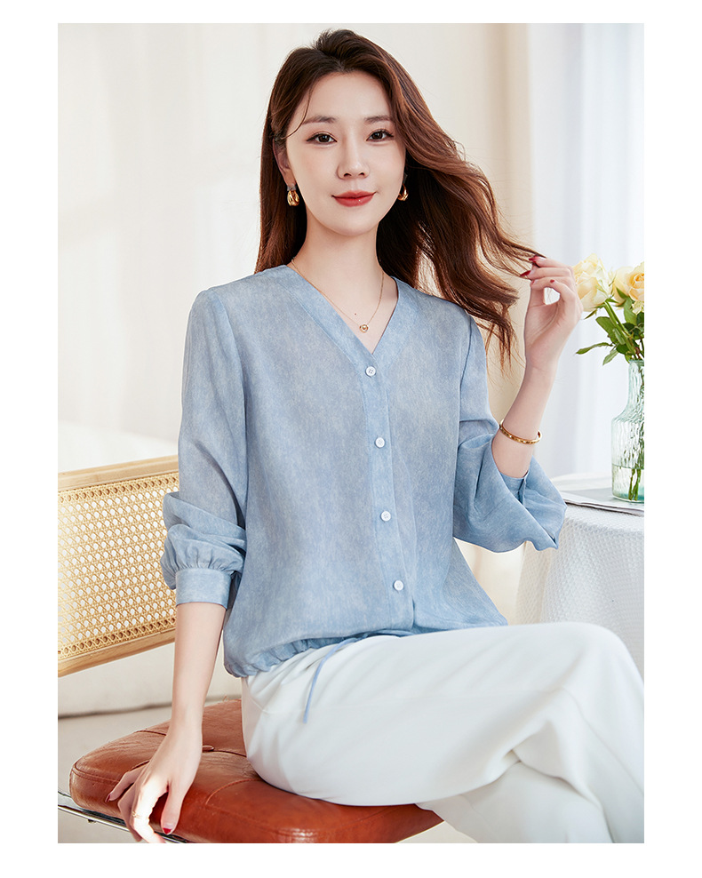 QS-22599658春夏新款真丝V领衬衫桑蚕丝双绉长袖通勤衬衣女22599658