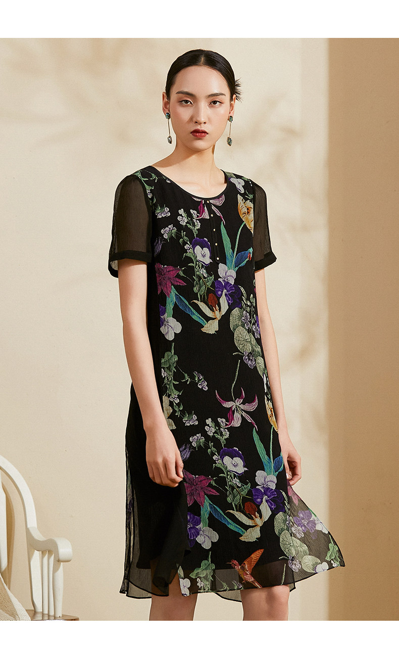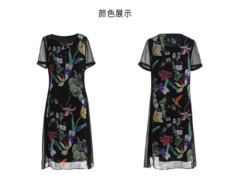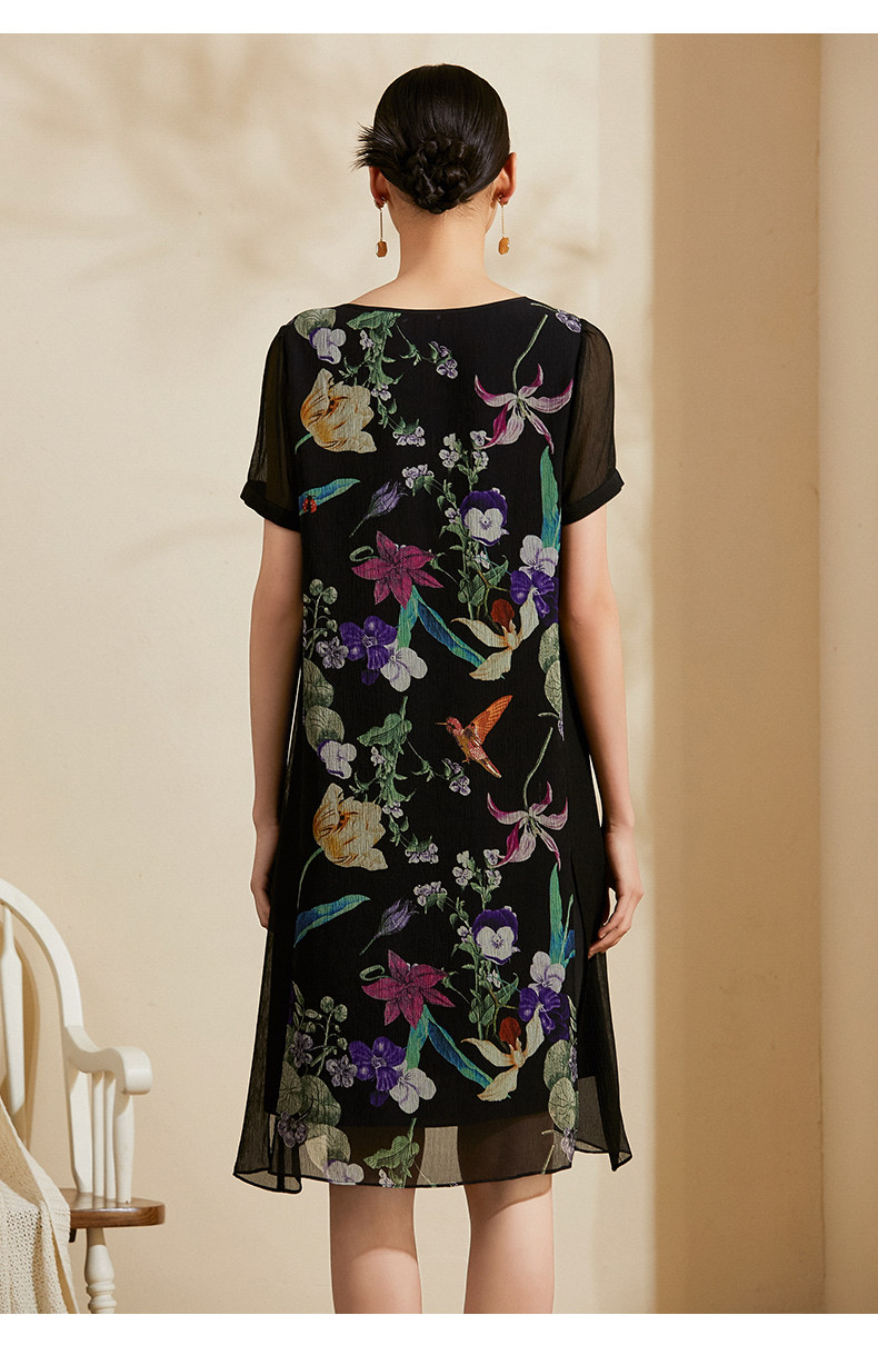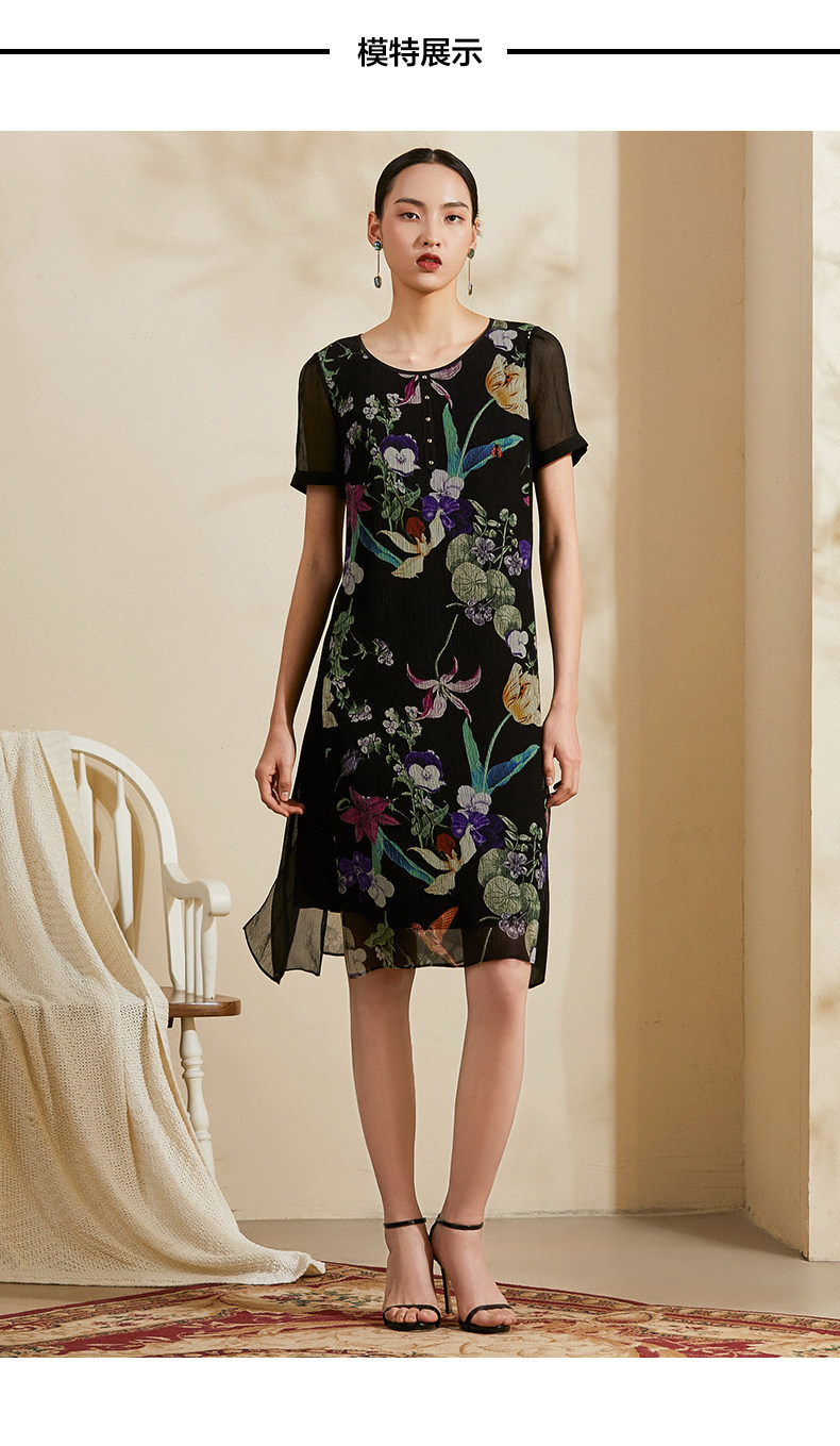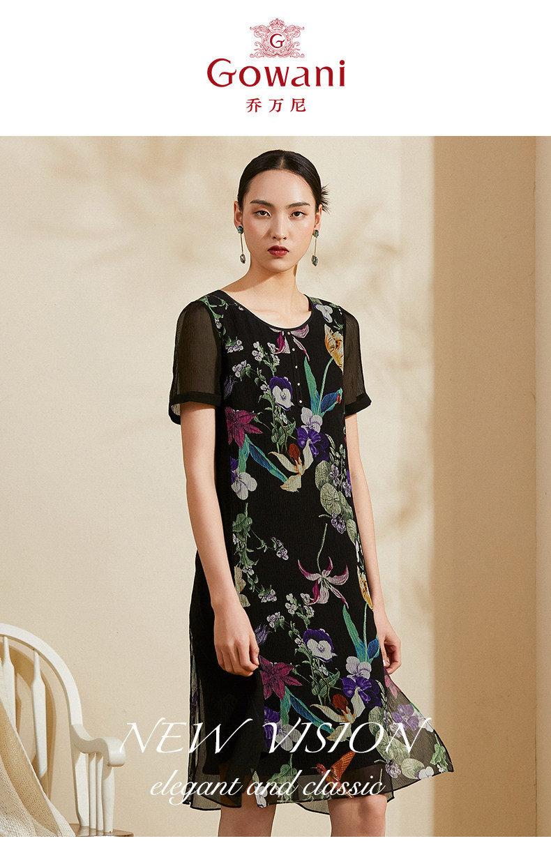 乔万尼真丝桑蚕丝连衣裙夏季新款气质时尚花鸟图中长裙子ES2E143
