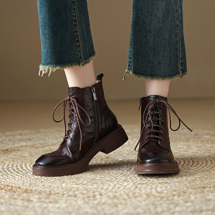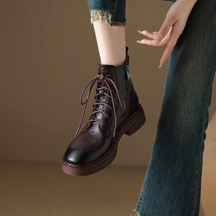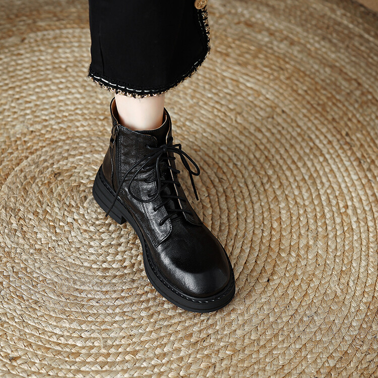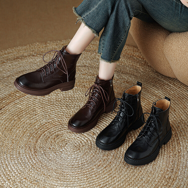 【预售5天】软厚底女士马丁靴新款秋冬复古圆头手抓纹羊皮粗中跟交叉绑带短靴MLJ&C53