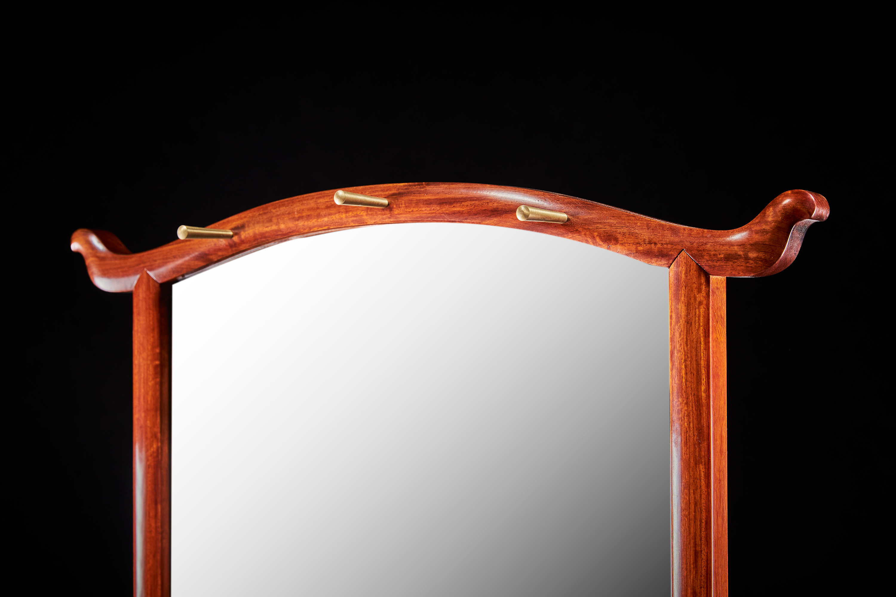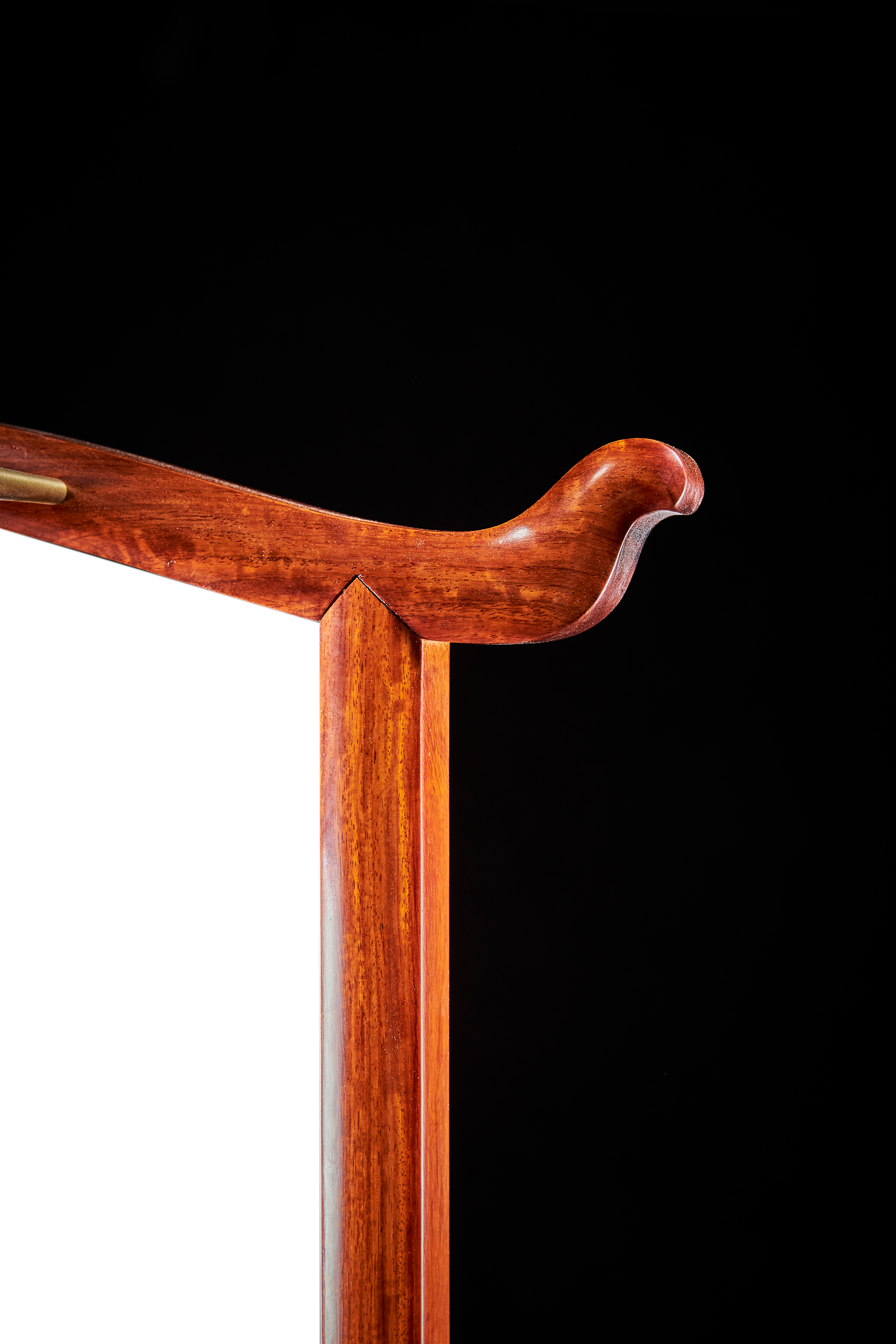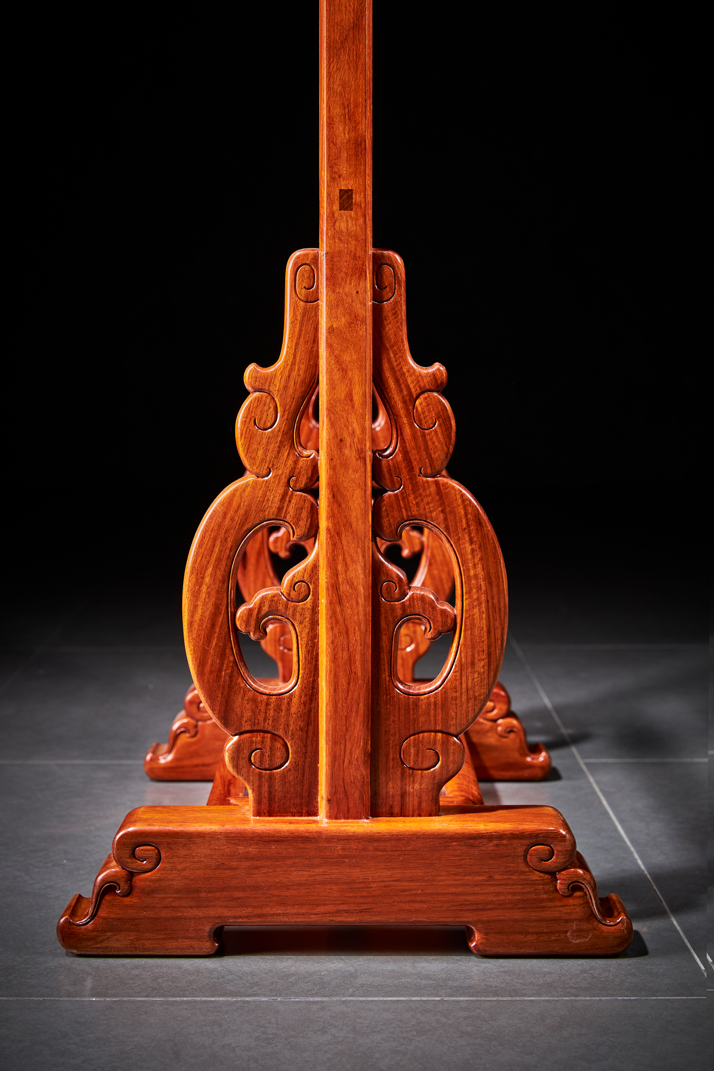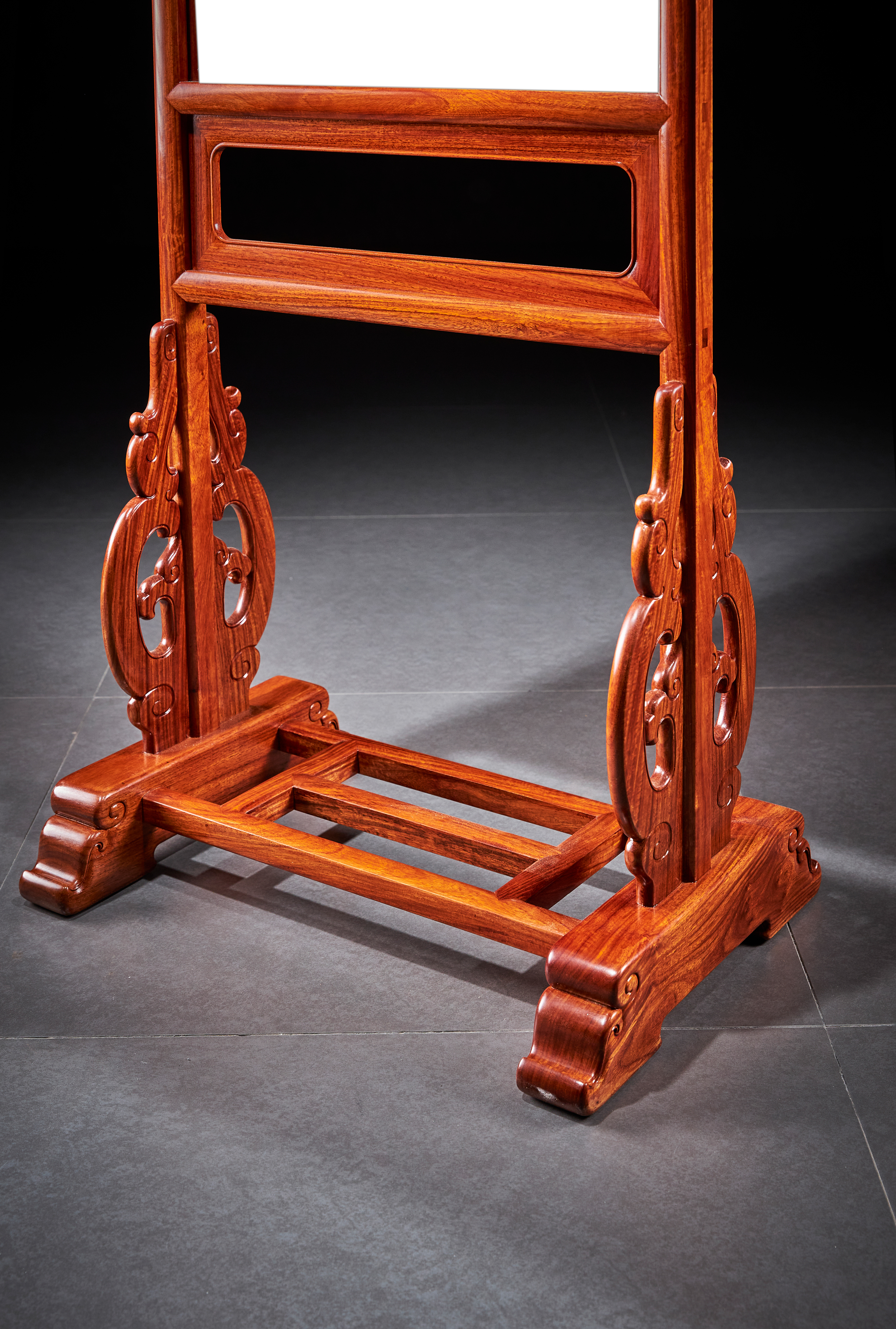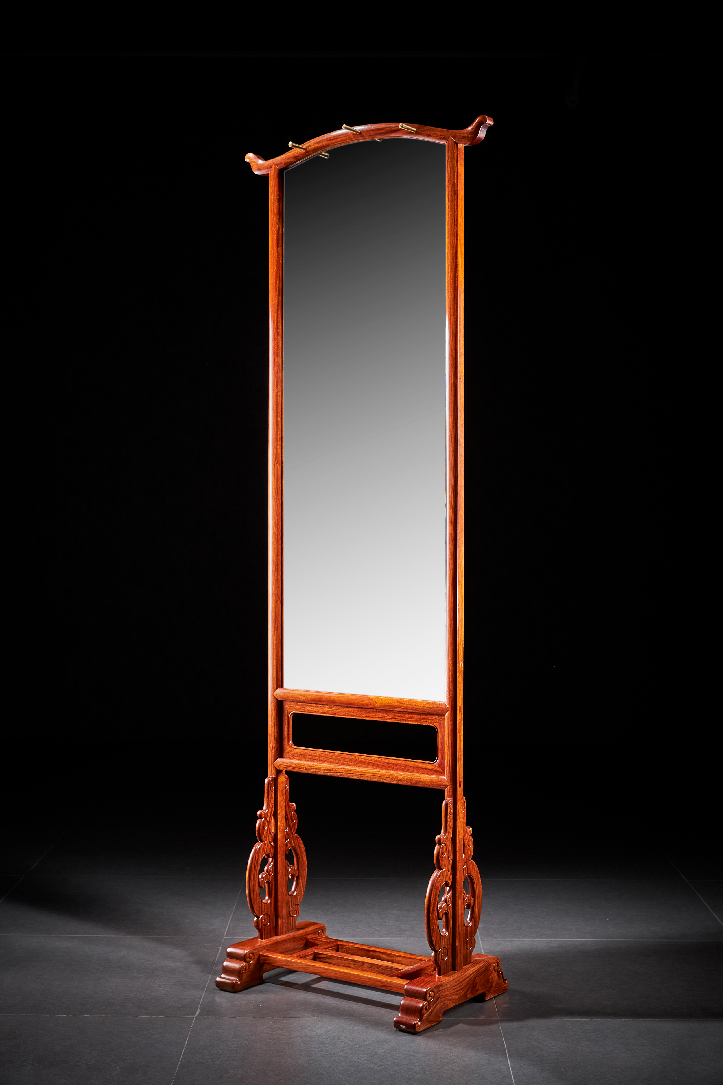 此试衣镜为座屏式,分为底座和镜屏两部分。上端横梁上镶嵌铜轴,可以悬挂衣物;作为屏心的镜子恰为穿衣镜,立于屋中亦可独立陈设。底部以宽厚木墩为底座,立柱由透雕拐子纹的站牙夹抵,两墩间设横竖枨子组成的屉板,可置放鞋履。这款是我们升级版的试衣镜,高度加高至1米77,底部用材更加厚实,重心更稳。此试衣镜比例高挑,陈设便利。