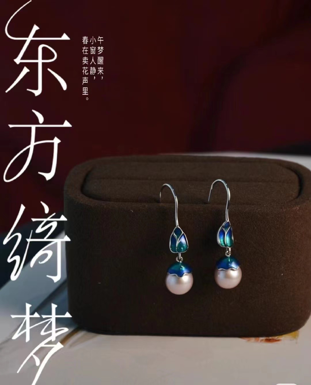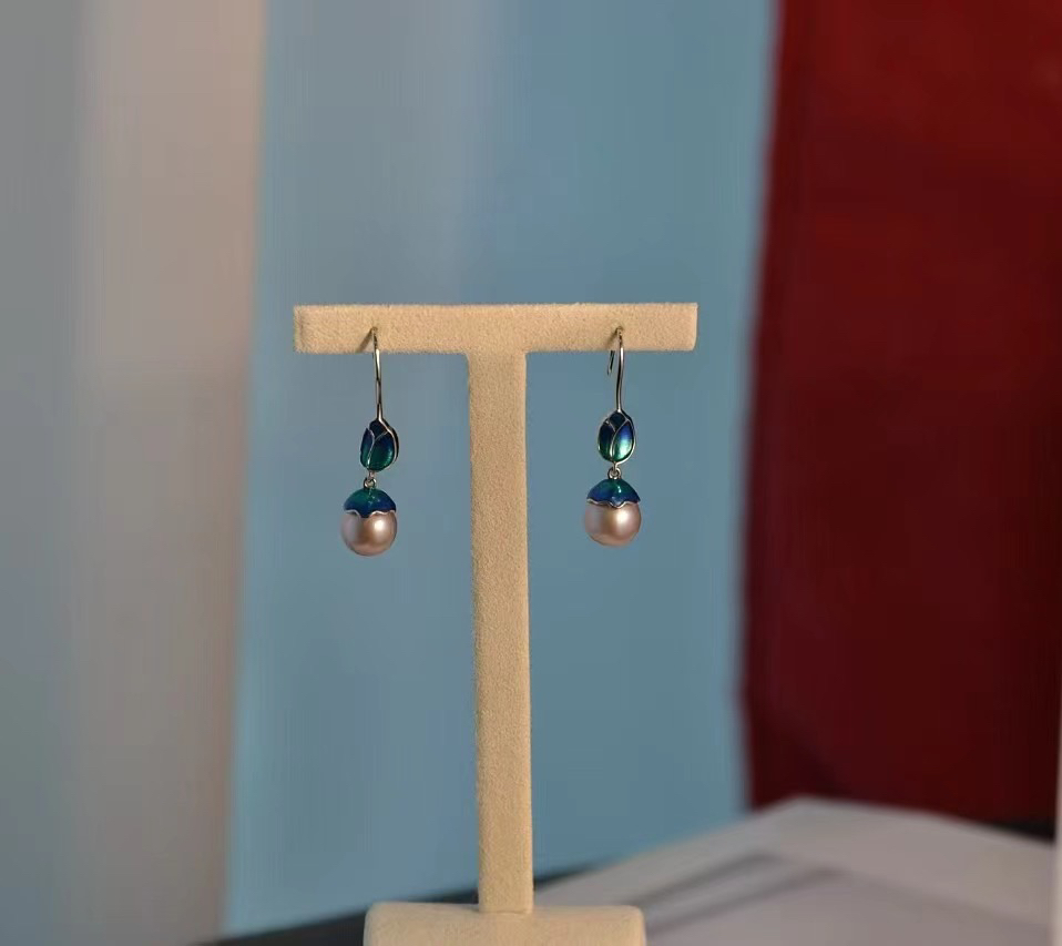 一对耳坠,新中式style,藕荷色紫色系耳坠,荷叶主题,约吗?正圆无暇强光天然紫色珍珠。