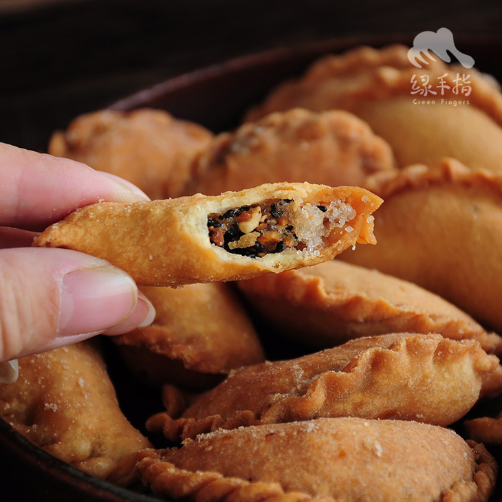 使用农场自制的猪油,生态面粉,生态鸡蛋制作的油角皮;花生、黑芝麻、有机白砂糖调制的馅料;使用有机大豆油控制在150度的油温炸制。