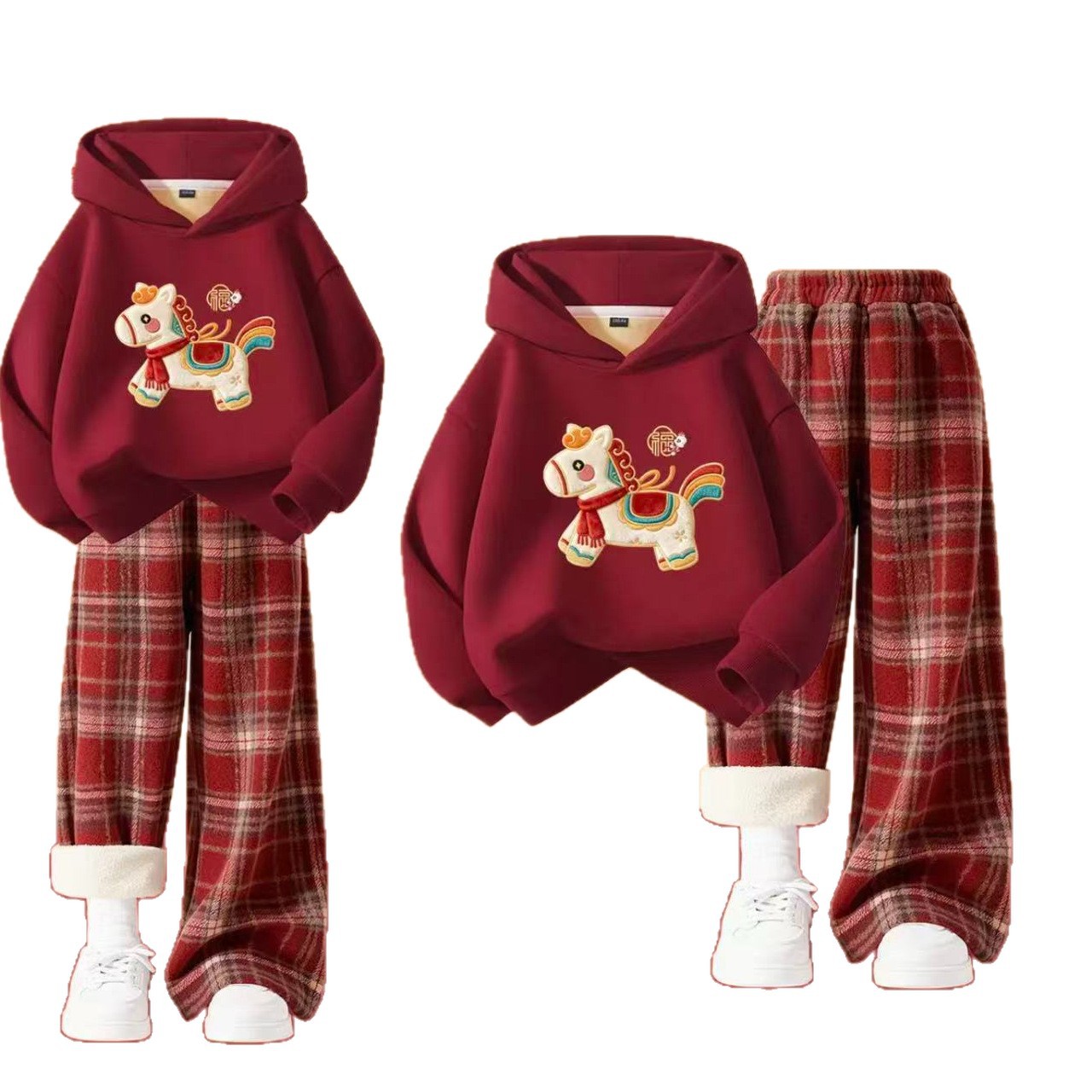 【红衣迎鸿运❗️小狗刺绣图案】男女童套装新款红色连帽上衣印花卡通休闲裤两件套加绒加厚秋冬款。jc
