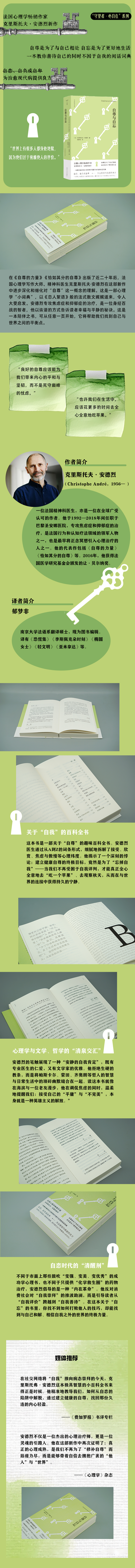 不同于市面上那些鼓吹“变强、变美、变优秀”的成功学心理书,也不同于只提供“化学救生圈”的药物治疗,安德烈倡导的是一种“内在革命”。他反对消费社会对“自我崇拜”的推波助澜,而是引导读者从“自我评价”跨越到“自我善待”。在这本关于“自忘”的书里,你找不到如何打败他人的技巧,却能找到与自己和解、并相信自我之外的世界的终极力量。