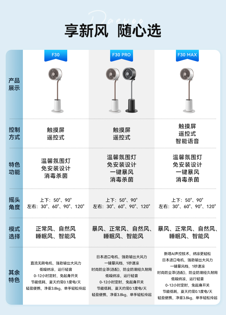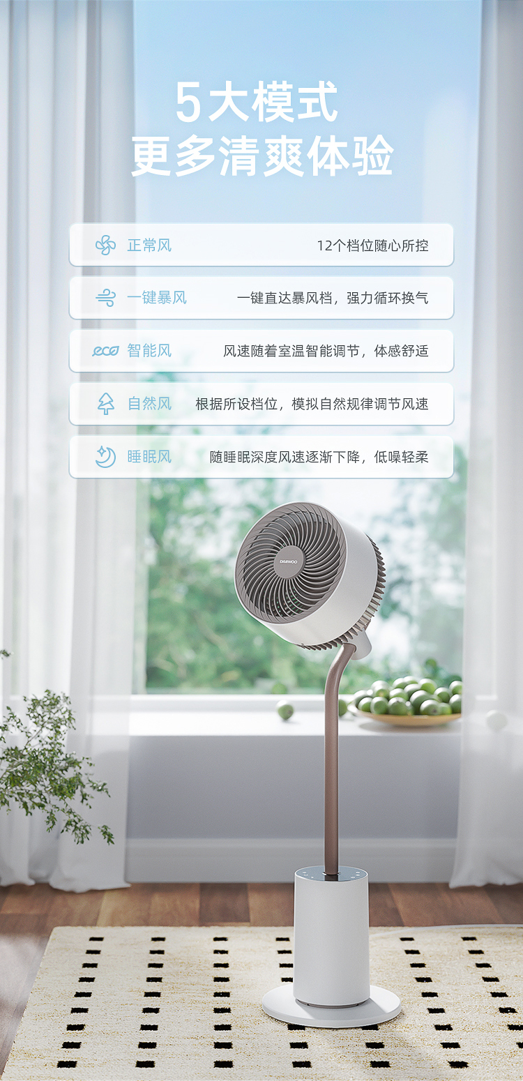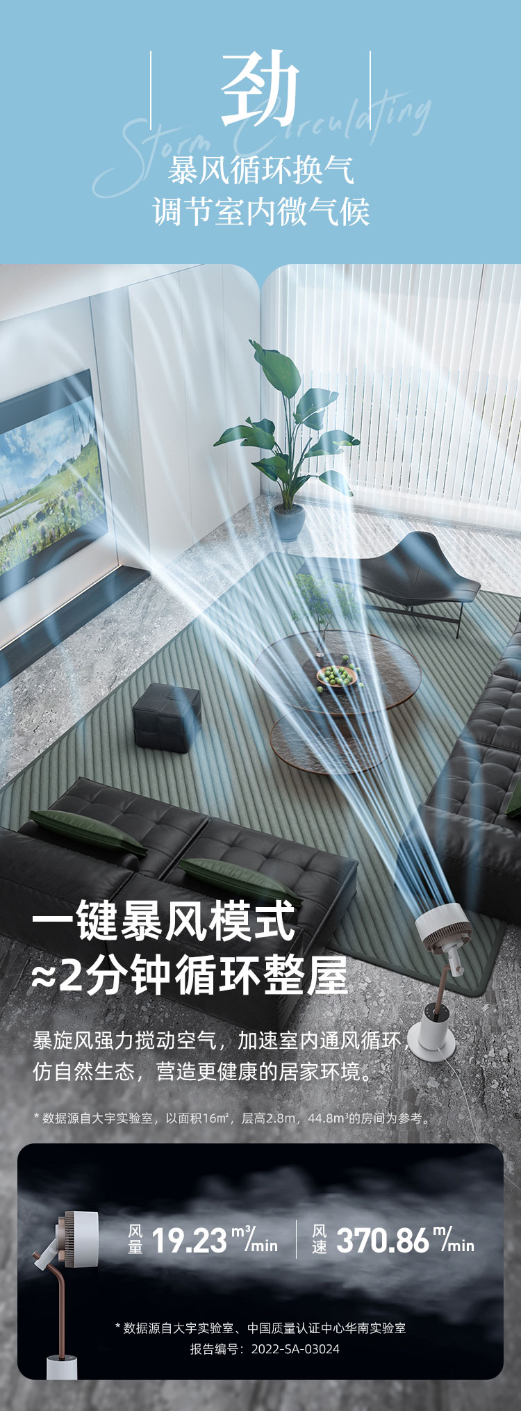 3、【一键暴风,全屋循环】:升级日本进口电机,输出强劲动力,新增一键暴风档,1秒速凉,3D广角,2分钟循环全屋!