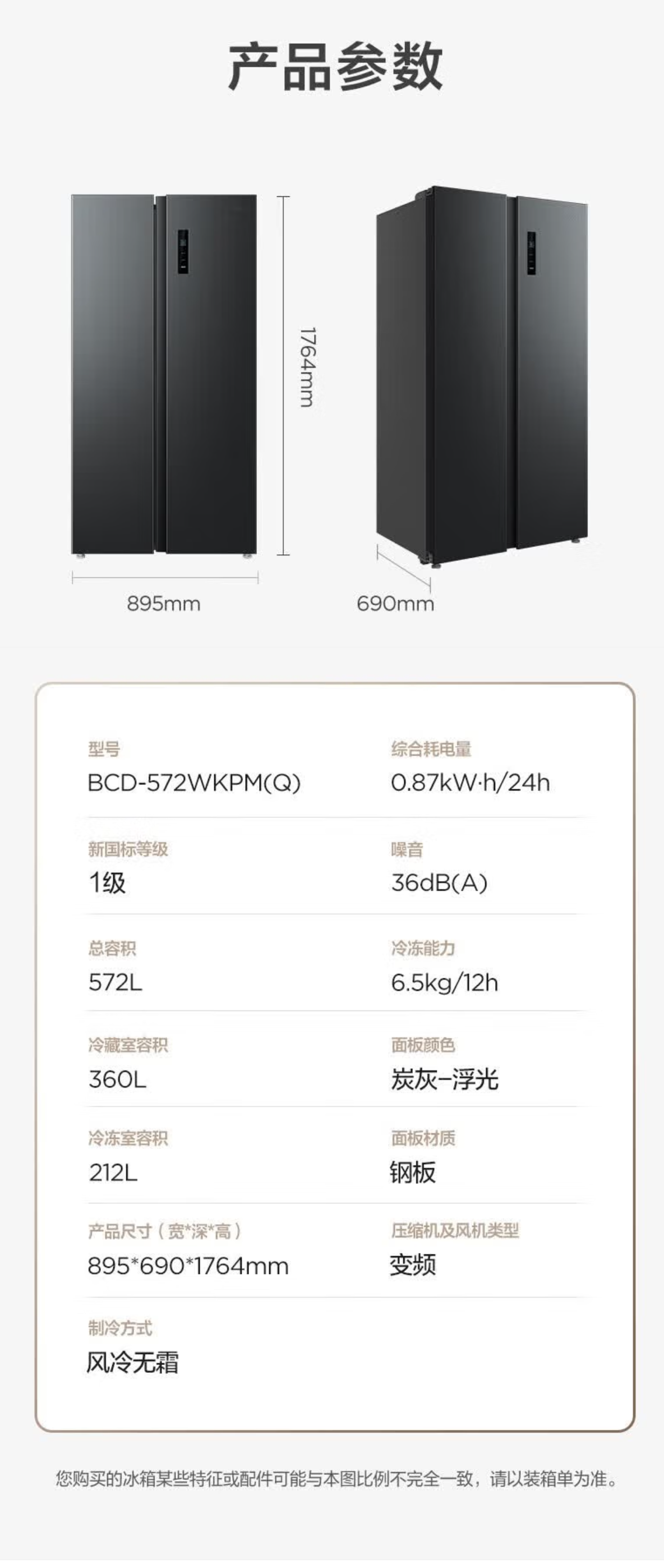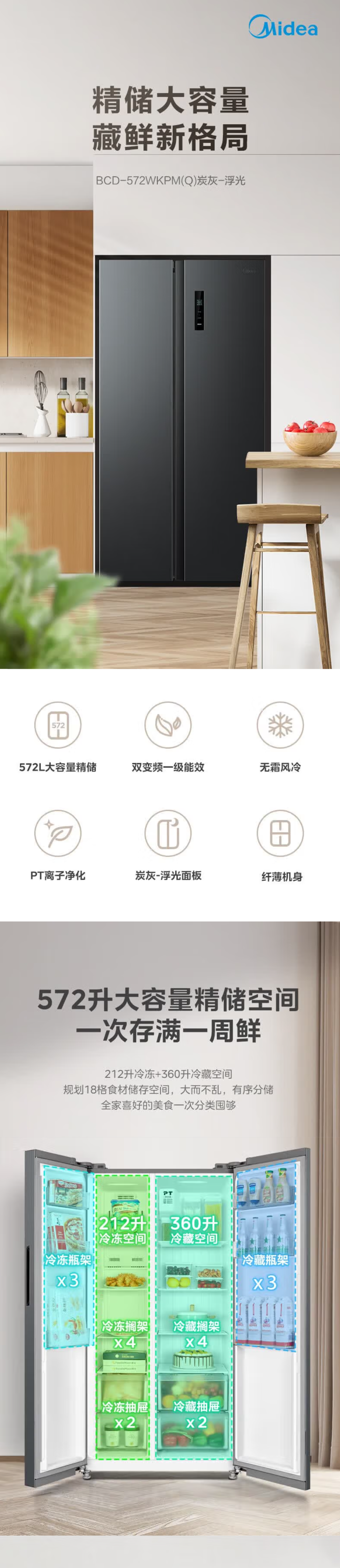 美的(Midea)对开门风冷无霜大容量净味保鲜一级能效双变频冰箱BCD-572WKPM(Q)炭灰-浮光